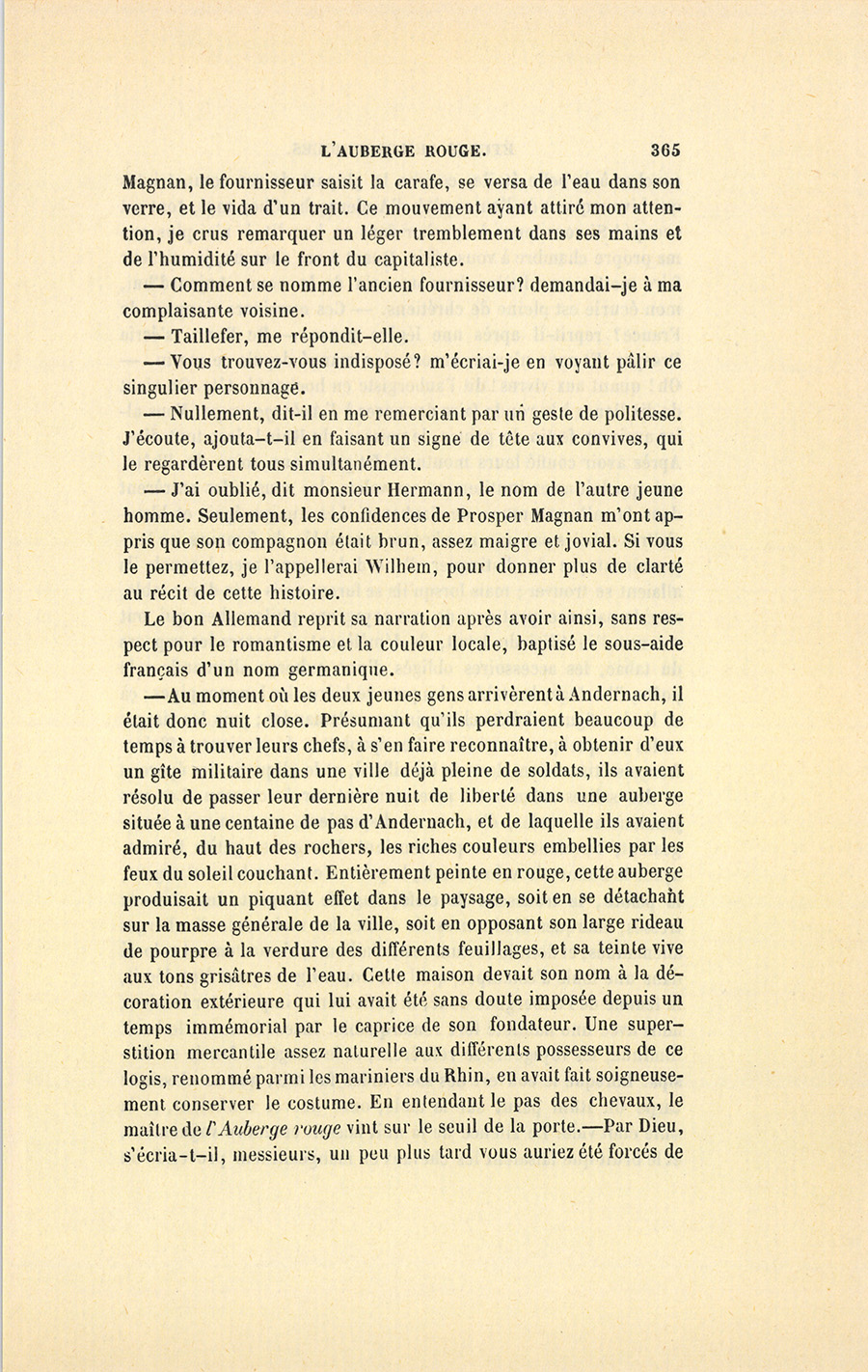 – Au moment où les deux jeunes gens arrivèrent à Andernach, il était donc nuit close. Présumant qu’ils perdraient beaucoup de temps à trouver leurs chefs, à s’en faire reconnaître, à obtenir d’eux un gîte militaire dans une ville déjà pleine de soldats, ils avaient résolu de passer leur dernière nuit de liberté dans une auberge située à une centaine de pas d’Andernach, et de laquelle ils avaient admiré, du haut des rochers, les riches couleurs embellies par les feux du soleil couchant. Entièrement peinte en rouge, cette auberge produisait un piquant effet dans le paysage, soit en se détachant sur la masse générale de la ville, soit en opposant son large rideau de pourpre à la verdure des différents feuillages, et sa teinte vive aux tons grisâtres de l’eau. Cette maison devait son nom à la décoration extérieure qui lui avait été sans doute imposée depuis un temps immémorial par le caprice de son fondateur. Une superstition mercantile assez naturelle aux différents possesseurs de ce logis, renommé parmi les mariniers du Rhin, en avait fait soigneusement conserver le costume. En entendant le pas des chevaux, le maître de l’Auberge rouge vint sur le seuil de la porte. – Par Dieu, s’écria-t-il, messieurs, un peu plus tard vous auriez été forcés de {p. 366} coucher à la belle étoile, comme la plupart de vos compatriotes qui bivouaquent de l’autre côté d’Andernach. Chez moi, tout est occupé ! Si vous tenez à coucher dans un bon lit, je n’ai plus que ma propre chambre à vous offrir. Quant à vos chevaux, je vais leur faire mettre une litière dans un coin de la cour. Aujourd’hui, mon écurie est pleine de chrétiens. – Ces messieurs viennent de France ? reprit-il après une légère pause. – De Bonn, s’écria Prosper. Et nous n’avons encore rien mangé depuis ce matin. – Oh ! quant aux vivres ! dit l’aubergiste en hochant la tête. On vient de dix lieues à la ronde faire des noces à l’Auberge rouge. Vous allez avoir un festin de prince, le poisson du Rhin ! c’est tout dire. Après avoir confié leurs montures fatiguées aux soins de l’hôte, qui appelait assez inutilement ses valets, les sous-aides entrèrent dans la salle commune de l’auberge. Les nuages épais et blanchâtres exhalés par une nombreuse assemblée de fumeurs ne leur permirent pas de distinguer d’abord les gens avec lesquels ils allaient se trouver ; mais lorsqu’ils se furent assis près d’une table, avec la patience pratique de ces voyageurs philosophes qui ont reconnu l’inutilité du bruit, ils démêlèrent, à travers les vapeurs du tabac, les accessoires obligés d’une auberge allemande : le poêle, l’horloge, les tables, les pots de bière, les longues pipes ; çà et là des figures hétéroclites, juives, allemandes ; puis les visages rudes de quelques mariniers. Les épaulettes de plusieurs officiers français étincelaient dans ce brouillard, et le cliquetis des éperons et des sabres retentissait incessamment sur le carreau. Les uns jouaient aux cartes, d’autres se disputaient, se taisaient, mangeaient, buvaient ou se promenaient. Une grosse petite femme, ayant le bonnet de velours noir, la pièce d’estomac bleu et argent, la pelote, le trousseau de clefs, l’agrafe d’argent, les cheveux tressés, marques distinctives de toutes les maîtresses d’auberges allemandes, et dont le costume est, d’ailleurs, si exactement colorié dans une foule d’estampes, qu’il est trop vulgaire pour être décrit, la femme de l’aubergiste donc, fit patienter et impatienter les deux amis avec une habileté fort remarquable. Insensiblement le bruit diminua, les voyageurs se retirèrent, et le nuage de fumée se dissipa. Lorsque le couvert des sous-aides fut mis, que la classique carpe du Rhin parut sur la table, onze heures sonnaient, et la salle était vide. Le silence de la nuit laissait entendre vaguement, et le bruit que faisaient les chevaux en mangeant leur provende ou {p. 367} en piaffant, et le murmure des eaux du Rhin, et ces espèces de rumeurs indéfinissables qui animent une auberge pleine quand chacun s’y couche. Les portes et les fenêtres s’ouvraient et se fermaient, des voix murmuraient de vagues paroles, et quelques interpellations retentissaient dans les chambres. En ce moment de silence et de tumulte, les deux Français, et l’hôte occupé à leur vanter Andernach, le repas, son vin du Rhin, l’armée républicaine et sa femme, écoutèrent avec une sorte d’intérêt les cris rauques de quelques mariniers et les bruissements d’un bateau qui abordait au port. L’aubergiste, familiarisé sans doute avec les interrogations gutturales de ces bateliers, sortit précipitamment, et revint bientôt. Il ramena un gros petit homme derrière lequel marchaient deux mariniers portant une lourde valise et quelques ballots. Ses paquets déposés dans la salle, le petit homme prit lui-même sa valise et la garda près de lui, en s’asseyant sans cérémonie à table devant les deux sous-aides. – Allez coucher à votre bateau, dit-il aux mariniers, puisque l’auberge est pleine. Tout bien considéré, cela vaudra mieux. – Monsieur, dit l’hôte au nouvel arrivé, voilà tout ce qui me reste de provisions. Et il montrait le souper servi aux deux Français. – Je n’ai pas une croûte de pain, pas un os. – Et de la choucroute ? – Pas de quoi mettre dans le dé de ma femme ! Comme j’ai eu l’honneur de vous le dire, vous ne pouvez avoir d’autre lit que la chaise sur laquelle vous êtes, et d’autre chambre que cette salle. À ces mots, le petit homme jeta sur l’hôte, sur la salle et sur les deux Français, un regard où la prudence et l’effroi se peignirent également.