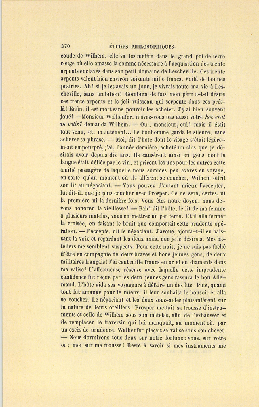– Ici je dois vous faire observer, dit monsieur Hermann en s’interrompant, que nous n’avons jamais su ni le véritable nom ni l’histoire de cet inconnu ; seulement, ses papiers ont appris qu’il venait d’Aix-la-Chapelle ; il avait pris le nom de Walhenfer, et possédait aux environs de Neuwied une manufacture d’épingles assez considérable. Comme tous les fabricants de ce pays, il portait une redingote de drap commun, une culotte et un gilet en velours vert foncé, des bottes et une large ceinture de cuir. Sa figure était toute ronde, ses manières franches et cordiales ; mais pendant cette soirée il lui fut très-difficile de déguiser entièrement des appréhensions secrètes ou peut-être de cruels soucis. L’opinion de l’aubergiste a toujours été que ce négociant allemand fuyait son pays. Plus tard, j’ai su que sa fabrique avait été brûlée par un de {p. 368} ces hasards malheureusement si fréquents en temps de guerre. Malgré son expression généralement soucieuse, sa physionomie annonçait une grande bonhomie. Il avait de beaux traits, et surtout un large cou dont la blancheur était si bien relevée par une cravate noire, que Wilhem le montra par raillerie à Prosper…