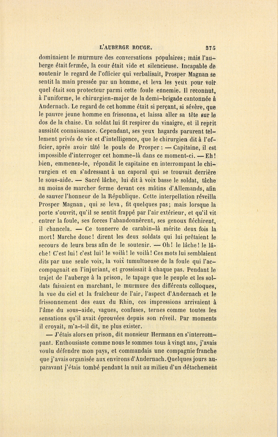 – L’instrument de chirurgie dont s’était servi l’assassin se trouvait sur la table avec la trousse, le portefeuille et les papiers de Prosper. Les regards de l’assemblée se dirigeaient alternativement sur ces pièces de conviction et sur le jeune homme, qui paraissait mourant, et dont les yeux éteints semblaient ne rien voir. La rumeur confuse qui se faisait entendre au dehors accusait la présence de la foule attirée devant l’auberge par la nouvelle du crime, et peut-être aussi par le désir de connaître l’assassin. Le pas des sentinelles placées sous les fenêtres de la salle, le bruit de leurs fusils {p. 375} dominaient le murmure des conversations populaires ; mais l’auberge était fermée, la cour était vide et silencieuse. Incapable de soutenir le regard de l’officier qui verbalisait, Prosper Magnan se sentit la main pressée par un homme, et leva les yeux pour voir quel était son protecteur parmi cette foule ennemie. Il reconnut, à l’uniforme, le chirurgien-major de la demi-brigade cantonnée à Andernach. Le regard de cet homme était si perçant, si sévère, que le pauvre jeune homme en frissonna, et laissa aller sa tête sur le dos de la chaise. Un soldat lui fit respirer du vinaigre, et il reprit aussitôt connaissance. Cependant, ses yeux hagards parurent tellement privés de vie et d’intelligence, que le chirurgien dit à l’officier, après avoir tâté le pouls de Prosper : – Capitaine, il est impossible d’interroger cet homme-là dans ce moment-ci. – Eh ! bien, emmenez-le, répondit le capitaine en interrompant le chirurgien et en s’adressant à un caporal qui se trouvait derrière le sous-aide. – Sacré lâche, lui dit à voix basse le soldat, tâche au moins de marcher ferme devant ces mâtins d’Allemands, afin de sauver l’honneur de la République. Cette interpellation réveilla Prosper Magnan, qui se leva, fit quelques pas ; mais lorsque la porte s’ouvrit, qu’il se sentit frappé par l’air extérieur, et qu’il vit entrer la foule, ses forces l’abandonnèrent, ses genoux fléchirent, il chancela. – Ce tonnerre de carabin-là mérite deux fois la mort ! Marche donc ! dirent les deux soldats qui lui prêtaient le secours de leurs bras afin de le soutenir. – Oh ! le lâche ! le lâche ! C’est lui ! c’est lui ! le voilà ! le voilà ! Ces mots lui semblaient dits par une seule voix, la voix tumultueuse de la foule qui l’accompagnait en l’injuriant, et grossissait à chaque pas. Pendant le trajet de l’auberge à la prison, le tapage que le peuple et les soldats faisaient en marchant, le murmure des différents colloques, la vue du ciel et la fraîcheur de l’air, l’aspect d’Andernach et le frissonnement des eaux du Rhin, ces impressions arrivaient à l’âme du sous-aide, vagues, confuses, ternes comme toutes les sensations qu’il avait éprouvées depuis son réveil. Par moments il croyait, m’a-t-il dit, ne plus exister.