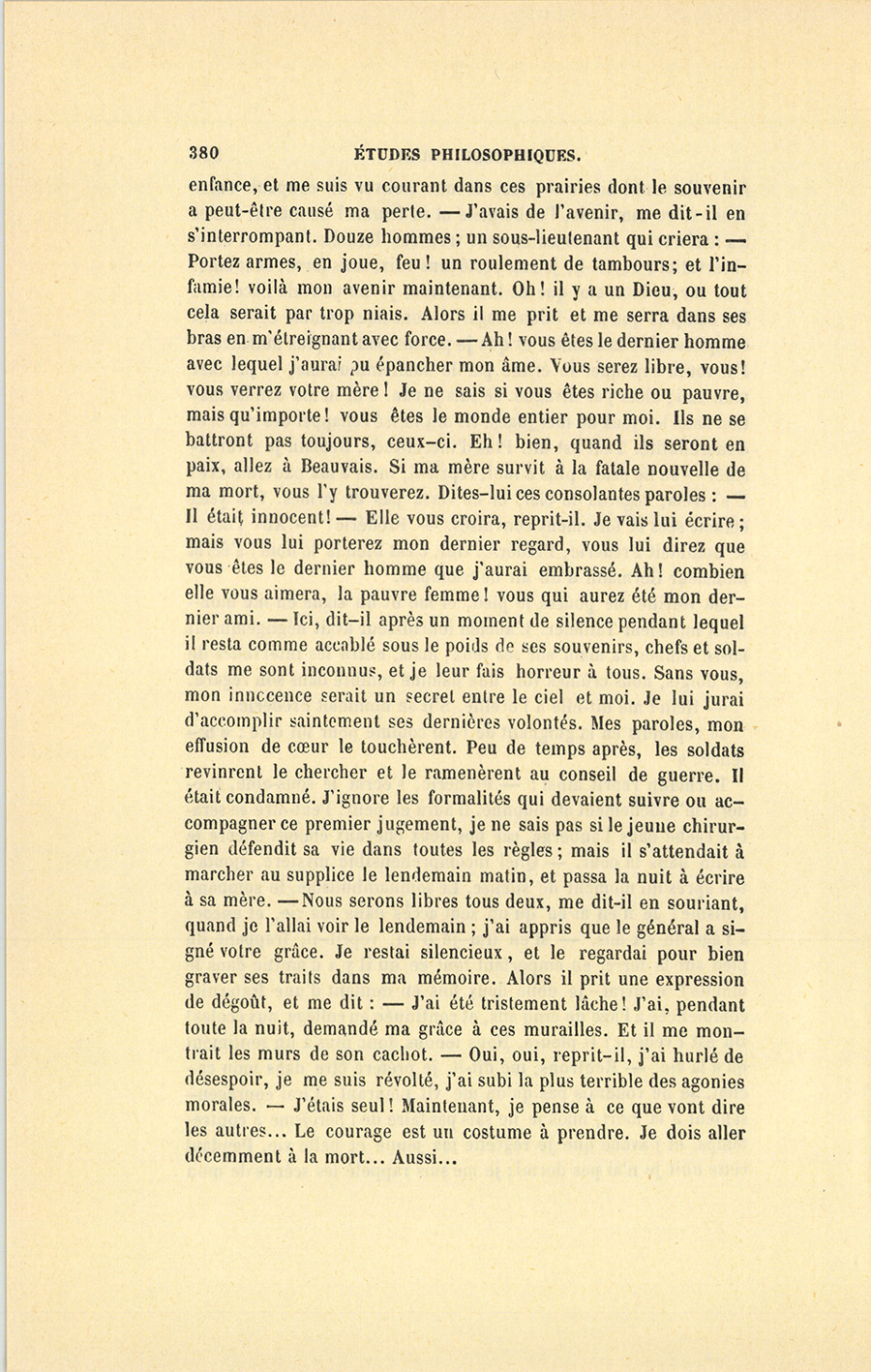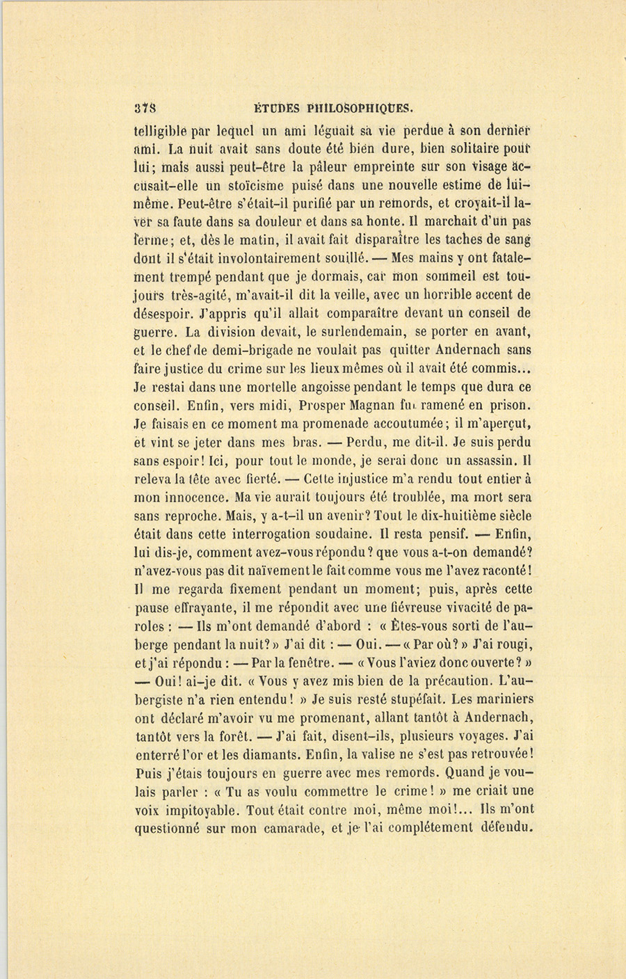 – À la paix d’Amiens, je vins en France pour apporter à la mère cette belle parole : – Il était innocent. J’avais religieusement entrepris ce pèlerinage. Mais madame Magnan était morte de consomption. Ce ne fut pas sans une émotion profonde que je brûlai la lettre dont j’étais porteur. Vous vous moquerez peut-être de mon exaltation germanique, mais je vis un drame de mélancolie sublime dans le secret éternel qui allait ensevelir ces adieux jetés entre deux tombes, ignorés de toute la création, comme un cri poussé au milieu du désert par le voyageur que surprend un lion.