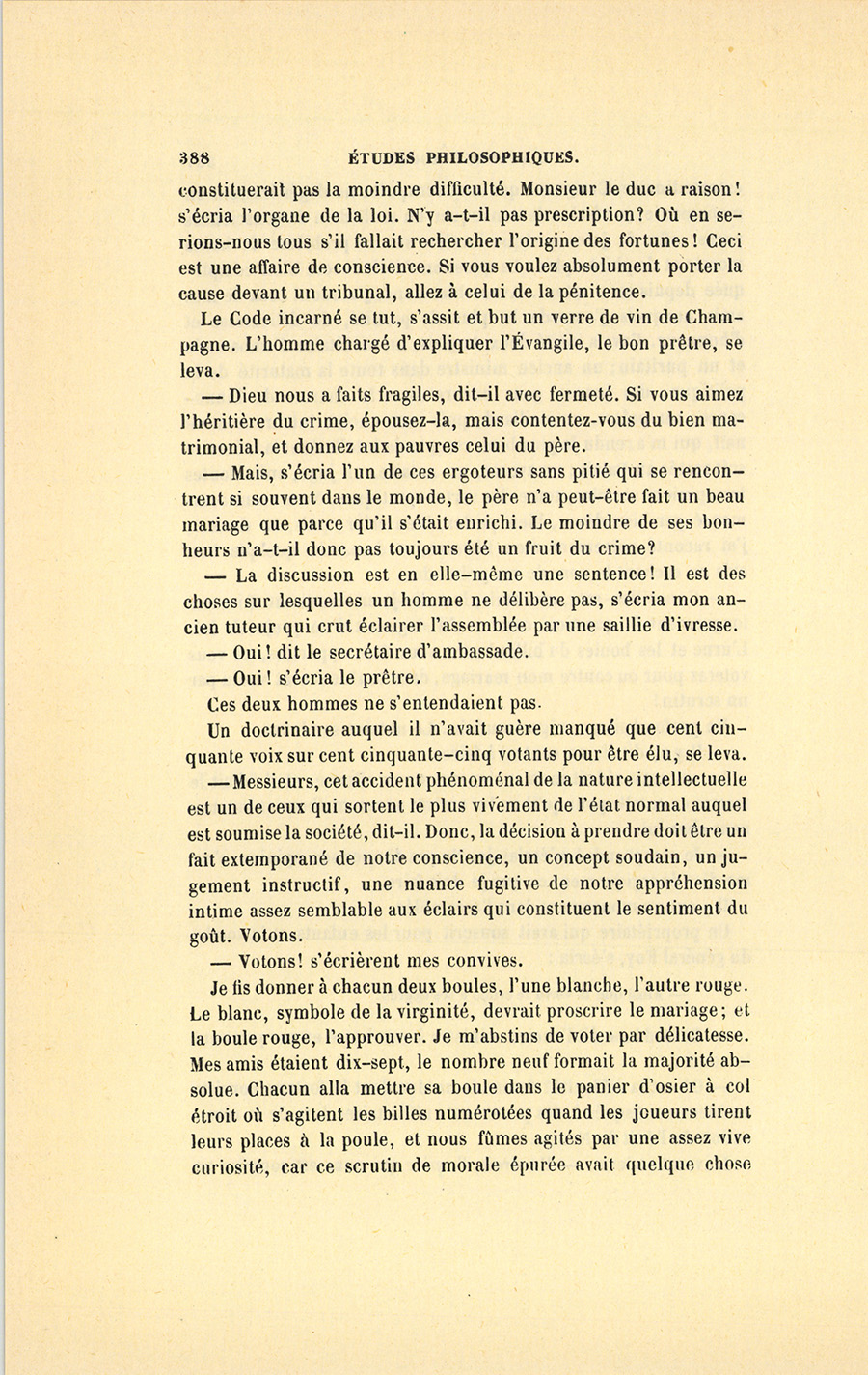 Ce dîner, cette soirée, exercèrent une cruelle influence sur ma vie et sur mes sentiments. J’aimai mademoiselle Taillefer, précisément peut-être parce que l’honneur et la délicatesse m’interdisaient de m’allier à un assassin, quelque bon père et bon époux qu’il pût être. Une incroyable fatalité m’entraînait à me faire présenter dans les maisons où je savais pouvoir rencontrer Victorine. Souvent, après m’être donné à moi-même ma parole d’honneur de renoncer à la voir, le soir même je me trouvais près d’elle. Mes plaisirs étaient immenses. Mon légitime amour, plein de remords chimériques, avait la couleur d’une passion criminelle. Je me méprisais de saluer Taillefer, quand par hasard il était avec sa fille ; mais je le saluais ! Enfin, par malheur, Victorine n’est pas seulement une jolie personne ; de plus elle est instruite, remplie de talents, de grâces, sans la moindre pédanterie, sans la plus légère teinte de prétention. Elle cause avec réserve ; et son caractère a des grâces mélancoliques auxquelles personne ne sait résister ; elle m’aime, ou du moins elle me le laisse croire ; elle a un certain sourire qu’elle ne trouve que pour moi ; et pour moi, sa voix s’adoucit encore. Oh ! elle m’aime ! mais elle adore son père, mais elle m’en vante la bonté, la douceur, les qualités exquises. Ces éloges sont autant de coups de poignard qu’elle me donne dans le cœur. Un jour, je me suis trouvé presque complice du crime sur lequel repose l’opulence de la famille Taillefer : j’ai voulu demander la main de Victorine. Alors j’ai fui, j’ai voyagé, je suis allé en Allemagne, à Andernach. Mais je suis revenu. J’ai retrouvé Victorine pâle, elle avait maigri ! si je l’avais revue bien portante, gaie, j’étais sauvé ! Ma passion s’est rallumée avec une violence {p. 387} extraordinaire. Craignant que mes scrupules ne dégénérassent en monomanie, je résolus de convoquer un sanhédrin de consciences pures, afin de jeter quelque lumière sur ce problème de haute morale et de philosophie. La question s’était encore bien compliquée depuis mon retour. Avant-hier donc, j’ai réuni ceux de mes amis auxquels j’accorde le plus de probité, de délicatesse et d’honneur. J’avais invité deux Anglais, un secrétaire d’ambassade et un puritain ; un ancien ministre dans toute la maturité de la politique ; des jeunes gens encore sous le charme de l’innocence ; un prêtre, un vieillard ; puis mon ancien tuteur, homme naïf, qui m’a rendu le plus beau compte de tutelle dont la mémoire soit restée au Palais ; un avocat, un notaire, un juge, enfin toutes les opinions sociales, toutes les vertus pratiques. Nous avons commencé par bien dîner, bien parler, bien crier ; puis, au dessert, j’ai raconté naïvement mon histoire, et demandé quelque bon avis en cachant le nom de ma prétendue.