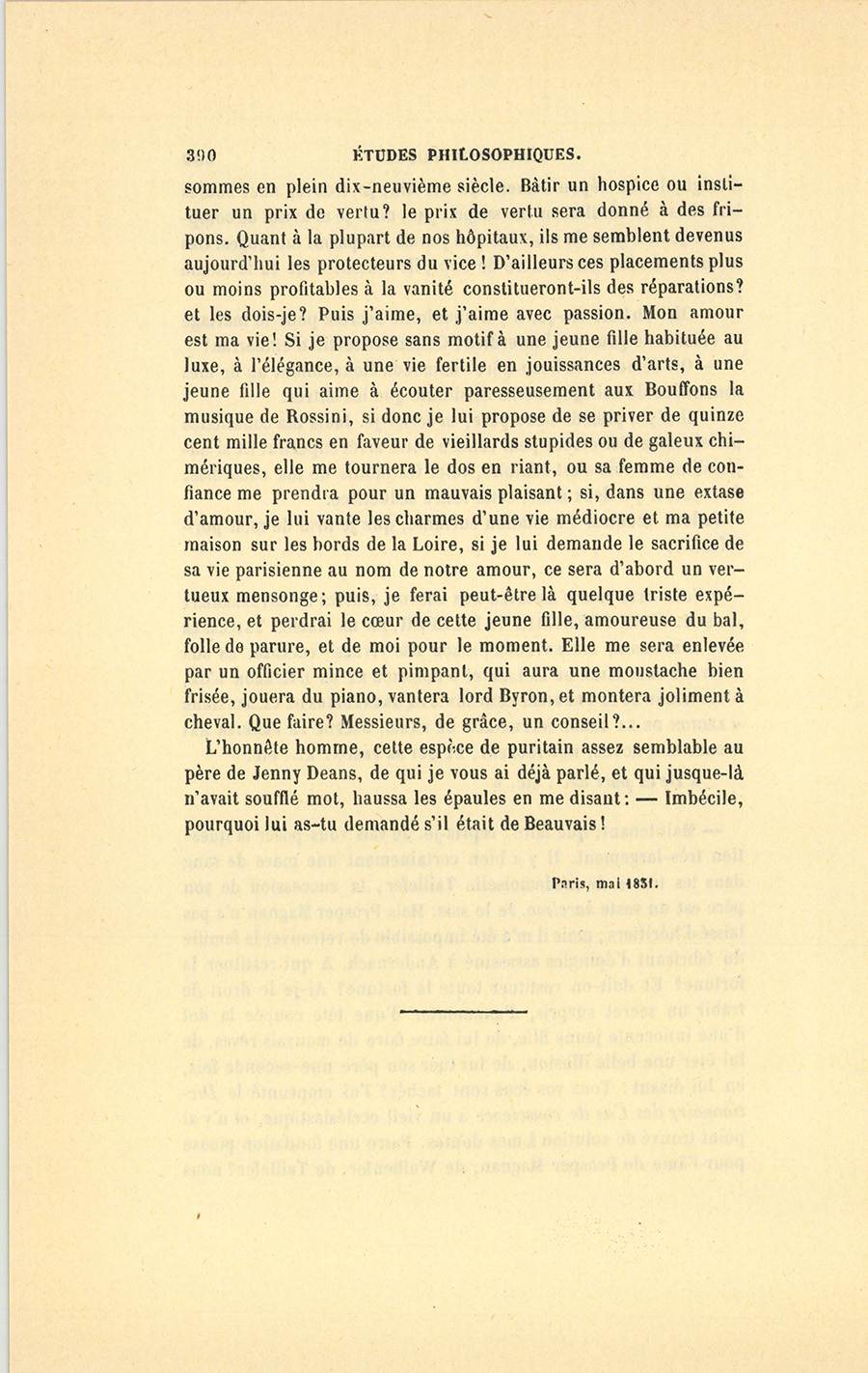 – Donc, paix aux scélérats, guerre aux malheureux, et déifions l’or ! Mais, laissons cela, ajoutai-je en riant. Regardez, je vous {p. 384} prie, la jeune personne qui entre en ce moment dans le salon.