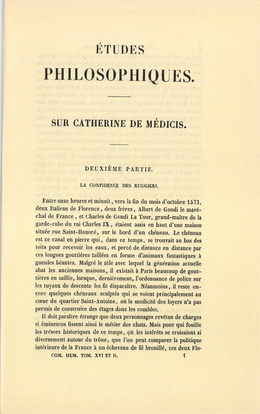 Avant d’entreprendre d’écrire l’histoire des mœurs en action, l’auteur de cette Étude avait patiemment et minutieusement étudié les principaux règnes de l’histoire de France, la querelle des Bourguignons et des Armagnacs, celle des Guise et des Valois, qui, chacune, tiennent un siècle. Son intention fut d’écrire une histoire de France pittoresque. Isabelle de Bavière, Catherine et Marie de Médicis, ces trois femmes y tiennent une place énorme, dominent du quatorzième au dix-septième siècle, et aboutissent à Louis XIV. De ces trois reines, Catherine est la plus intéressante et la plus belle. Ce fut une domination virile que ne déshonorèrent ni les amours terribles d’Isabelle, ni les plus terribles encore, quoique moins connues, de Marie de Médicis. Isabelle appela les Anglais en France contre son fils, aima le duc d’Orléans, son beau-frère, et {p. 478} Boisbourdon. Le compte de Marie de Médicis est encore plus lourd. Ni l’une ni l’autre, elles n’eurent de génie politique. Dans ces études et dans ces parallèles, l’auteur acquit la conviction de la grandeur de Catherine : en s’initiant aux difficultés renaissantes de sa position, il reconnut combien les historiens, influencés tous par les protestants, avaient été injustes pour cette reine ; et il lui en est resté les trois esquisses que voici, où sont combattues quelques opinions erronées sur elle, sur les personnages qui l’entouraient et sur les choses de son temps. Si ce travail se trouve parmi les Études philosophiques, c’est qu’il montre l’esprit d’un temps et qu’on y voit clairement l’influence de la pensée. Mais avant d’entrer dans l’arène politique où Catherine se voit aux prises avec les deux grandes difficultés de sa carrière, il est nécessaire de présenter un précis de sa vie antérieure, fait au point de vue d’une critique impartiale, afin qu’on embrasse le cours presque entier de cette vaste et royale existence, jusqu’au moment où commence la première partie de cette Étude.