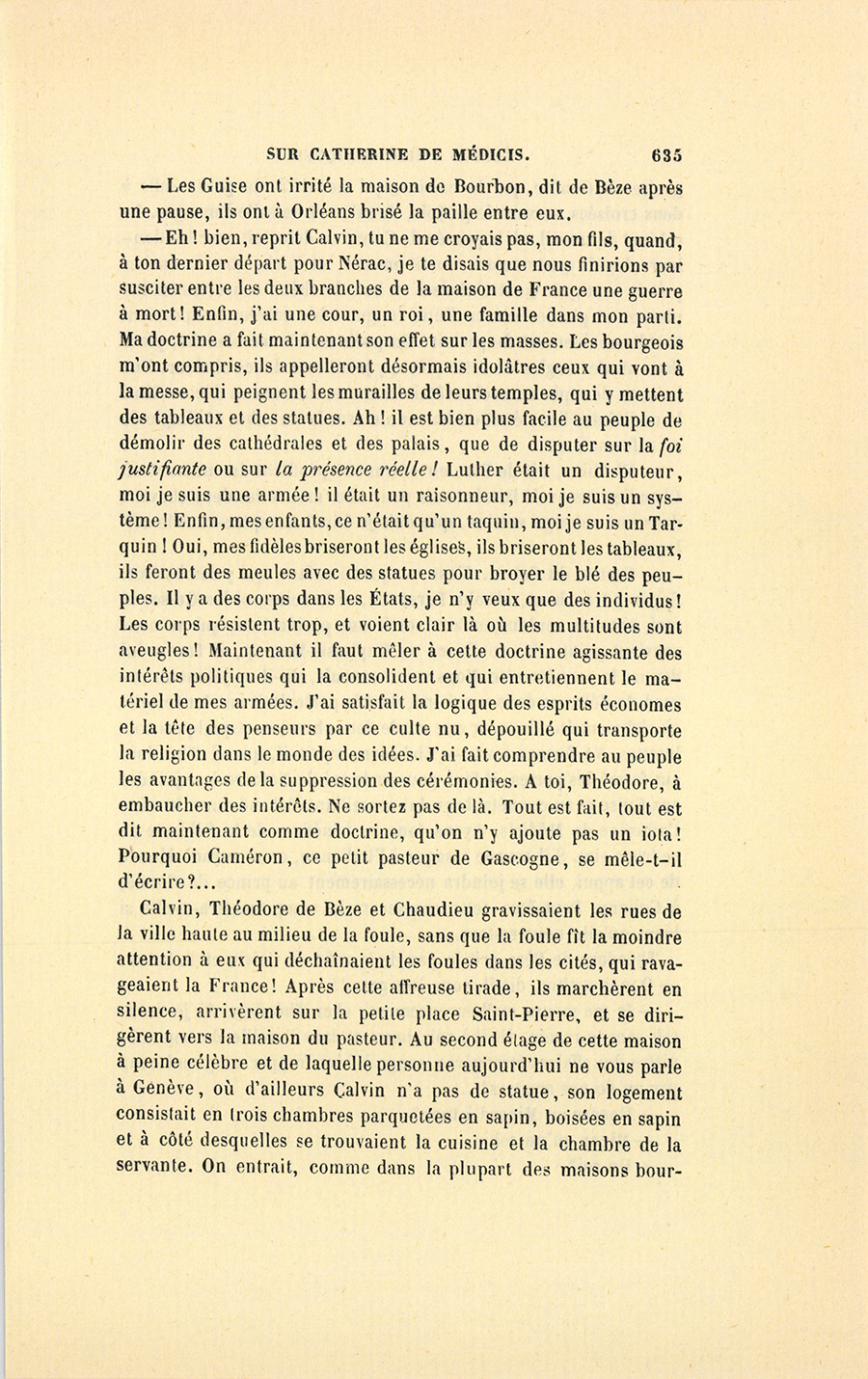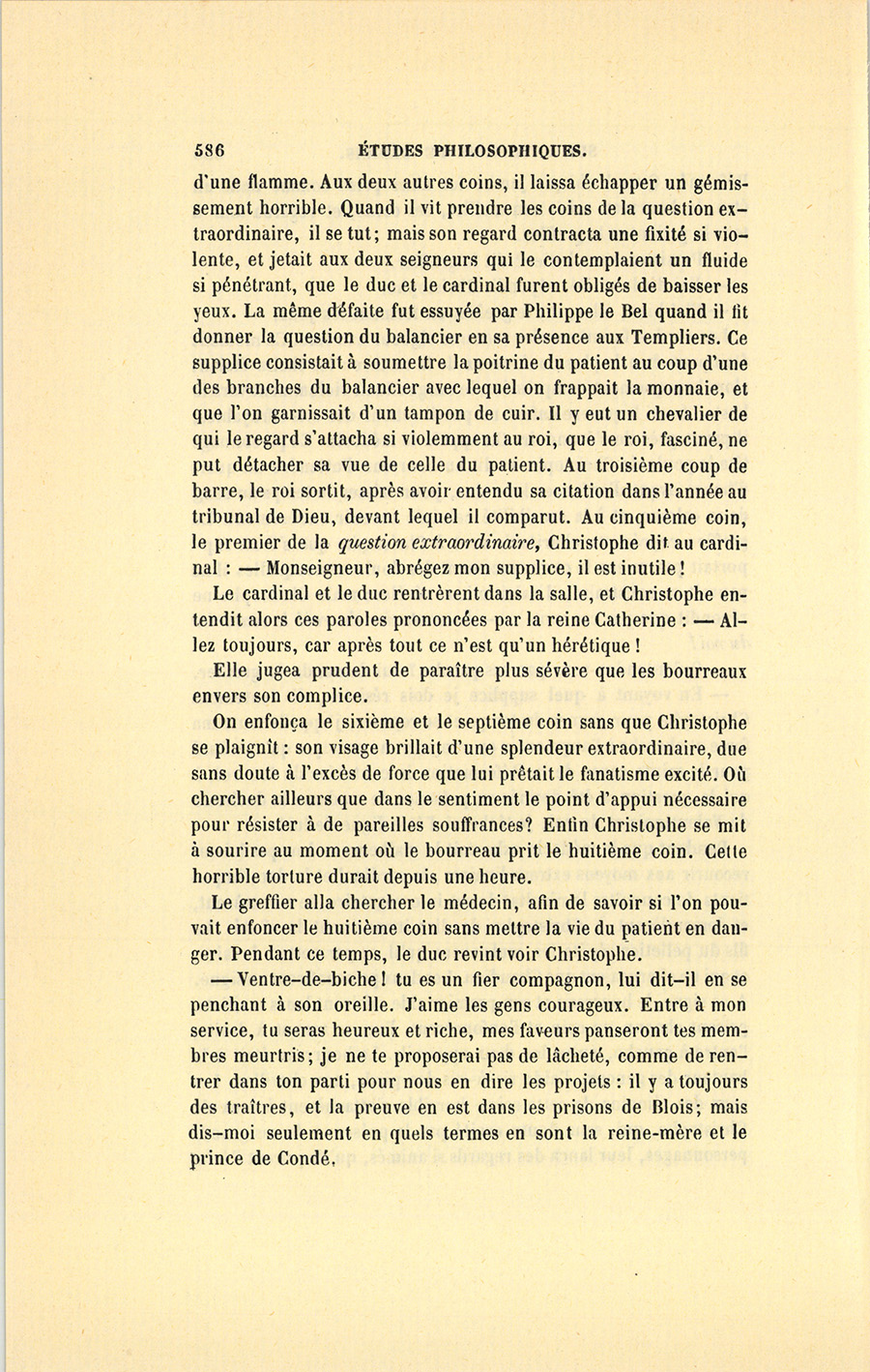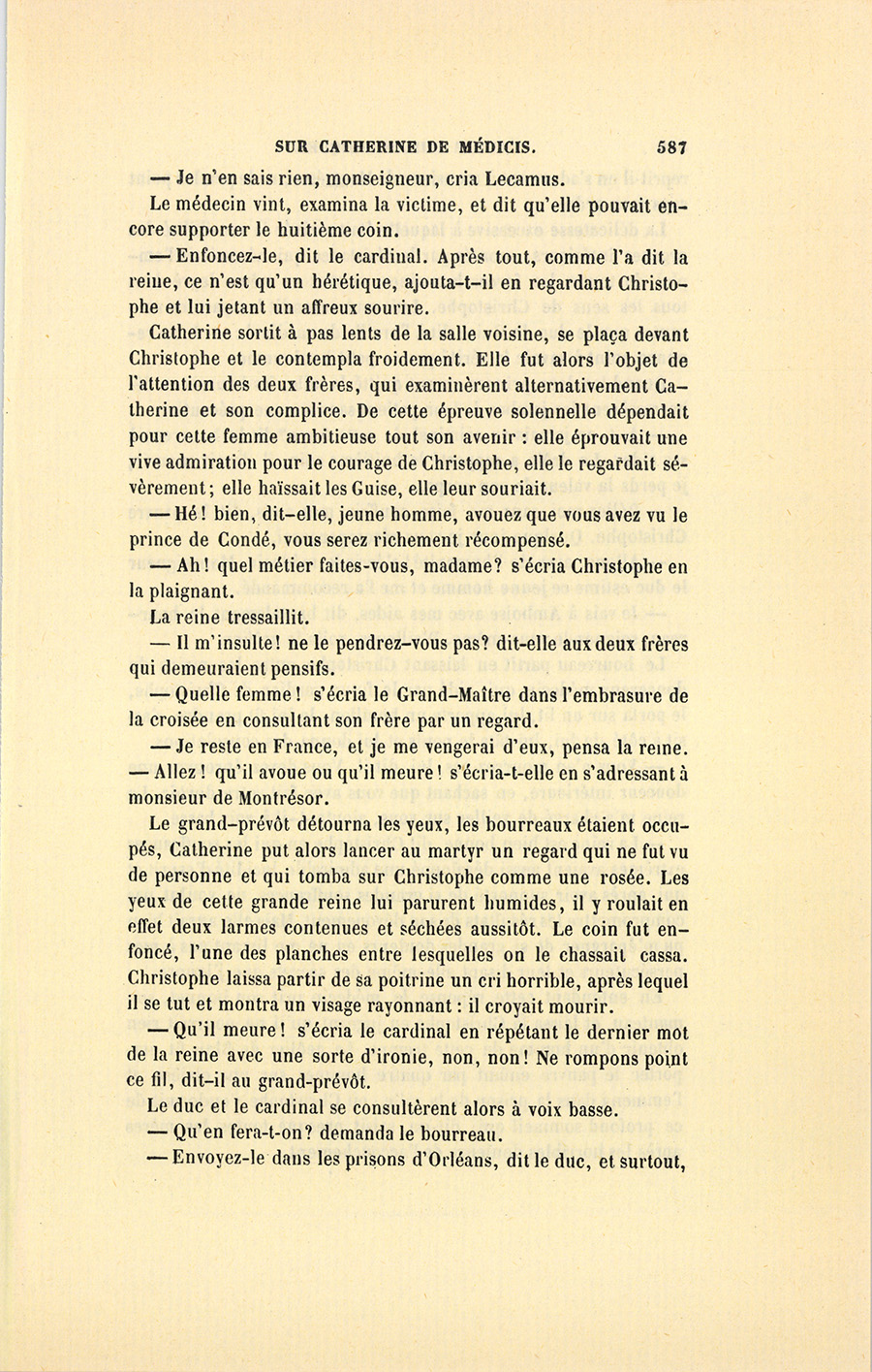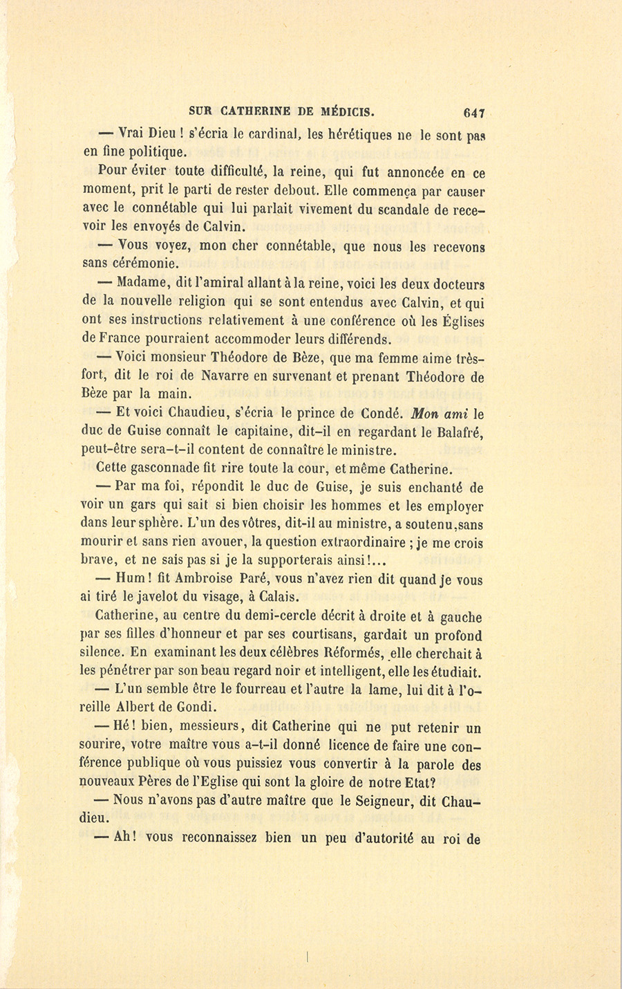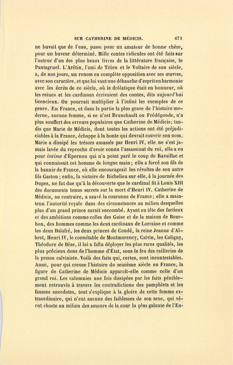 Pourquoi refuser de nos jours à la majestueuse adversaire de la plus inféconde des hérésies la grandeur qu’elle a tirée de sa lutte même ? Les Calvinistes ont beaucoup écrit contre le Stratagème de {p. 474} Charles IX ; mais parcourez la France ? en reconnaissant les ruines de tant de belles églises abattues, en mesurant les énormes blessures faites par les Religionnaires au corps social, en apprenant combien de revanches ils ont prises, en déplorant les malheurs de l’individualisme, la plaie de la France actuelle et dont le germe était dans les questions de liberté de conscience agitées par eux, vous vous demanderez de quel côté sont les bourreaux ? Il y a, comme le dit Catherine dans la troisième partie de cette Étude, « malheureusement à toutes les époques des écrivains hypocrites prêts à pleurer deux cents coquins tués à propos. » César, qui tâchait d’apitoyer le sénat sur le parti de Catilina, eût peut-être vaincu Cicéron, s’il avait eu des journaux et une Opposition à ses ordres.