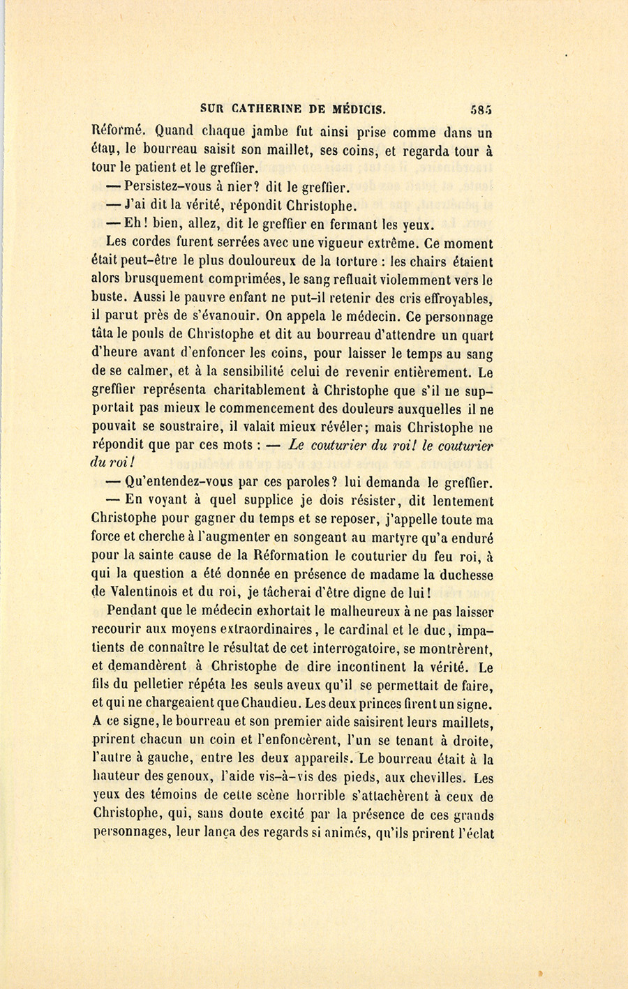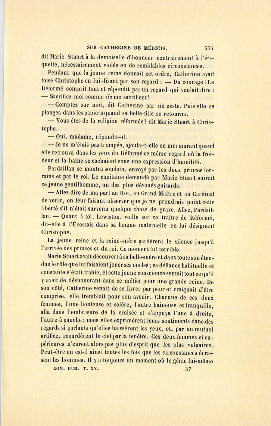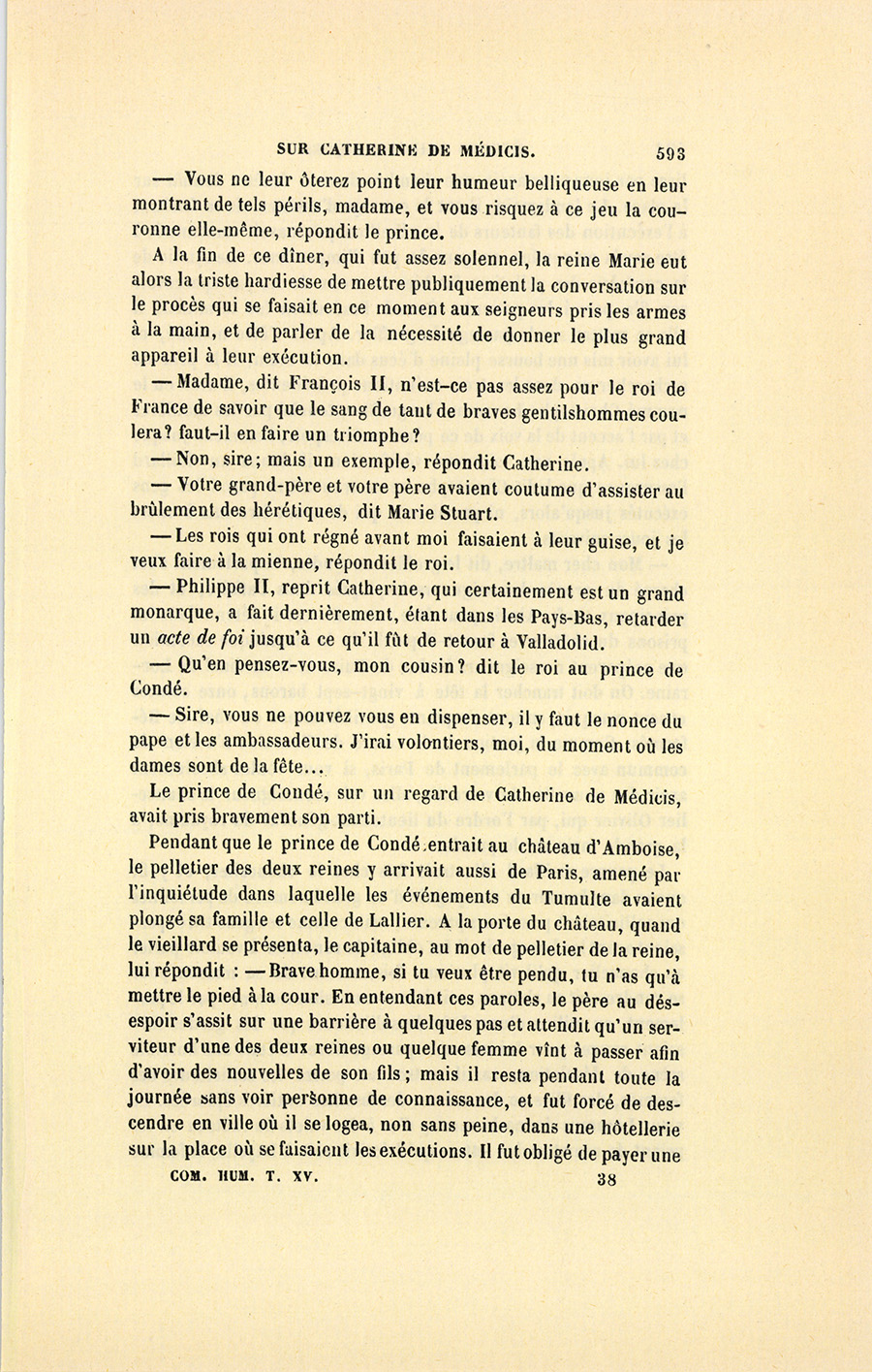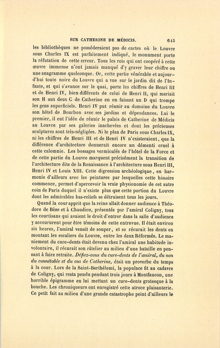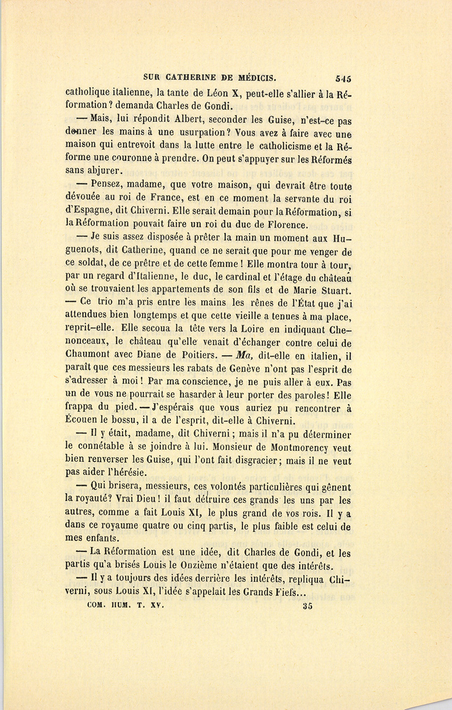 Pourquoi refuser de nos jours à la majestueuse adversaire de la plus inféconde des hérésies la grandeur qu’elle a tirée de sa lutte même ? Les Calvinistes ont beaucoup écrit contre le Stratagème de {p. 474} Charles IX ; mais parcourez la France ? en reconnaissant les ruines de tant de belles églises abattues, en mesurant les énormes blessures faites par les Religionnaires au corps social, en apprenant combien de revanches ils ont prises, en déplorant les malheurs de l’individualisme, la plaie de la France actuelle et dont le germe était dans les questions de liberté de conscience agitées par eux, vous vous demanderez de quel côté sont les bourreaux ? Il y a, comme le dit Catherine dans la troisième partie de cette Étude, « malheureusement à toutes les époques des écrivains hypocrites prêts à pleurer deux cents coquins tués à propos. » César, qui tâchait d’apitoyer le sénat sur le parti de Catilina, eût peut-être vaincu Cicéron, s’il avait eu des journaux et une Opposition à ses ordres.
