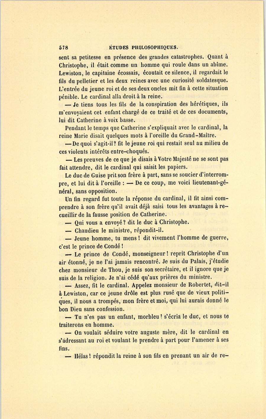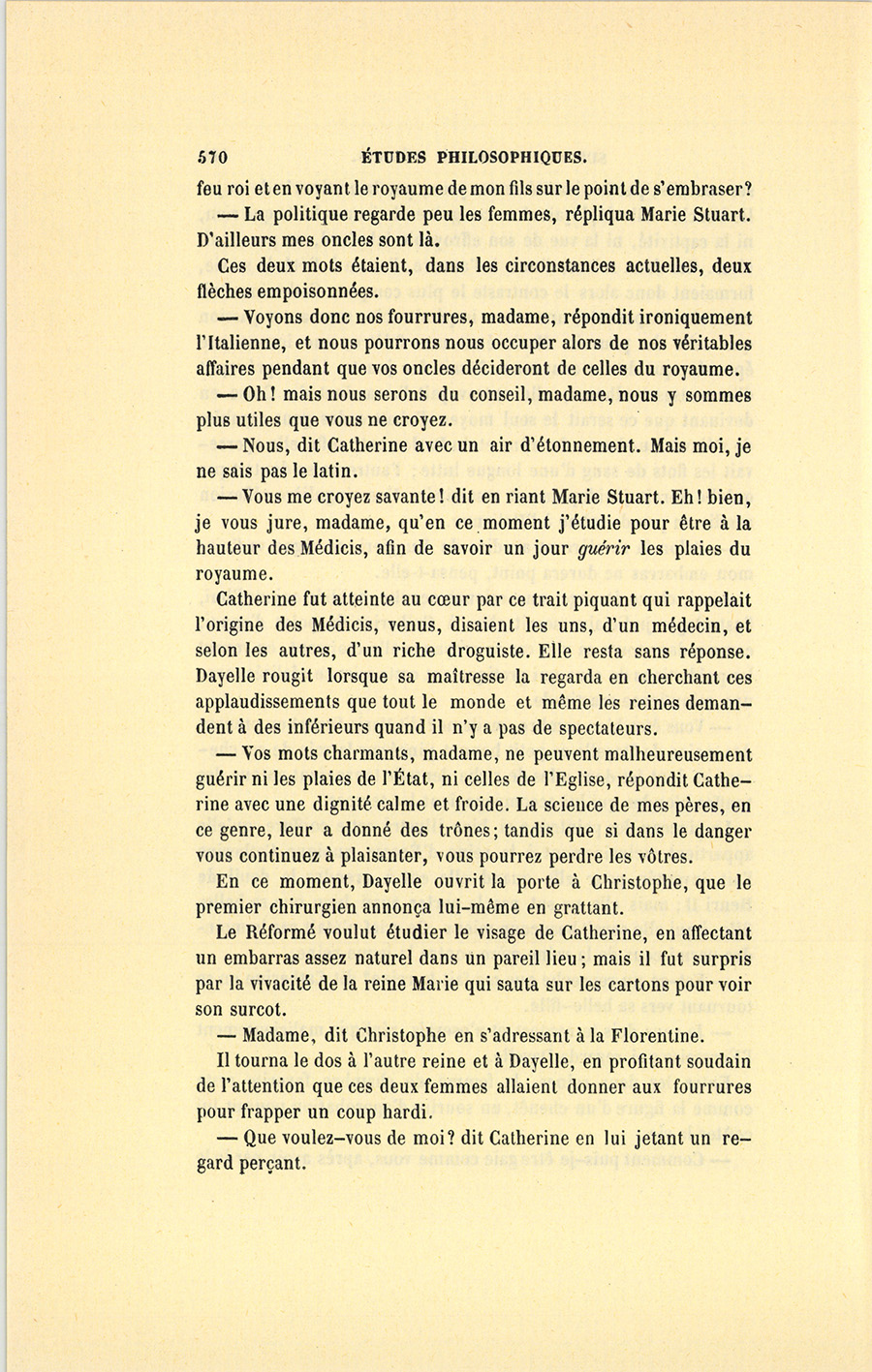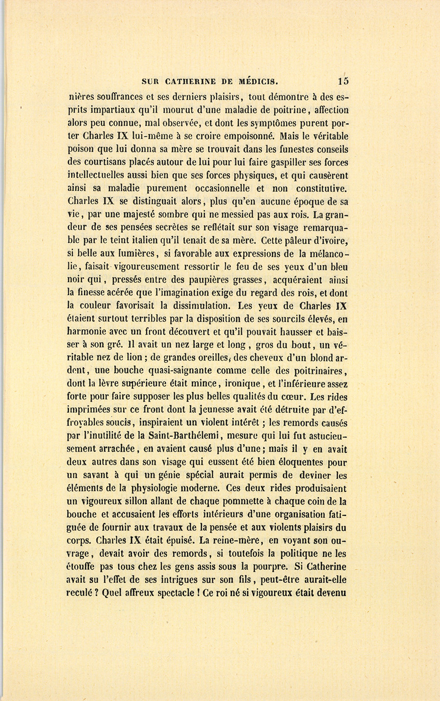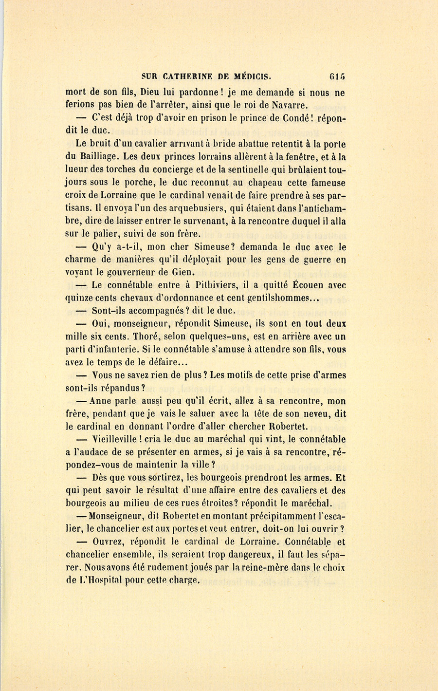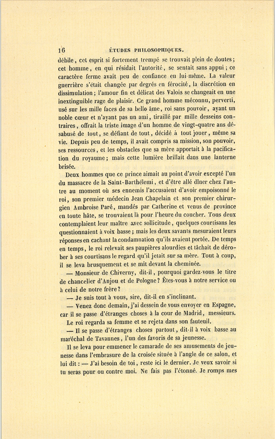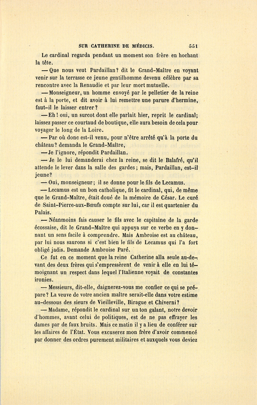 Pourquoi refuser de nos jours à la majestueuse adversaire de la plus inféconde des hérésies la grandeur qu’elle a tirée de sa lutte même ? Les Calvinistes ont beaucoup écrit contre le Stratagème de {p. 474} Charles IX ; mais parcourez la France ? en reconnaissant les ruines de tant de belles églises abattues, en mesurant les énormes blessures faites par les Religionnaires au corps social, en apprenant combien de revanches ils ont prises, en déplorant les malheurs de l’individualisme, la plaie de la France actuelle et dont le germe était dans les questions de liberté de conscience agitées par eux, vous vous demanderez de quel côté sont les bourreaux ? Il y a, comme le dit Catherine dans la troisième partie de cette Étude, « malheureusement à toutes les époques des écrivains hypocrites prêts à pleurer deux cents coquins tués à propos. » César, qui tâchait d’apitoyer le sénat sur le parti de Catilina, eût peut-être vaincu Cicéron, s’il avait eu des journaux et une Opposition à ses ordres.