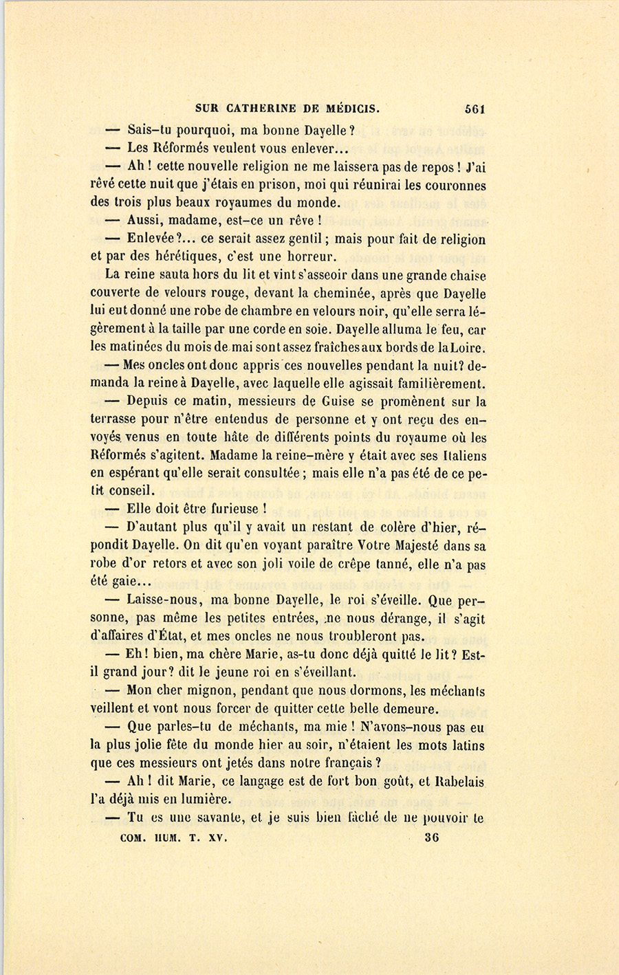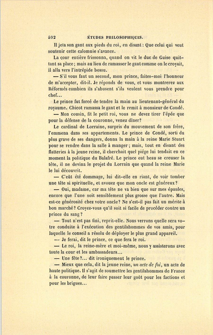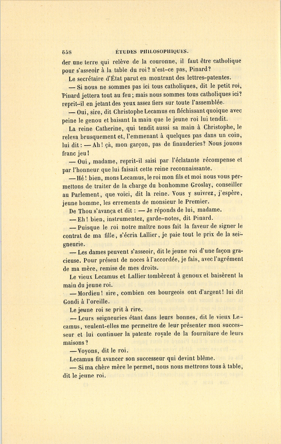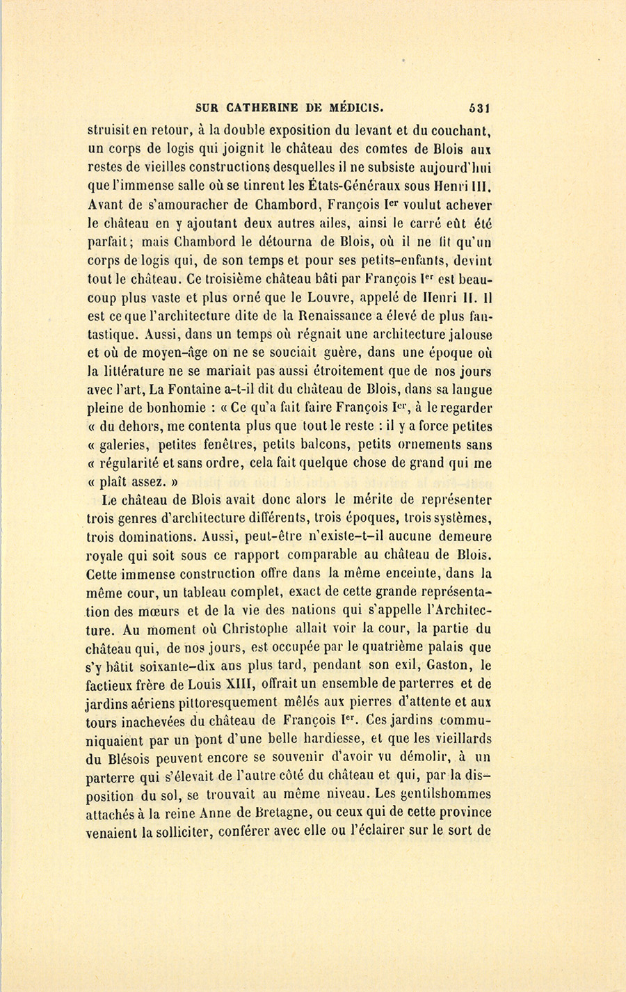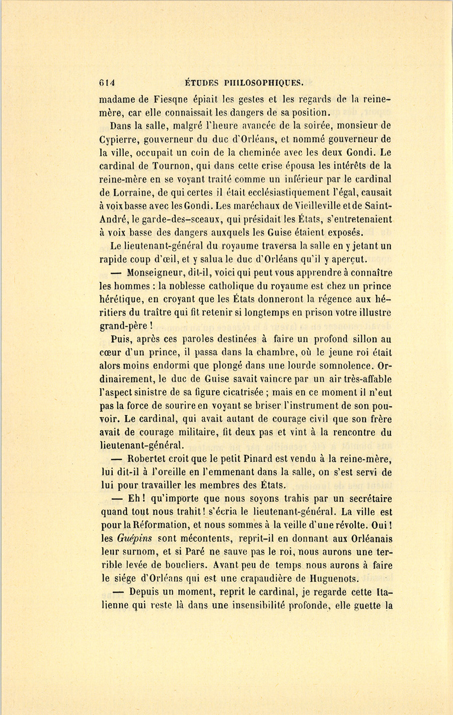 Pourquoi refuser de nos jours à la majestueuse adversaire de la plus inféconde des hérésies la grandeur qu’elle a tirée de sa lutte même ? Les Calvinistes ont beaucoup écrit contre le Stratagème de {p. 474} Charles IX ; mais parcourez la France ? en reconnaissant les ruines de tant de belles églises abattues, en mesurant les énormes blessures faites par les Religionnaires au corps social, en apprenant combien de revanches ils ont prises, en déplorant les malheurs de l’individualisme, la plaie de la France actuelle et dont le germe était dans les questions de liberté de conscience agitées par eux, vous vous demanderez de quel côté sont les bourreaux ? Il y a, comme le dit Catherine dans la troisième partie de cette Étude, « malheureusement à toutes les époques des écrivains hypocrites prêts à pleurer deux cents coquins tués à propos. » César, qui tâchait d’apitoyer le sénat sur le parti de Catilina, eût peut-être vaincu Cicéron, s’il avait eu des journaux et une Opposition à ses ordres.