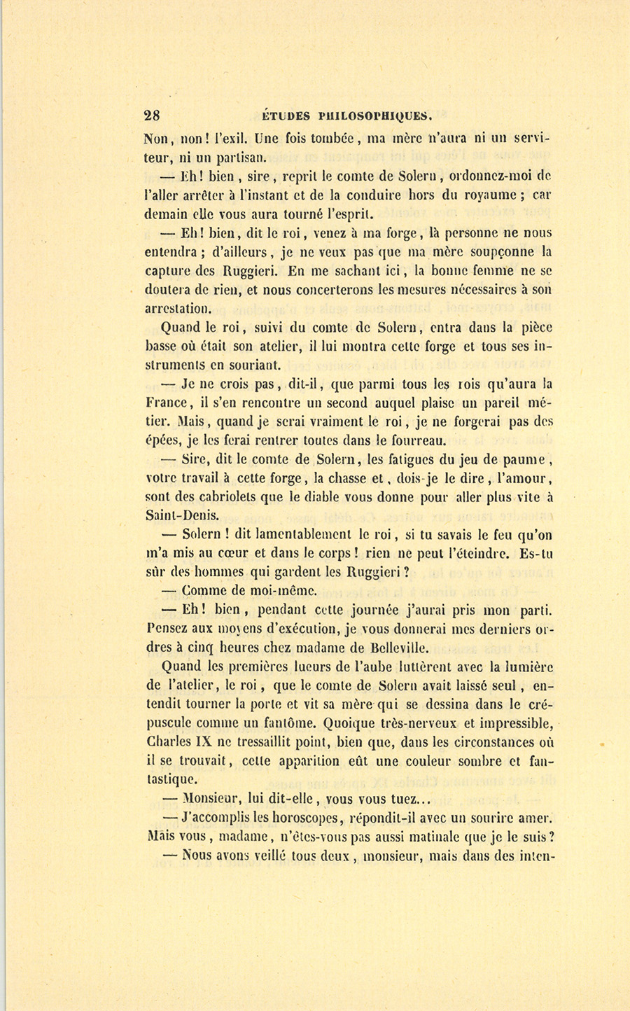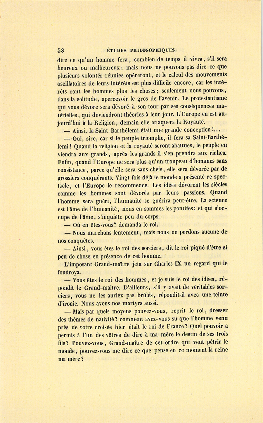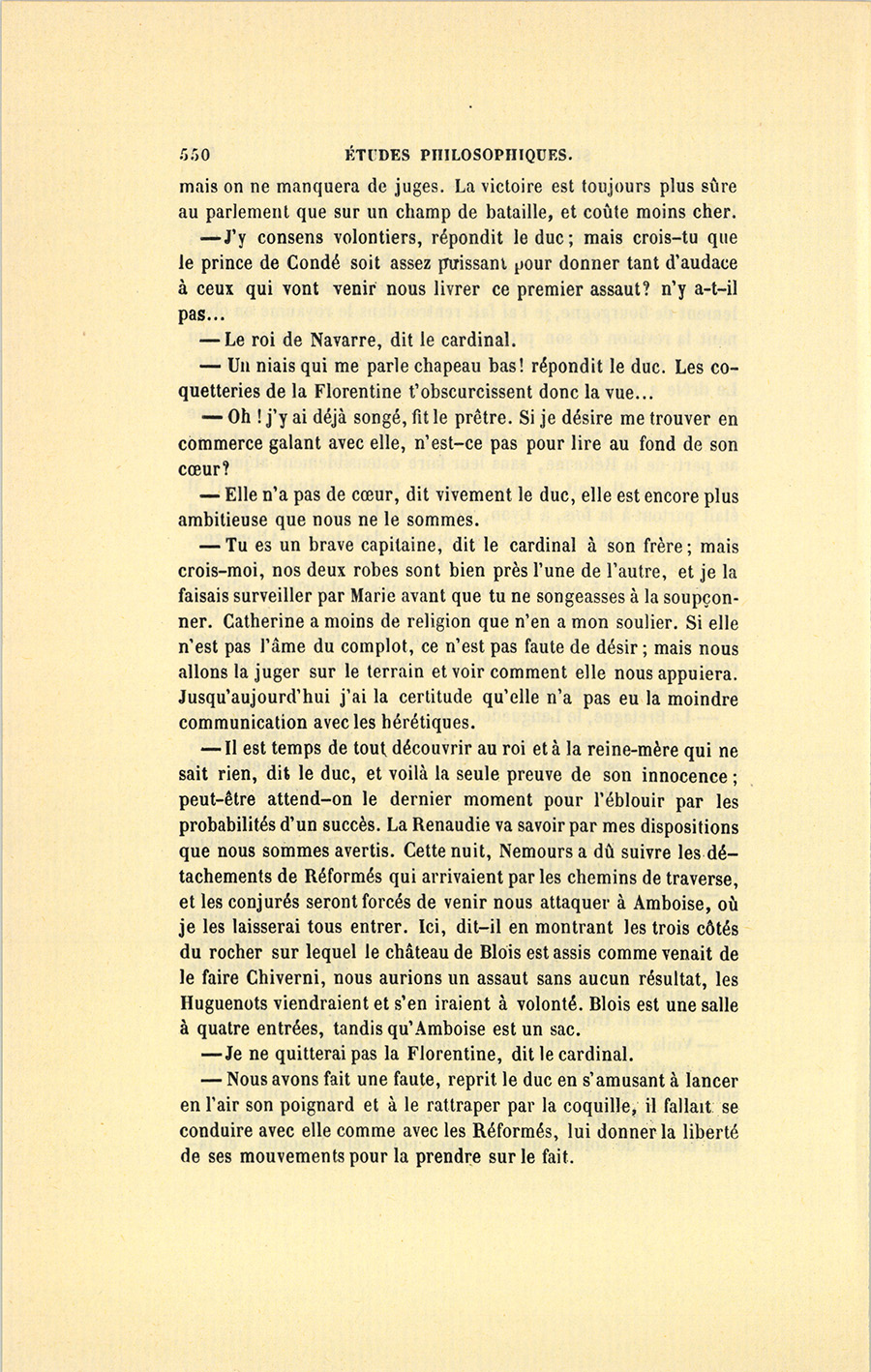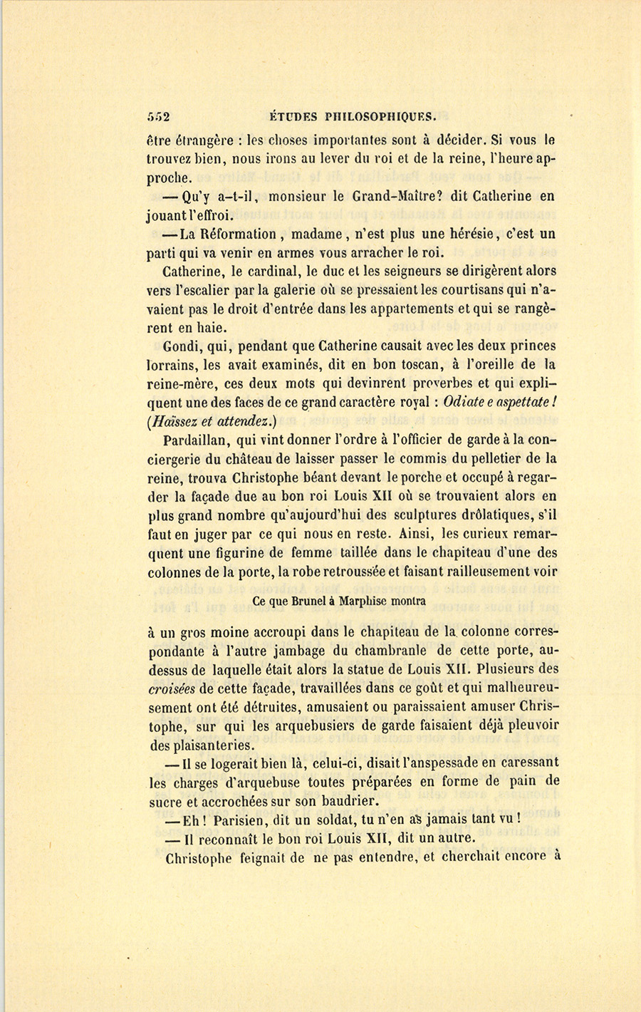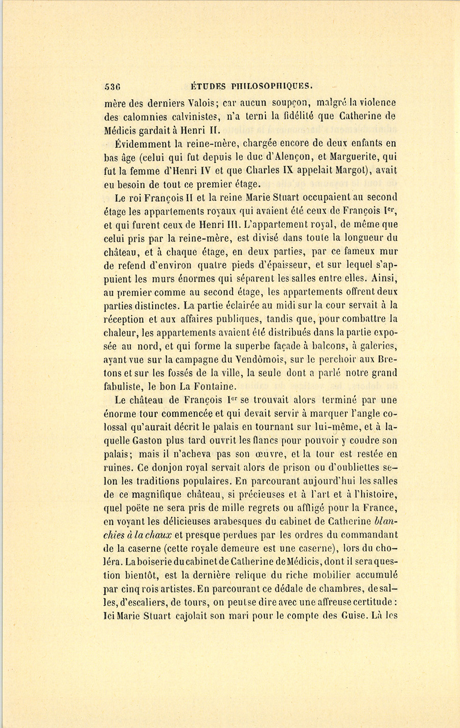 Pourquoi refuser de nos jours à la majestueuse adversaire de la plus inféconde des hérésies la grandeur qu’elle a tirée de sa lutte même ? Les Calvinistes ont beaucoup écrit contre le Stratagème de {p. 474} Charles IX ; mais parcourez la France ? en reconnaissant les ruines de tant de belles églises abattues, en mesurant les énormes blessures faites par les Religionnaires au corps social, en apprenant combien de revanches ils ont prises, en déplorant les malheurs de l’individualisme, la plaie de la France actuelle et dont le germe était dans les questions de liberté de conscience agitées par eux, vous vous demanderez de quel côté sont les bourreaux ? Il y a, comme le dit Catherine dans la troisième partie de cette Étude, « malheureusement à toutes les époques des écrivains hypocrites prêts à pleurer deux cents coquins tués à propos. » César, qui tâchait d’apitoyer le sénat sur le parti de Catilina, eût peut-être vaincu Cicéron, s’il avait eu des journaux et une Opposition à ses ordres.