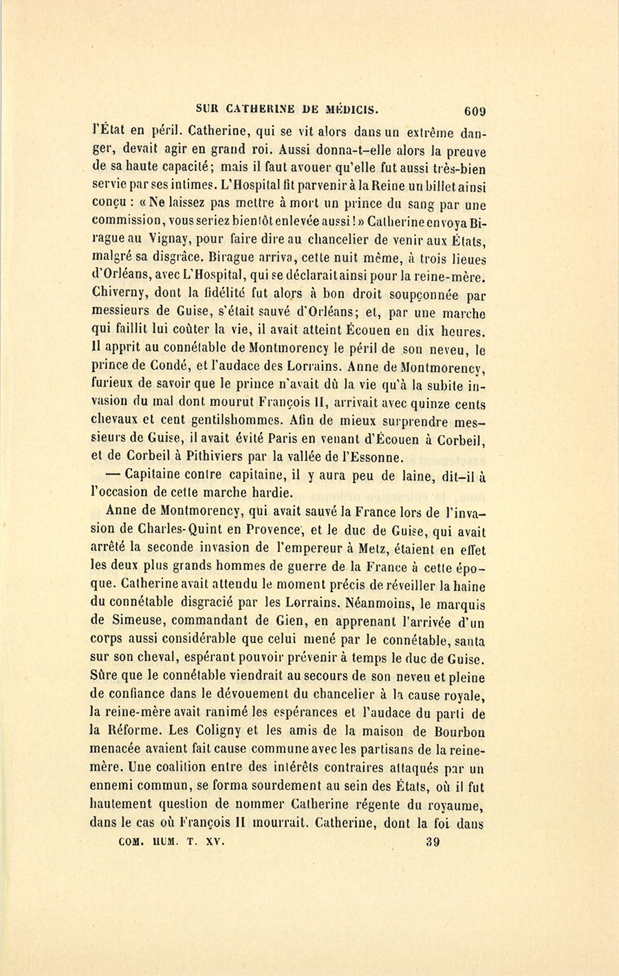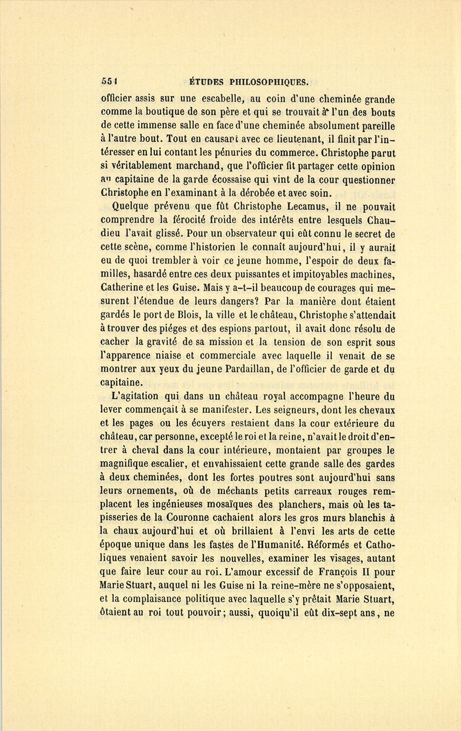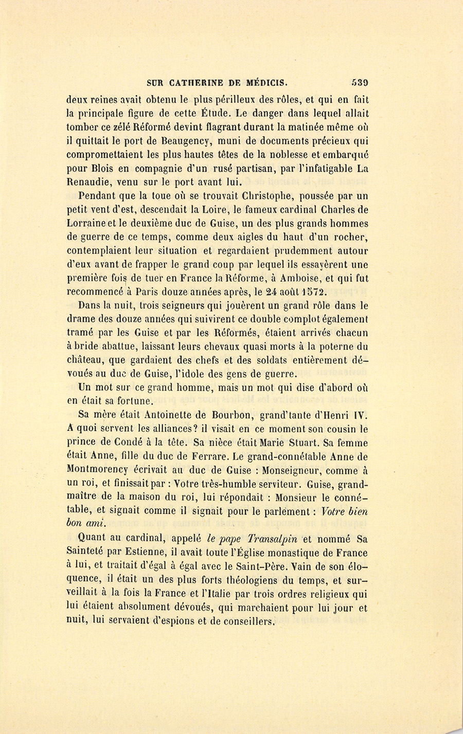 Quand on songe au nombre étonnant de volumes publiés pour rechercher le point des Alpes par lequel Annibal opéra son passage, sans qu’on puisse aujourd’hui savoir si ce fut, selon Witaker et Rivaz, par Lyon, Genève, le Saint-Bernard et le val d’Aoste ; ou, selon Letronne, Follard, Saint-Simon et Fortia d’Urban, par l’Isère, Grenoble, Saint-Bonnet, le Mont-Genèvre, Fenestrelle et le pas de Suze ; ou, selon Larauza, par le Mont-Cenis et Suze ; ou, selon Strabon, Polybe et de Luc, par le Rhône, Vienne, Yenne et le Mont-du-Chat ; ou, selon l’opinion de quelques gens d’esprit, par Gênes, la Bochetta et la Scrivia, opinion que je partage, et que Napoléon avait adoptée, sans compter le vinaigre avec lequel les roches alpestres ont été accommodées par quelques savants ; doit-on s’étonner, monsieur le marquis, de voir l’histoire moderne si négligée, que les points les plus importants en soient obscurs et que les calomnies les plus odieuses pèsent encore sur des noms qui devraient être révérés ? Remarquons, en passant, que le passage d’Annibal est devenu presque problématique à force d’éclaircissements. Ainsi le père Ménestrier croit que le Scoras désigné par Polybe est la Saône ; Letronne, Larauza et Schweighauser y voient l’Isère ; Cochard, un savant lyonnais, y voit la Drôme ; pour quiconque a des yeux, il se trouve entre Scoras et Scrivia de grandes ressemblances géographiques et linguistiques, sans compter la presque certitude du mouillage de la flotte carthaginoise à la Spezzia ou dans la rade de Gênes ? Je concevrais ces patientes recherches, si la bataille de Cannes était mise en doute ; mais puisque ses résultats sont connus, à quoi bon noircir tant de papier par tant de suppositions qui sont en quelque sorte les arabesques de l’hypothèse ; tandis que l’histoire la plus importante au temps actuel, celle de la Réformation, est pleine d’obscurités si fortes qu’on ignore le nom de l’homme1 qui faisait naviguer un bateau par la vapeur à Barcelone dans le temps que Luther et Calvin inventaient l’insurrection de la pensée ? Nous avons, je crois, la {p. 469} même opinion, après avoir fait, chacun de notre côté, les mêmes recherches sur la grande et belle figure de Catherine de Médicis. Aussi ai-je pensé que mes études historiques sur cette reine seraient convenablement adressées à un écrivain qui depuis si longtemps travaille à l’histoire de la Réformation, et que je rendrais ainsi au caractère et à la fidélité de l’homme monarchique, un public hommage, peut-être précieux par sa rareté.
