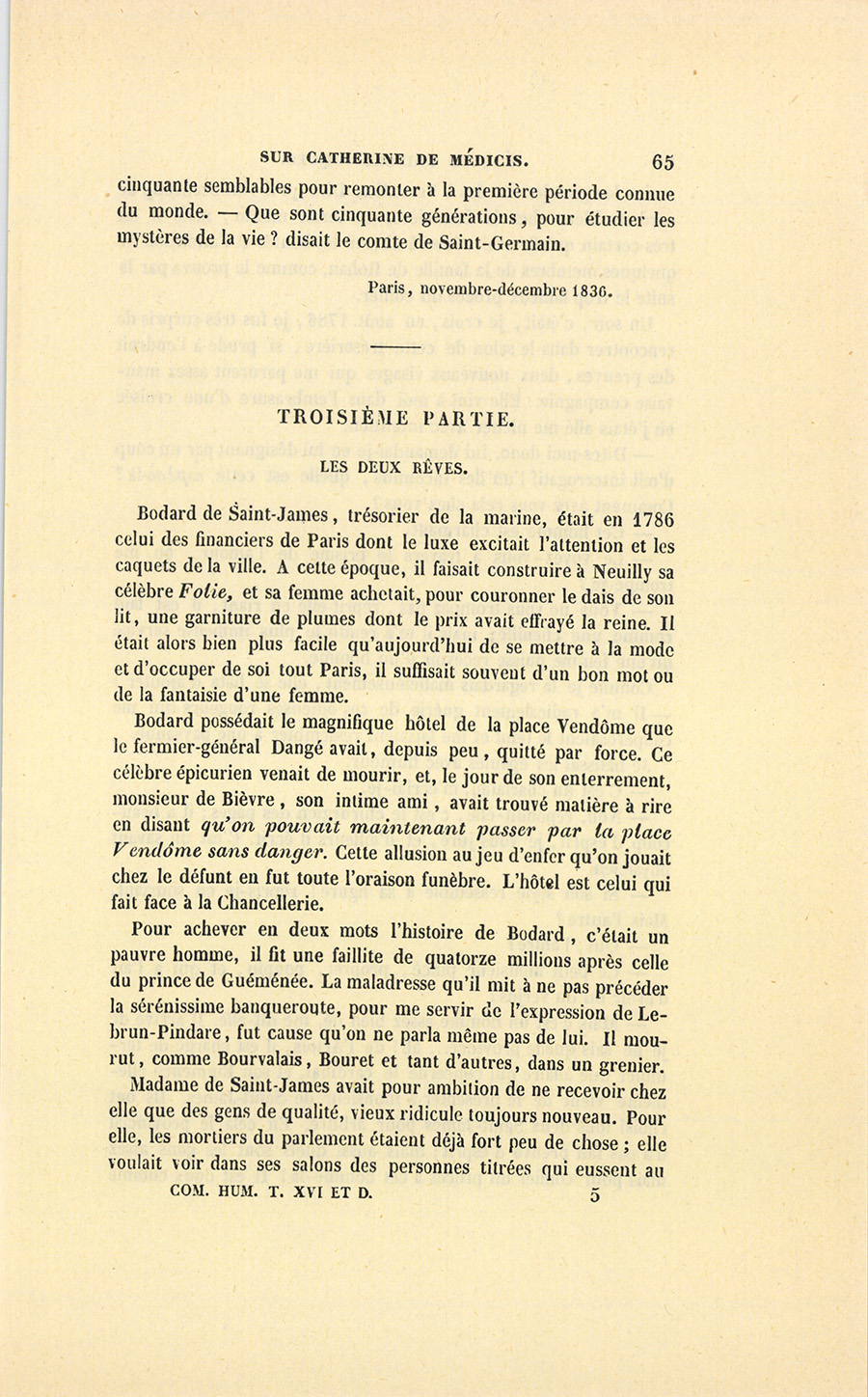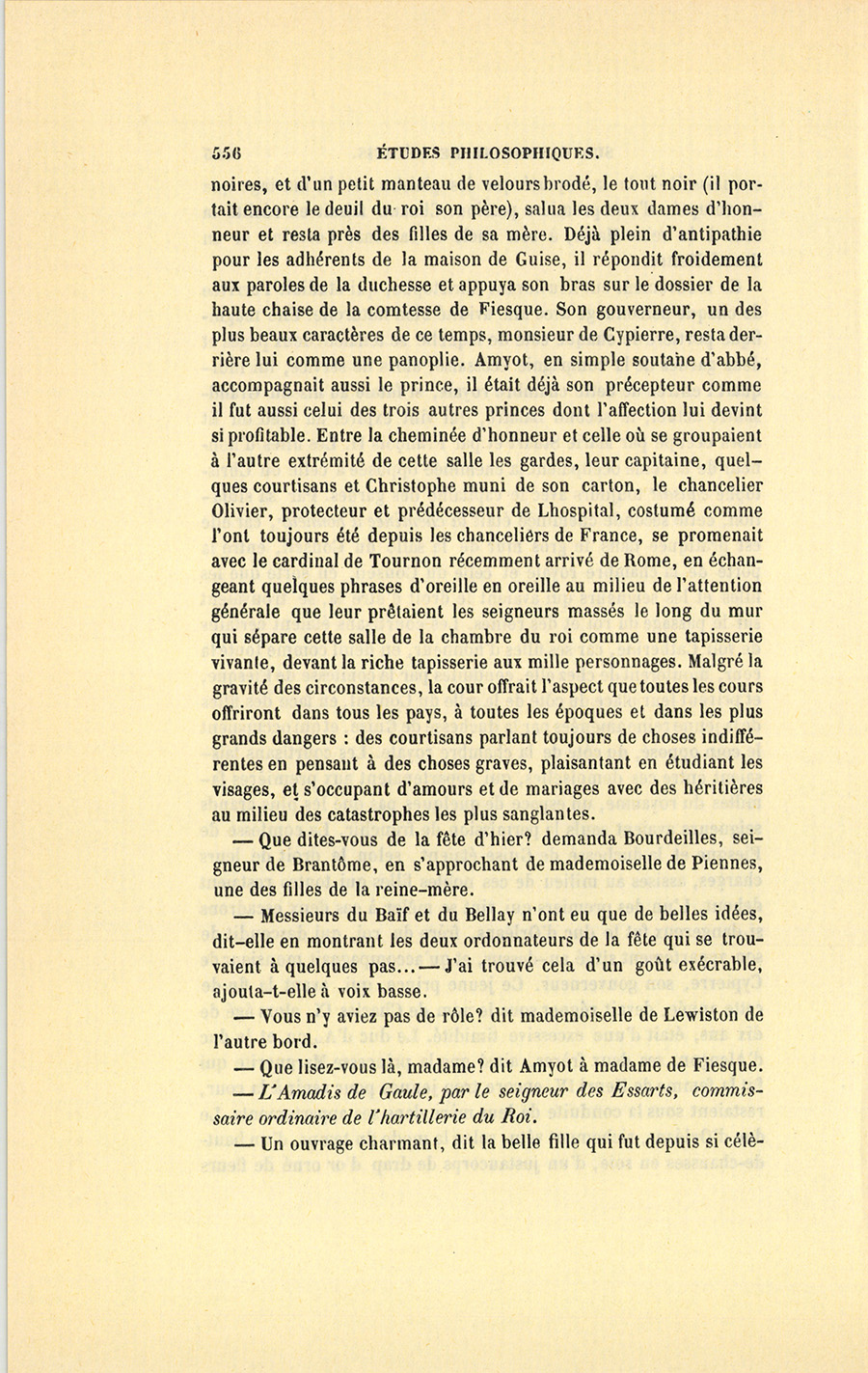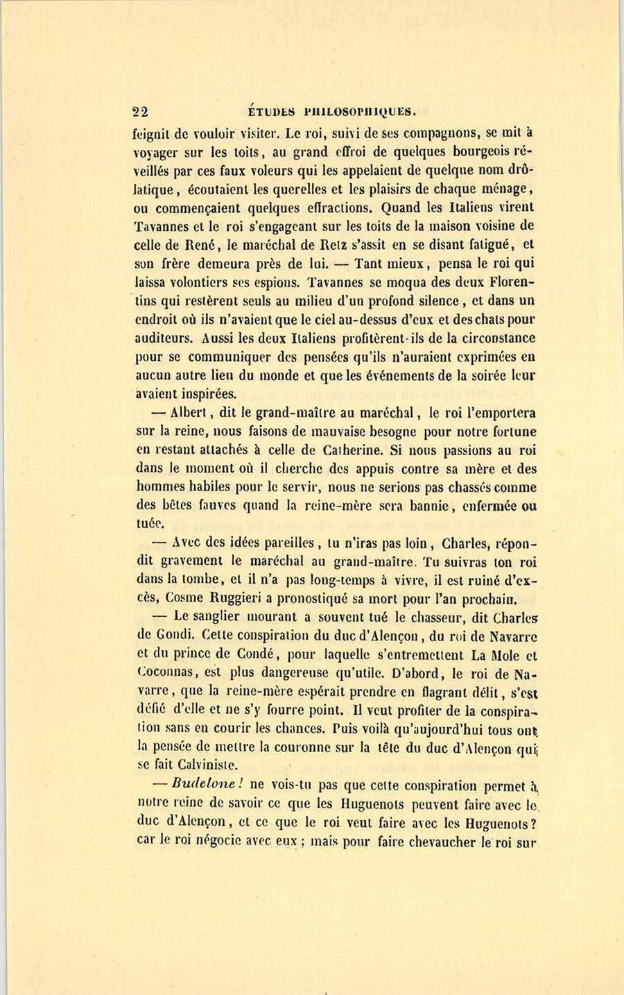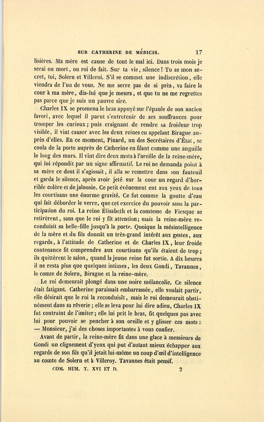Quand on songe au nombre étonnant de volumes publiés pour rechercher le point des Alpes par lequel Annibal opéra son passage, sans qu’on puisse aujourd’hui savoir si ce fut, selon Witaker et Rivaz, par Lyon, Genève, le Saint-Bernard et le val d’Aoste ; ou, selon Letronne, Follard, Saint-Simon et Fortia d’Urban, par l’Isère, Grenoble, Saint-Bonnet, le Mont-Genèvre, Fenestrelle et le pas de Suze ; ou, selon Larauza, par le Mont-Cenis et Suze ; ou, selon Strabon, Polybe et de Luc, par le Rhône, Vienne, Yenne et le Mont-du-Chat ; ou, selon l’opinion de quelques gens d’esprit, par Gênes, la Bochetta et la Scrivia, opinion que je partage, et que Napoléon avait adoptée, sans compter le vinaigre avec lequel les roches alpestres ont été accommodées par quelques savants ; doit-on s’étonner, monsieur le marquis, de voir l’histoire moderne si négligée, que les points les plus importants en soient obscurs et que les calomnies les plus odieuses pèsent encore sur des noms qui devraient être révérés ? Remarquons, en passant, que le passage d’Annibal est devenu presque problématique à force d’éclaircissements. Ainsi le père Ménestrier croit que le Scoras désigné par Polybe est la Saône ; Letronne, Larauza et Schweighauser y voient l’Isère ; Cochard, un savant lyonnais, y voit la Drôme ; pour quiconque a des yeux, il se trouve entre Scoras et Scrivia de grandes ressemblances géographiques et linguistiques, sans compter la presque certitude du mouillage de la flotte carthaginoise à la Spezzia ou dans la rade de Gênes ? Je concevrais ces patientes recherches, si la bataille de Cannes était mise en doute ; mais puisque ses résultats sont connus, à quoi bon noircir tant de papier par tant de suppositions qui sont en quelque sorte les arabesques de l’hypothèse ; tandis que l’histoire la plus importante au temps actuel, celle de la Réformation, est pleine d’obscurités si fortes qu’on ignore le nom de l’homme1 qui faisait naviguer un bateau par la vapeur à Barcelone dans le temps que Luther et Calvin inventaient l’insurrection de la pensée ? Nous avons, je crois, la {p. 469} même opinion, après avoir fait, chacun de notre côté, les mêmes recherches sur la grande et belle figure de Catherine de Médicis. Aussi ai-je pensé que mes études historiques sur cette reine seraient convenablement adressées à un écrivain qui depuis si longtemps travaille à l’histoire de la Réformation, et que je rendrais ainsi au caractère et à la fidélité de l’homme monarchique, un public hommage, peut-être précieux par sa rareté.