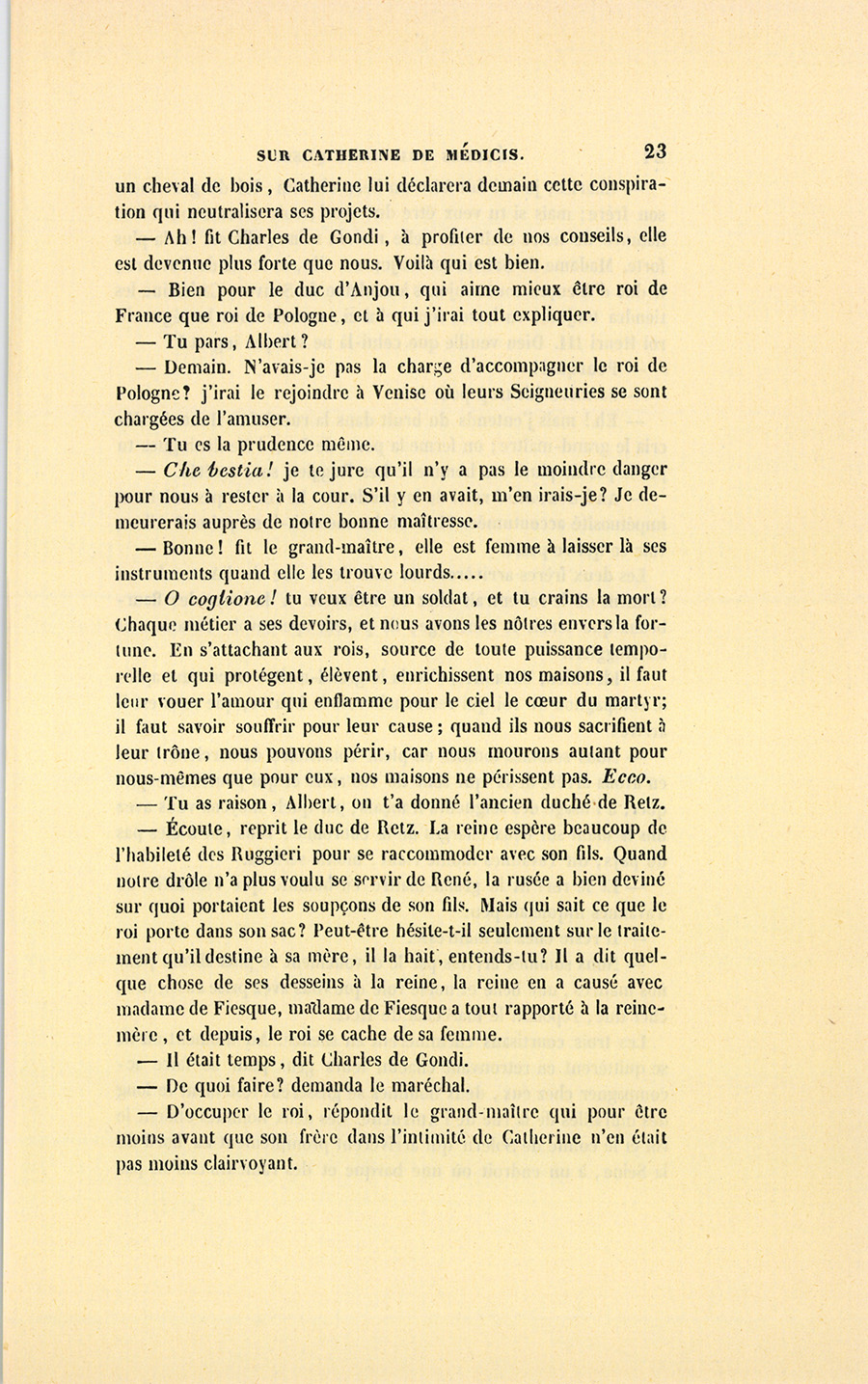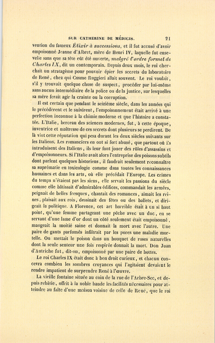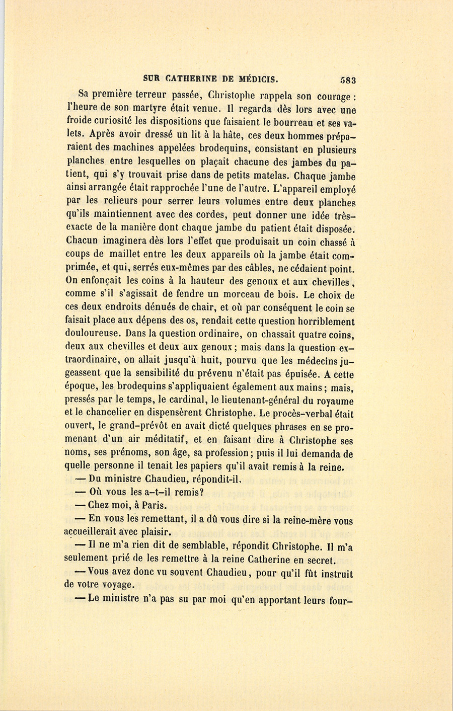 La position de sa nièce fut si mauvaise et si difficile, que le républicain Philippe Strozzi, très-incapable de la diriger au milieu d’intérêts si contraires, la quitta dès la première année, rappelé d’ailleurs en Italie par la mort de Clément VII. La conduite de Catherine, si l’on vient à songer qu’elle avait à peine quinze ans, fut un modèle de prudence : elle s’attacha très-étroitement au roi son beau-père, qu’elle quitta le moins qu’elle put, elle le suivait à cheval, à la chasse et à la guerre. Son idolâtrie pour François Ier sauva la maison de Médicis de tout soupçon, lors de l’empoisonnement du dauphin. Catherine se trouvait alors, ainsi que le duc d’Orléans, au quartier du roi en Provence, car la France fut bientôt envahie par Charles-Quint, beau-frère du roi. Toute la cour resta sur le théâtre des plaisirs du mariage, devenu celui d’une des guerres les plus cruelles. Au moment où Charles-Quint mis en fuite laissa les os de son armée en Provence, le dauphin revenait vers Lyon par {p. 491} le Rhône ; il s’arrêta pour coucher à Tournon, et, par passe-temps, il fit quelques exercices violents qui furent presque toute l’éducation de son frère et de lui, par suite de leur captivité comme otages. Ce prince eut l’imprudence, ayant très-chaud, au mois d’août, de demander un verre d’eau que Montécuculli lui servit à la glace. Le Dauphin mourut presque subitement. François Ier adorait son fils. Le Dauphin était, selon tous les historiens, un prince accompli. Le père au désespoir donna le plus grand éclat à la procédure suivie contre Montécuculli, il en chargea les plus savants magistrats du temps. Après avoir subi héroïquement les premières tortures sans rien avouer, le comte fit des aveux par lesquels il impliqua constamment l’empereur et ses deux généraux Antoine de Lèves et Ferdinand de Gonzague. Cette procédure ne satisfit point François Ier. Aucune affaire ne fut plus solennellement débattue que celle-ci. Voici ce que fit le roi, d’après le récit d’un témoin oculaire.