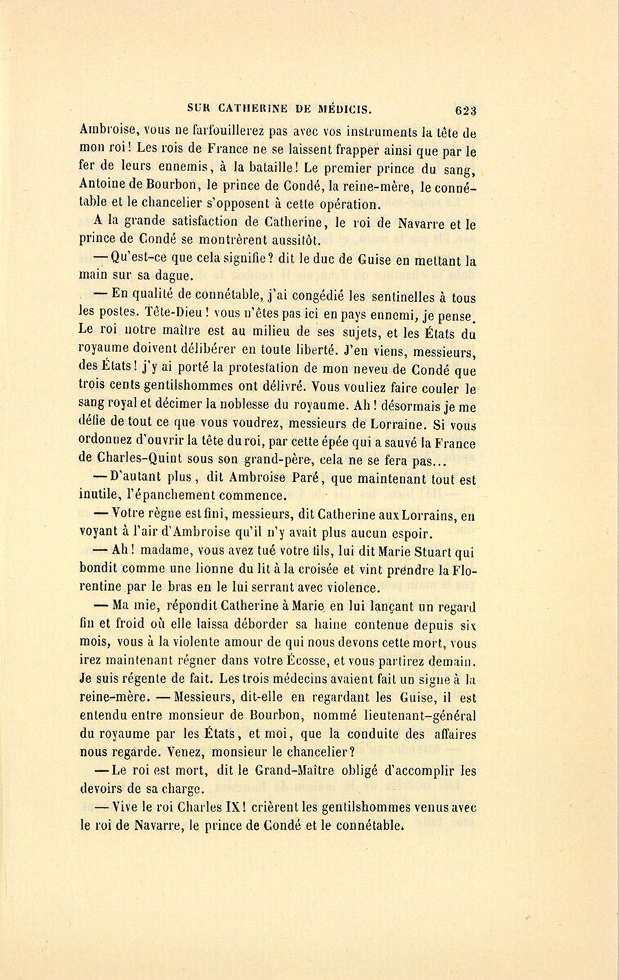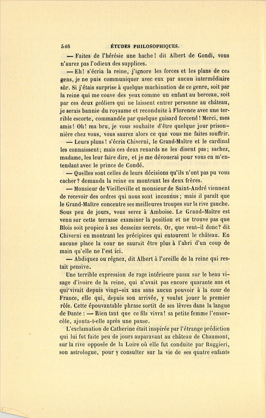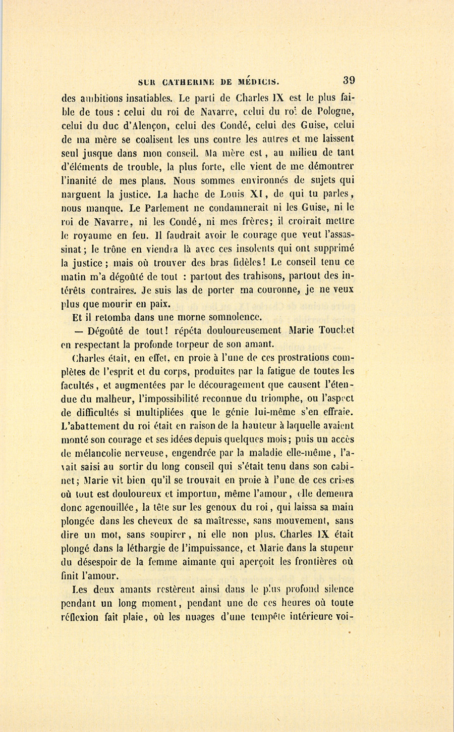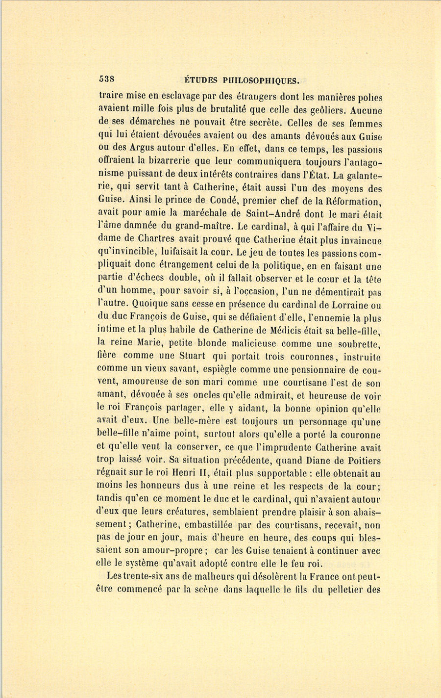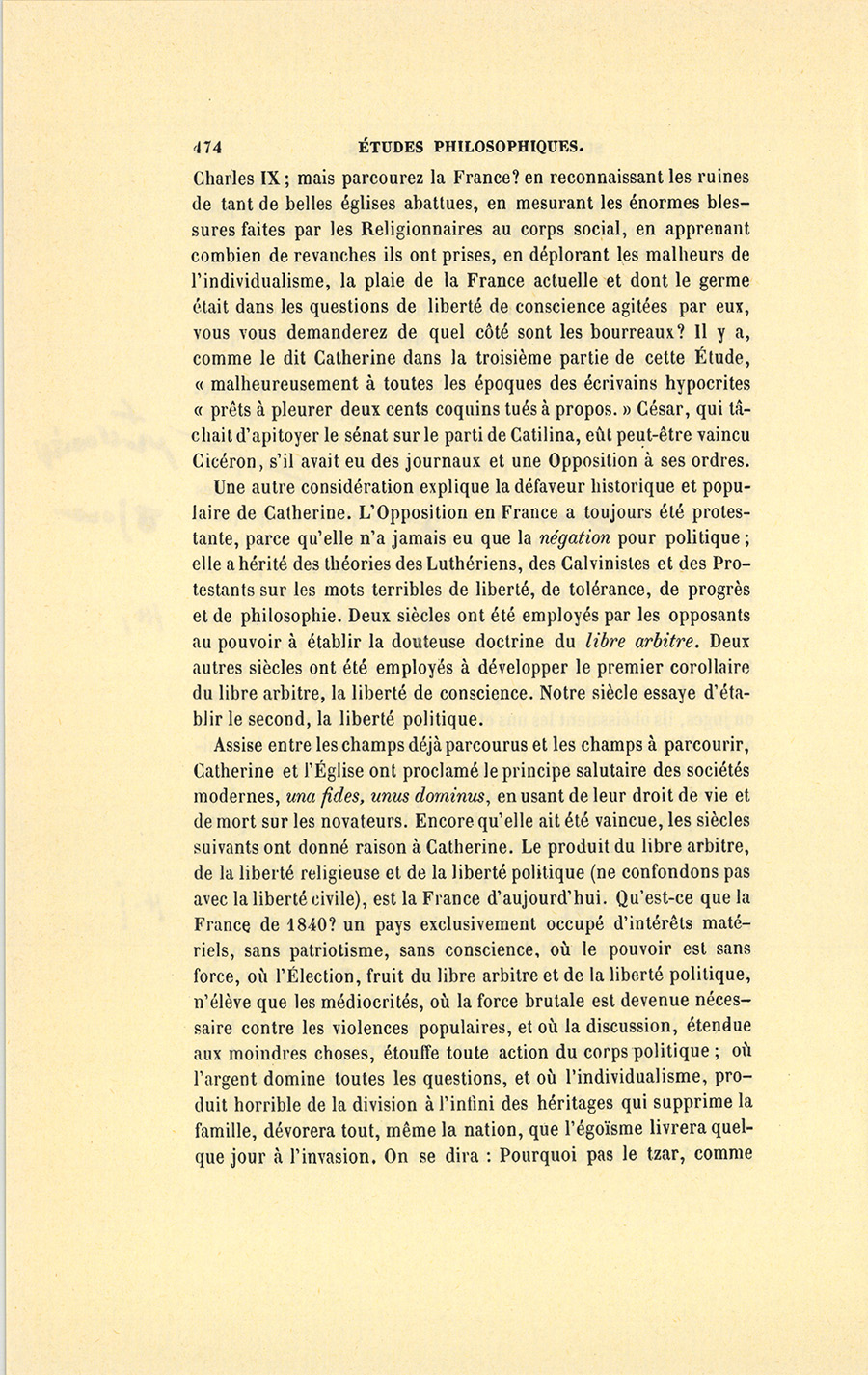 Une autre considération explique la défaveur historique et populaire de Catherine. L’Opposition en France a toujours été protestante, parce qu’elle n’a jamais eu que la négation pour politique ; elle a hérité des théories des Luthériens, des Calvinistes et des Protestants sur les mots terribles de liberté, de tolérance, de progrès et de philosophie. Deux siècles ont été employés par les opposants au pouvoir à établir la douteuse doctrine du libre arbitre. Deux autres siècles ont été employés à développer le premier corollaire du libre arbitre, la liberté de conscience. Notre siècle essaye d’établir le second, la liberté politique.