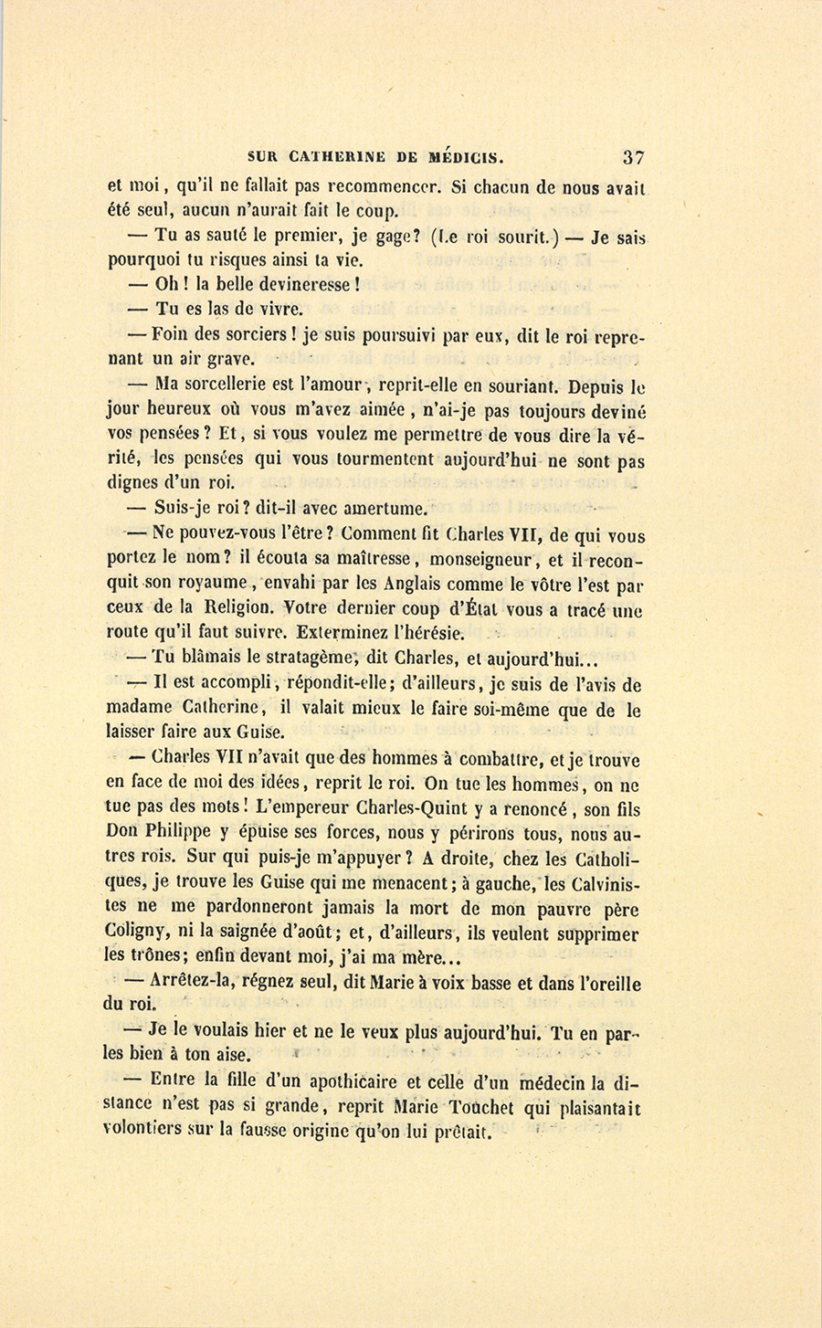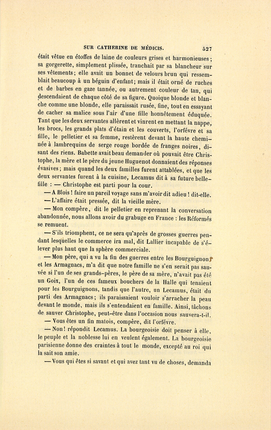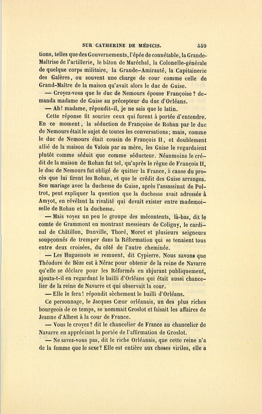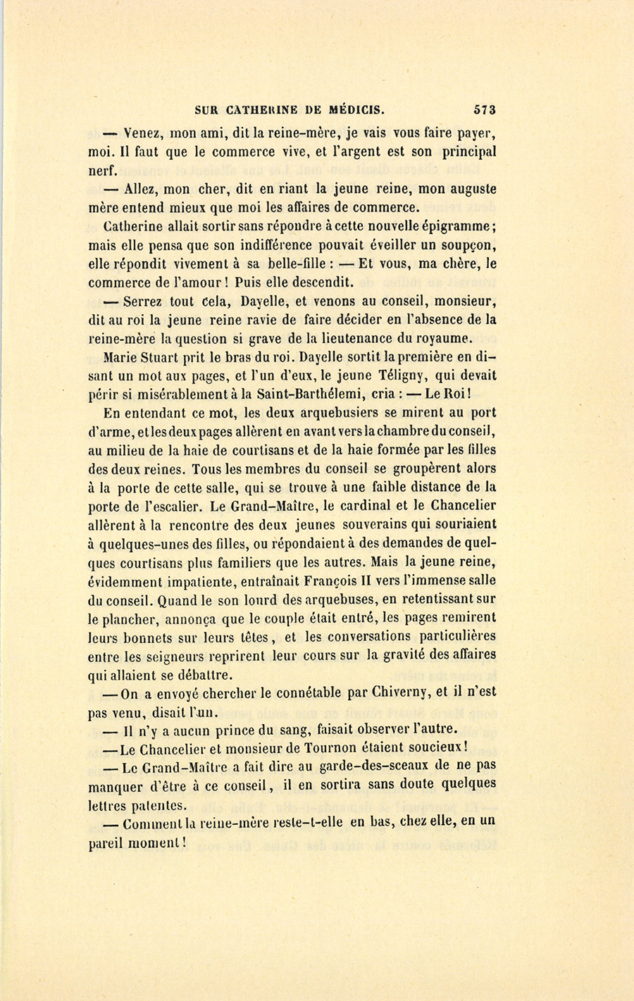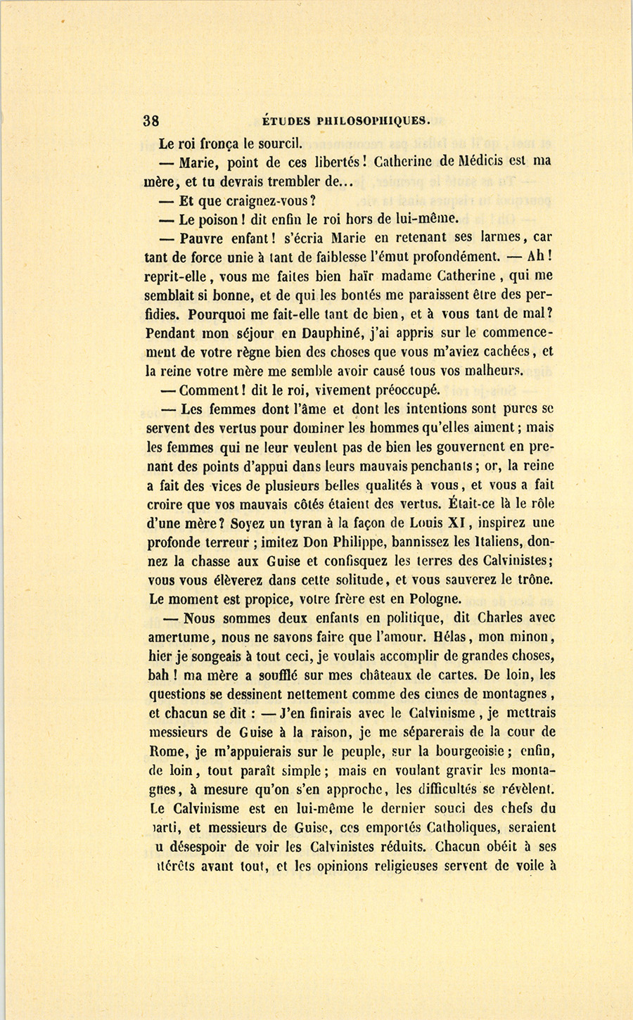 Une autre considération explique la défaveur historique et populaire de Catherine. L’Opposition en France a toujours été protestante, parce qu’elle n’a jamais eu que la négation pour politique ; elle a hérité des théories des Luthériens, des Calvinistes et des Protestants sur les mots terribles de liberté, de tolérance, de progrès et de philosophie. Deux siècles ont été employés par les opposants au pouvoir à établir la douteuse doctrine du libre arbitre. Deux autres siècles ont été employés à développer le premier corollaire du libre arbitre, la liberté de conscience. Notre siècle essaye d’établir le second, la liberté politique.