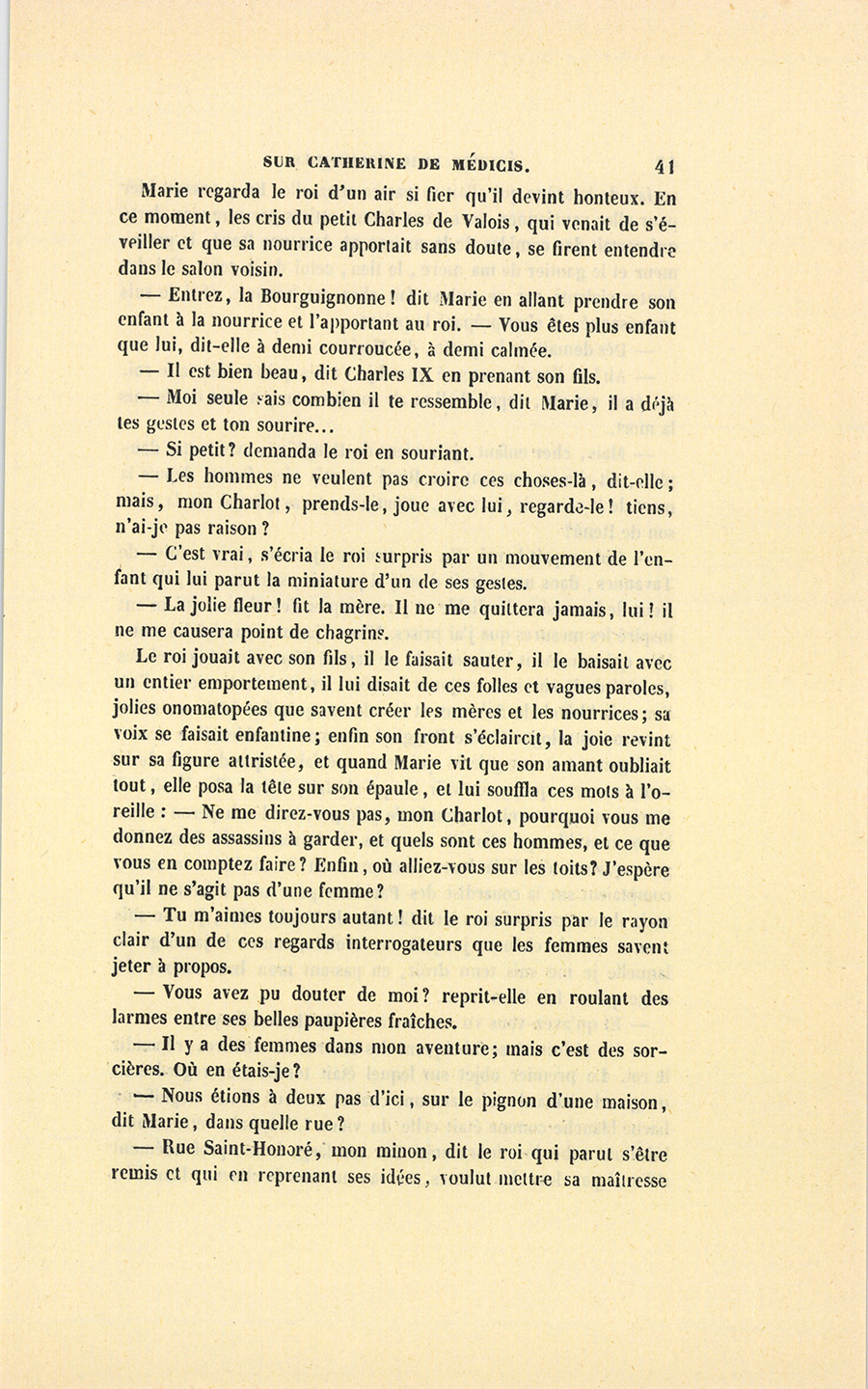 Les plus étranges conjectures ont été faites sur la stérilité de Catherine, qui dura dix ans. Peu de personnes savent aujourd’hui que plusieurs traités de médecine contiennent, relativement à cette particularité des suppositions tellement indécentes qu’elles ne peuvent plus être racontées. On peut d’ailleurs lire Bayle, à l’article Fernel. Ceci donne la mesure des étranges calomnies qui pèsent encore sur cette reine dont toutes les actions ont été travesties. La faute de sa stérilité venait uniquement de Henri II. Il eût suffi de remarquer que par un temps où nul prince ne se gênait pour avoir {p. 488} des bâtards, Diane de Poitiers, beaucoup plus favorisée que la femme légitime, n’eut pas d’enfants. Il n’y a rien de plus connu, en médecine chirurgicale, que le défaut de conformation de Henri II, expliqué d’ailleurs par la plaisanterie des dames de la cour qui pouvaient le faire abbé de Saint-Victor, dans un temps où la langue française avait les mêmes priviléges que la langue latine. Dès que le prince se fut soumis à l’opération, Catherine eut onze grossesses et dix enfants. Il est heureux pour la France que Henri II ait tardé. S’il avait eu des enfants de Diane, la politique se serait étrangement compliquée. Quand cette opération se fit, la duchesse de Valentinois était arrivée à la seconde jeunesse des femmes. Cette seule remarque prouve que l’histoire de Catherine de Médicis est à faire en entier ; et que, selon un mot très-profond de Napoléon, l’histoire de France doit n’avoir qu’un volume ou en avoir mille.