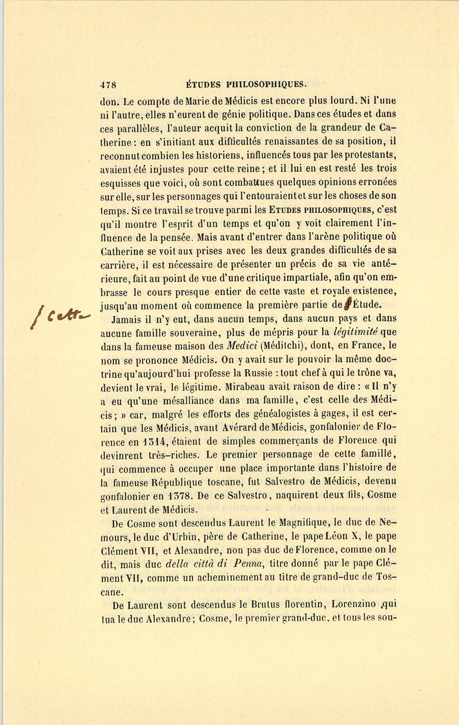 Mais aucune de ces deux branches, la branche Cosme et la branche Laurent, ne règnent en ligne droite, jusqu’au moment où la Toscane, asservie par le père de Marie de Médicis, a vu ses grands-ducs se succédant naturellement. Ainsi, Alexandre de Médicis, celui qui eut le titre de duc della città di Penna, et qui fut assassiné par Lorenzino, était fils du duc d’Urbin, père de Catherine, et d’une esclave mauresque. Aussi Lorenzino, fils légitime de Laurent, avait-il doublement le droit de tuer Alexandre, et comme usurpateur dans sa maison, et comme oppresseur de la ville. Quelques historiens croient même qu’Alexandre était fils de Clément VII. Ce qui fit reconnaître ce bâtard pour chef de la république et de la famille Médicis, fut son mariage avec Marguerite d’Autriche, fille naturelle de Charles-Quint.