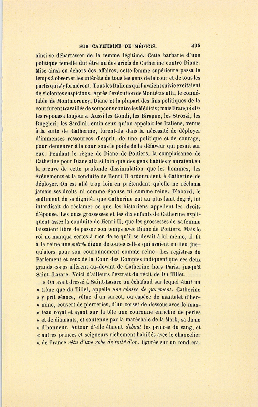 Le premier acte de Henri II fut de donner sa confiance au connétable de Montmorency, que son père lui avait enjoint de laisser dans la disgrâce. Le connétable de Montmorency fut, avec Diane de Poitiers, à qui il s’était étroitement lié, le maître de l’État. Catherine fut donc encore moins heureuse et moins puissante, quand elle se vit reine de France, que quand elle était Dauphine. D’abord, à partir de 1543, elle eut tous les ans un enfant pendant dix ans, et fut occupée de ses devoirs de maternité durant toute cette période qui embrasse les dernières années du règne de François Ier et presque tout le règne de Henri II. Il est impossible de ne pas voir, dans cette fécondité continuelle, l’influence d’une rivale qui voulait {p. 495} ainsi se débarrasser de la femme légitime. Cette barbarie d’une politique femelle dut être un des griefs de Catherine contre Diane. Mise ainsi en dehors des affaires, cette femme supérieure passa le temps à observer les intérêts de tous les gens de la cour et de tous les partis qui s’y formèrent. Tous les Italiens qui l’avaient suivie excitaient de violentes suspicions. Après l’exécution de Montécuculli, le connétable de Montmorency, Diane et la plupart des fins politiques de la cour furent travaillés de soupçons contre les Médicis ; mais François Ier les repoussa toujours. Aussi les Gondi, les Birague, les Strozzi, les Ruggieri, les Sardini, enfin ceux qu’on appelait les Italiens, venus à la suite de Catherine, furent-ils dans la nécessité de déployer d’immenses ressources d’esprit, de fine politique et de courage, pour demeurer à la cour sous le poids de la défaveur qui pesait sur eux. Pendant le règne de Diane de Poitiers, la complaisance de Catherine pour Diane alla si loin que des gens habiles y auraient eu la preuve de cette profonde dissimulation que les hommes, les événements et la conduite de Henri II ordonnaient à Catherine de déployer. On est allé trop loin en prétendant qu’elle ne réclama jamais ses droits ni comme épouse ni comme reine. D’abord, le sentiment de sa dignité, que Catherine eut au plus haut degré, lui interdisait de réclamer ce que les historiens appellent les droits d’épouse. Les onze grossesses et les dix enfants de Catherine expliquent assez la conduite de Henri II, que les grossesses de sa femme laissaient libre de passer son temps avec Diane de Poitiers. Mais le roi ne manqua certes à rien de ce qu’il se devait à lui-même, il fit à la reine une entrée digne de toutes celles qui avaient eu lieu jusqu’alors pour son couronnement comme reine. Les registres du Parlement et ceux de la Cour des Comptes indiquent que ces deux grands corps allèrent au-devant de Catherine hors Paris, jusqu’à Saint-Lazare. Voici d’ailleurs l’extrait du récit de Du Tillet.