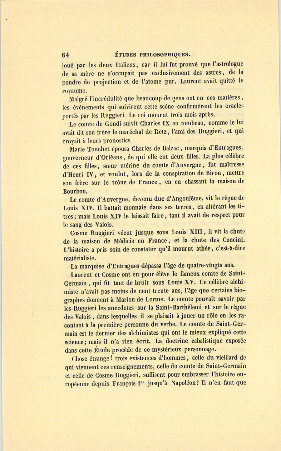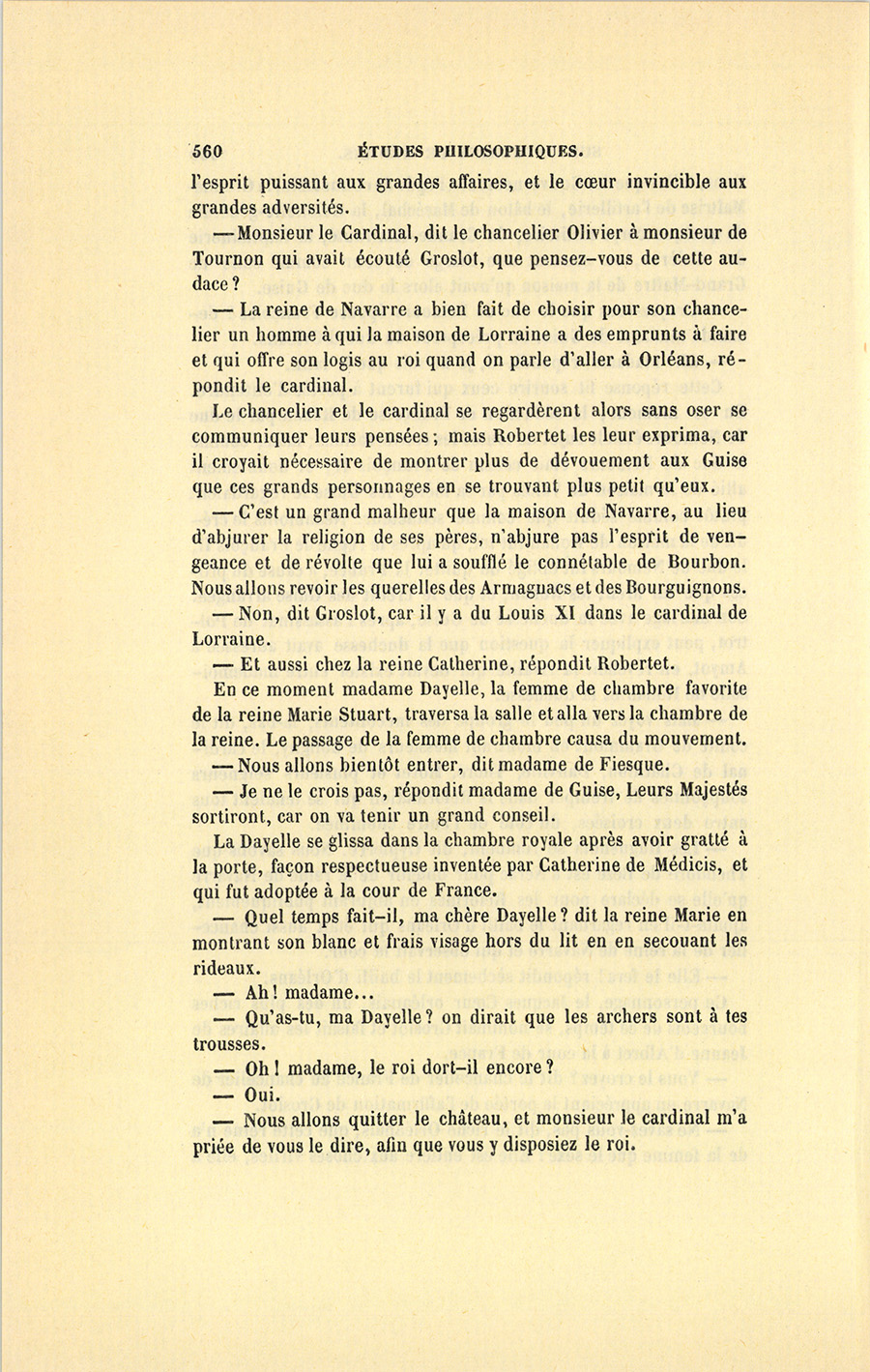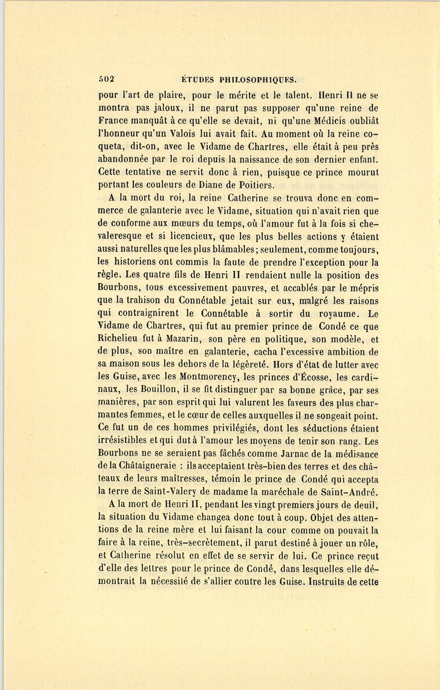 À la mort du roi, la reine Catherine se trouva donc en commerce de galanterie avec le Vidame, situation qui n’avait rien que de conforme aux mœurs du temps, où l’amour fut à la fois si chevaleresque et si licencieux, que les plus belles actions y étaient aussi naturelles que les plus blâmables ; seulement, comme toujours, les historiens ont commis la faute de prendre l’exception pour la règle. Les quatre fils de Henri II rendaient nulle la position des Bourbons, tous excessivement pauvres, et accablés par le mépris que la trahison du Connétable jetait sur eux, malgré les raisons qui contraignirent le Connétable à sortir du royaume. Le Vidame de Chartres, qui fut au premier prince de Condé ce que Richelieu fut à Mazarin, son père en politique, son modèle, et de plus, son maître en galanterie, cacha l’excessive ambition de sa maison sous les dehors de la légèreté. Hors d’état de lutter avec les Guise, avec les Montmorency, les princes d’Écosse, les cardinaux, les Bouillon, il se fit distinguer par sa bonne grâce, par ses manières, par son esprit qui lui valurent les faveurs des plus charmantes femmes, et le cœur de celles auxquelles il ne songeait point. Ce fut un de ces hommes privilégiés, dont les séductions étaient irrésistibles et qui dut à l’amour les moyens de tenir son rang. Les Bourbons ne se seraient pas fâchés comme Jarnac de la médisance de la Châtaigneraie : ils acceptaient très-bien des terres et des châteaux de leurs maîtresses, témoin le prince de Condé qui accepta la terre de Saint-Valery de madame la maréchale de Saint-André.