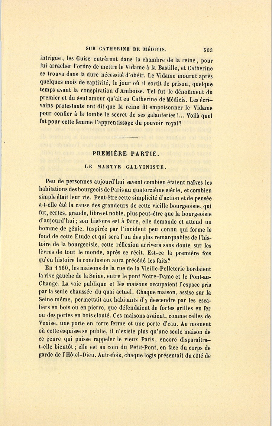 Au moment où commence ce récit, l’audace des nouvelles doctrines religieuses mettait Paris en rumeur. Un Écossais nommé Stuart venait d’assassiner le président Minard, celui des membres du Parlement à qui l’opinion publique attribuait la plus grande part dans le supplice du conseiller Anne du Bourg, brûlé en place de Grève, après le couturier (le tailleur) du feu roi à qui Henri II et Diane de Poitiers avaient fait donner la question en leur présence. Paris était si surveillé, que les archers obligeaient les passants à prier devant la madone afin de découvrir les hérétiques qui s’y prêtaient de mauvaise grâce ou refusaient même un acte contraire à leurs idées. Les deux archers qui avaient occupé le coin de la maison de Lecamus venaient de partir ; ainsi Christophe, le fils du pelletier, véhémentement soupçonné de déserter le catholicisme, avait pu sortir sans avoir à craindre qu’ils lui fissent adorer l’image de la Vierge. À sept heures du soir, en avril 1560, la nuit commençait ; donc les apprentis, ne voyant plus que quelques personnes passant sous les piliers de droite et de gauche de la rue, rentraient les marchandises exposées comme échantillon, afin de fermer la boutique et la maison. Christophe Lecamus, ardent jeune homme de vingt-deux ans, était debout sur le seuil de la porte, en apparence occupé à regarder les apprentis.