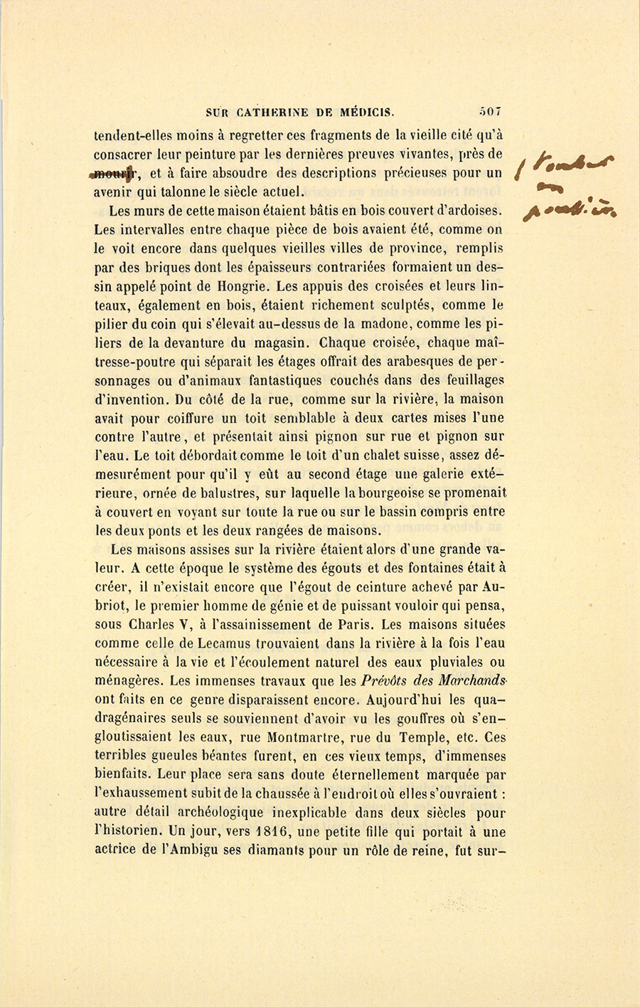 Les maisons assises sur la rivière étaient alors d’une grande valeur. À cette époque le système des égouts et des fontaines était à créer, il n’existait encore que l’égout de ceinture achevé par Aubriot, le premier homme de génie et de puissant vouloir qui pensa, sous Charles V, à l’assainissement de Paris. Les maisons situées comme celle de Lecamus trouvaient dans la rivière à la fois l’eau nécessaire à la vie et l’écoulement naturel des eaux pluviales ou ménagères. Les immenses travaux que les Prévôts des Marchands ont faits en ce genre disparaissent encore. Aujourd’hui les quadragénaires seuls se souviennent d’avoir vu les gouffres où s’engloutissaient les eaux, rue Montmartre, rue du Temple, etc. Ces terribles gueules béantes furent, en ces vieux temps, d’immenses bienfaits. Leur place sera sans doute éternellement marquée par l’exhaussement subit de la chaussée à l’endroit où elles s’ouvraient : autre détail archéologique inexplicable dans deux siècles pour l’historien. Un jour, vers 1816, une petite fille qui portait à une actrice de l’Ambigu ses diamants pour un rôle de reine, fut {p. 508} surprise par une averse, et fut si fatalement entraînée dans l’égout de la rue du Temple qu’elle allait y disparaître, sans les secours d’un passant ému par ses cris ; mais elle avait lâché les diamants, qui furent retrouvés dans un regard. Cet événement fit grand bruit, il donna du poids aux réclamations pour la suppression de ces avaloirs d’eau et de petites filles. Ces constructions curieuses, hautes de cinq pieds, étaient garnies de grilles plus ou moins mobiles ou grillagées qui déterminaient l’inondation des caves quand la rivière factice produite par une forte pluie s’arrêtait à la grille encombrée d’immondices que les riverains oubliaient souvent de lever.