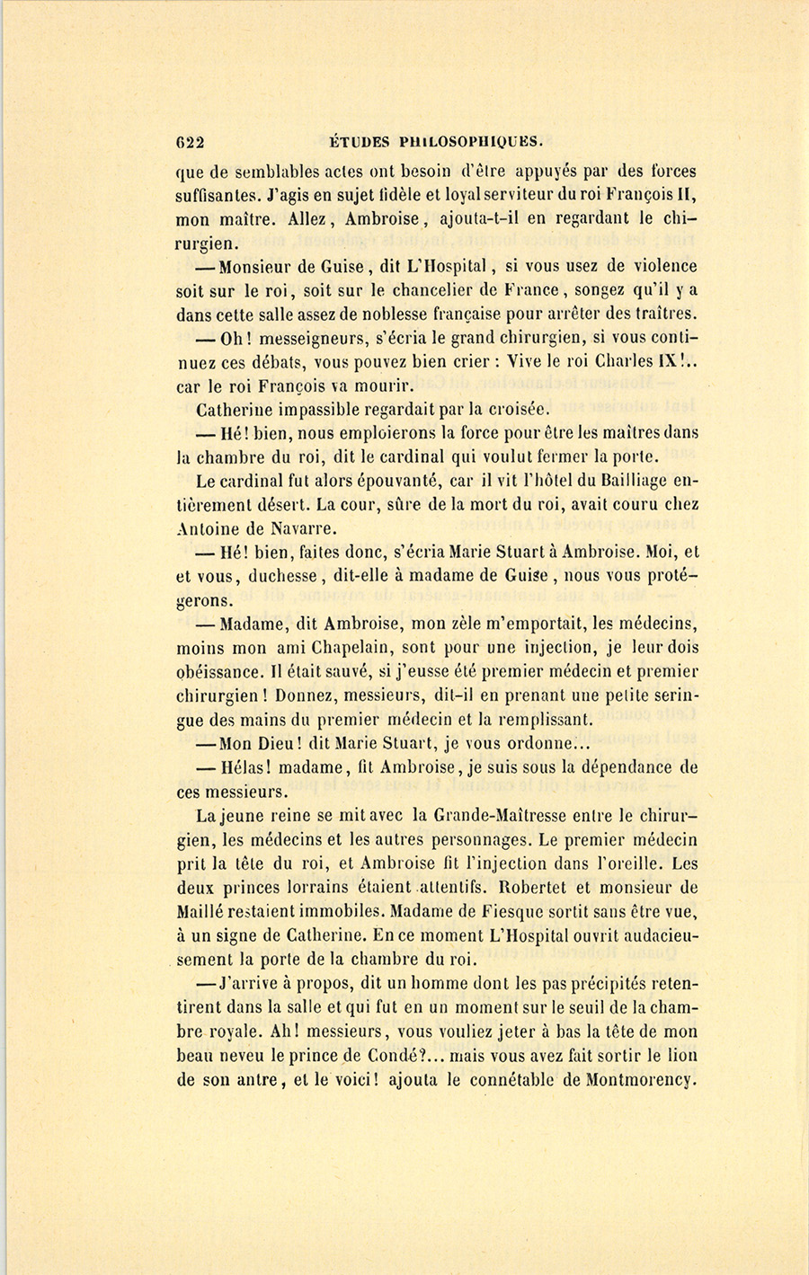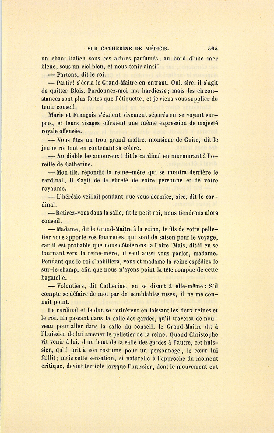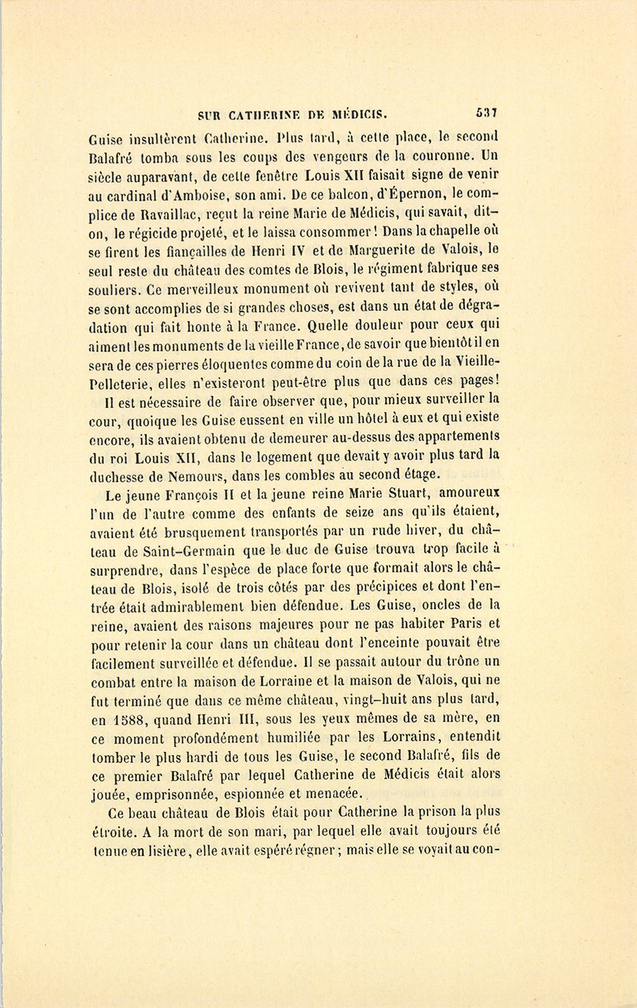 À la mort de Henri II, pendant les vingt premiers jours de deuil, la situation du Vidame changea donc tout à coup. Objet des attentions de la reine mère et lui faisant la cour comme on pouvait la faire à la reine, très-secrètement, il parut destiné à jouer un rôle, et Catherine résolut en effet de se servir de lui. Ce prince reçut d’elle des lettres pour le prince de Condé, dans lesquelles elle démontrait la nécessité de s’allier contre les Guise. Instruits de cette {p. 503} intrigue, les Guise entrèrent dans la chambre de la reine, pour lui arracher l’ordre de mettre le Vidame à la Bastille, et Catherine se trouva dans la dure nécessité d’obéir. Le Vidame mourut après quelques mois de captivité, le jour où il sortit de prison, quelque temps avant la conspiration d’Amboise. Tel fut le dénoûment du premier et du seul amour qu’ait eu Catherine de Médicis. Les écrivains protestants ont dit que la reine fit empoisonner le Vidame pour confier à la tombe le secret de ses galanteries !… Voilà quel fut pour cette femme l’apprentissage du pouvoir royal ?