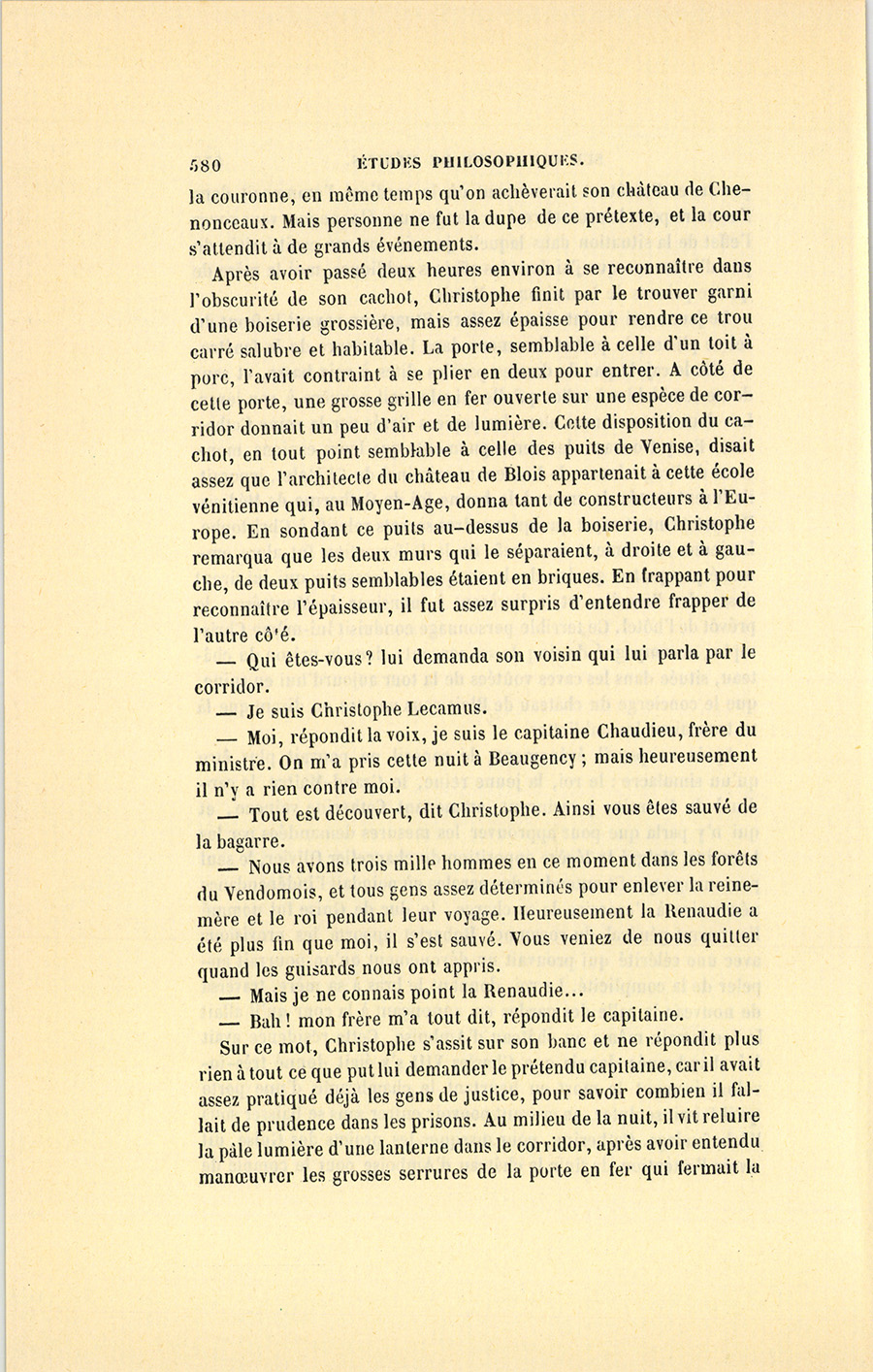 La figure du jeune enthousiaste, celle de Chaudieu, celle du marinier, celle de l’inconnu assis sur le banc, éclairées par les dernières lueurs de crépuscule, formaient un tableau qui doit d’autant plus être décrit, que cette description contient toute l’histoire de ce temps, s’il est vrai qu’il soit donné à certains hommes de résumer l’esprit de leur siècle.