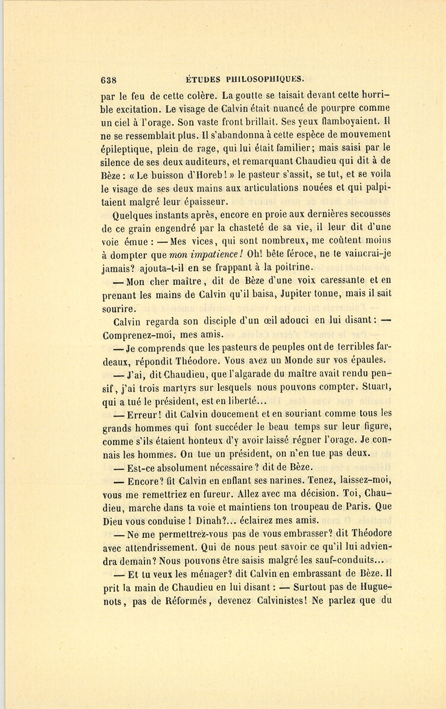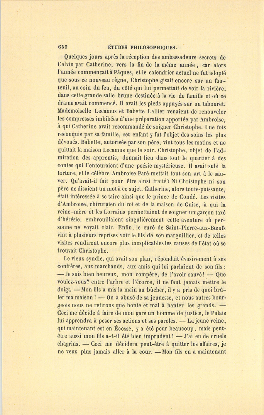 Il invita par un geste le ministre à entrer ; mais celui-ci lui répondit qu’il aimait mieux l’entretenir dehors. Christophe alla prendre son bonnet et suivit le disciple de Calvin.