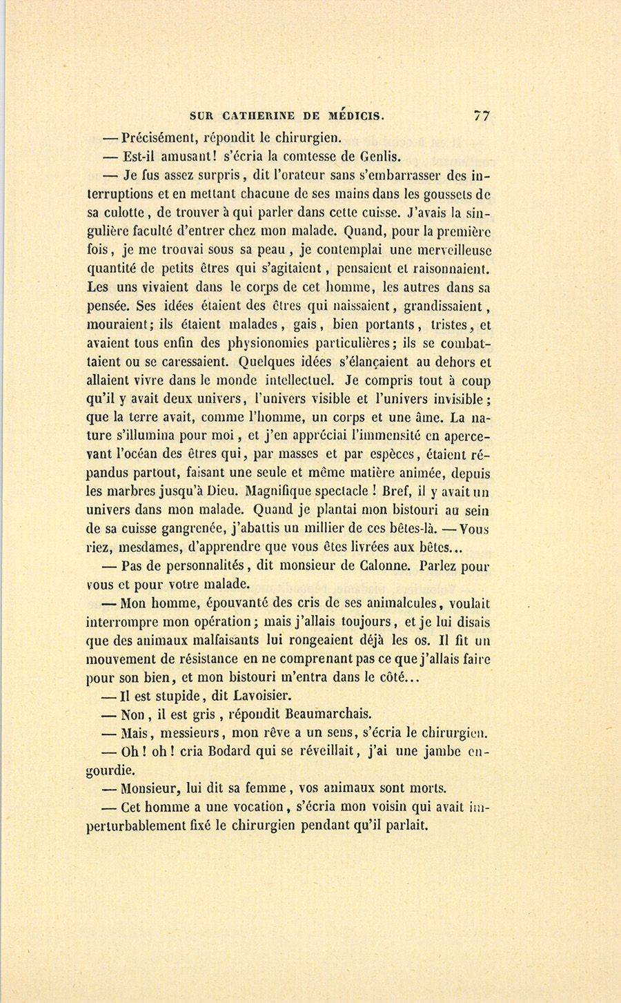 – Je fus assez surpris, dit l’orateur sans s’embarrasser des interruptions et en mettant chacune de ses mains dans les goussets de sa culotte, de trouver à qui parler dans cette cuisse. J’avais la singulière faculté d’entrer chez mon malade. Quand, pour la première fois, je me trouvai sous sa peau, je contemplai une merveilleuse quantité de petits êtres qui s’agitaient, pensaient et raisonnaient. Les uns vivaient dans le corps de cet homme, les autres dans sa pensée. Ses idées étaient des êtres qui naissaient, grandissaient, mouraient ; ils étaient malades, gais, bien portants, tristes, et avaient tous enfin des physionomies particulières ; ils se combattaient ou se caressaient. Quelques idées s’élançaient au dehors et allaient vivre dans le monde intellectuel. Je compris tout à coup qu’il y avait deux univers, l’univers visible et l’univers invisible ; que la terre avait, comme l’homme, un corps et une âme. La nature s’illumina pour moi, et j’en appréciai l’immensité en apercevant l’océan des êtres qui, par masses et par espèces, étaient répandus partout, faisant une seule et même matière animée, depuis les marbres jusqu’à Dieu. Magnifique spectacle ! Bref, il y avait un univers dans mon malade. Quand je plantai mon bistouri au sein de sa cuisse gangrenée, j’abattis un millier de ces bêtes-là. – Vous riez, mesdames, d’apprendre que vous êtes livrées aux bêtes…