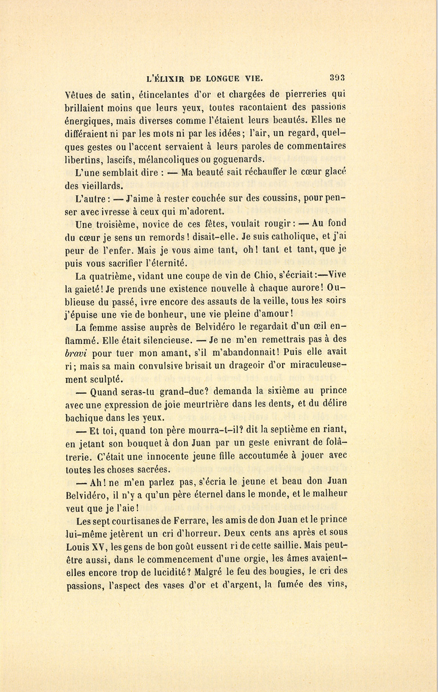 Dans un somptueux palais de Ferrare, par une soirée d’hiver, don Juan Belvidéro régalait un prince de la maison d’Este. À cette époque, une fête était un merveilleux spectacle que de royales richesses ou la puissance d’un seigneur pouvaient seules ordonner. Assises autour d’une table éclairée par des bougies parfumées, sept joyeuses femmes échangeaient de doux propos, parmi d’admirables chefs-d’œuvre dont les marbres blancs se détachaient sur des parois en stuc rouge et contrastaient avec de riches tapis de Turquie. {p. 393} Vêtues de satin, étincelantes d’or et chargées de pierreries qui brillaient moins que leurs yeux, toutes racontaient des passions énergiques, mais diverses comme l’étaient leurs beautés. Elles ne différaient ni par les mots ni par les idées ; l’air, un regard, quelques gestes ou l’accent servaient à leurs paroles de commentaires libertins, lascifs, mélancoliques ou goguenards.