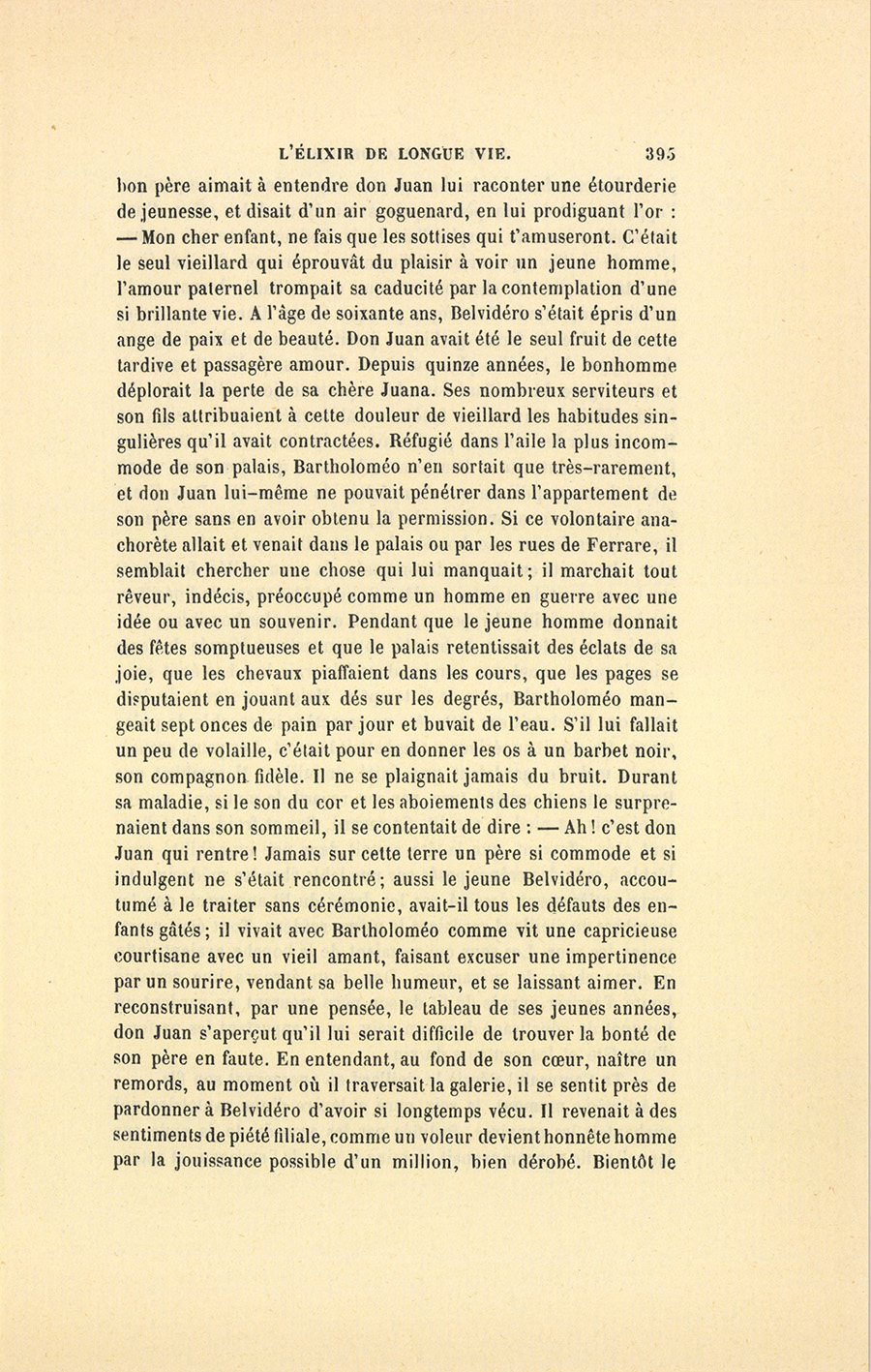 Bartholoméo Belvidéro, père de don Juan, était un vieillard nonagénaire qui avait passé la majeure partie de sa vie dans les combinaisons du commerce. Ayant traversé souvent les talismaniques contrées de l’Orient, il y avait acquis d’immenses richesses et des connaissances plus précieuses, disait-il, que l’or et les diamants, desquels alors il ne se souciait plus guère. – Je préfère une dent à un rubis, et le pouvoir au savoir, s’écriait-il parfois en souriant. Ce {p. 395} bon père aimait à entendre don Juan lui raconter une étourderie de jeunesse, et disait d’un air goguenard, en lui prodiguant l’or : – Mon cher enfant, ne fais que les sottises qui t’amuseront. C’était le seul vieillard qui éprouvât du plaisir à voir un jeune homme, l’amour paternel trompait sa caducité par la contemplation d’une si brillante vie. À l’âge de soixante ans, Belvidéro s’était épris d’un ange de paix et de beauté. Don Juan avait été le seul fruit de cette tardive et passagère amour. Depuis quinze années, le bonhomme déplorait la perte de sa chère Juana. Ses nombreux serviteurs et son fils attribuaient à cette douleur de vieillard les habitudes singulières qu’il avait contractées. Réfugié dans l’aile la plus incommode de son palais, Bartholoméo n’en sortait que très-rarement, et don Juan lui-même ne pouvait pénétrer dans l’appartement de son père sans en avoir obtenu la permission. Si ce volontaire anachorète allait et venait dans le palais ou par les rues de Ferrare, il semblait chercher une chose qui lui manquait ; il marchait tout rêveur, indécis, préoccupé comme un homme en guerre avec une idée ou avec un souvenir. Pendant que le jeune homme donnait des fêtes somptueuses et que le palais retentissait des éclats de sa joie, que les chevaux piaffaient dans les cours, que les pages se disputaient en jouant aux dés sur les degrés, Bartholoméo mangeait sept onces de pain par jour et buvait de l’eau. S’il lui fallait un peu de volaille, c’était pour en donner les os à un barbet noir, son compagnon fidèle. Il ne se plaignait jamais du bruit. Durant sa maladie, si le son du cor et les aboiements des chiens le surprenaient dans son sommeil, il se contentait de dire : – Ah ! c’est don Juan qui rentre ! Jamais sur cette terre un père si commode et si indulgent ne s’était rencontré ; aussi le jeune Belvidéro, accoutumé à le traiter sans cérémonie, avait-il tous les défauts des enfants gâtés ; il vivait avec Bartholoméo comme vit une capricieuse courtisane avec un vieil amant, faisant excuser une impertinence par un sourire, vendant sa belle humeur, et se laissant aimer. En reconstruisant, par une pensée, le tableau de ses jeunes années, don Juan s’aperçut qu’il lui serait difficile de trouver la bonté de son père en faute. En entendant, au fond de son cœur, naître un remords, au moment où il traversait la galerie, il se sentit près de pardonner à Belvidéro d’avoir si longtemps vécu. Il revenait à des sentiments de piété filiale, comme un voleur devient honnête homme par la jouissance possible d’un million, bien dérobé. Bientôt le {p. 396} jeune homme franchit les hautes et froides salles qui composaient l’appartement de son père. Après avoir éprouvé les effets d’une atmosphère humide, respiré l’air épais, l’odeur rance qui s’exhalaient de vieilles tapisseries et d’armoires couvertes de poussière, il se trouva dans la chambre antique du vieillard, devant un lit nauséabond, auprès d’un foyer presque éteint. Une lampe, posée sur une table de forme gothique, jetait, par intervalles inégaux, des nappes de lumière plus ou moins forte sur le lit, et montrait ainsi la figure du vieillard sous des aspects toujours différents. Le froid sifflait à travers les fenêtres mal fermées ; et la neige, en fouettant sur les vitraux, produisait un bruit sourd. Cette scène formait un contraste si heurté avec la scène que don Juan venait d’abandonner, qu’il ne put s’empêcher de tressaillir. Puis il eut froid quand, en approchant du lit, une assez violente rafale de lueur, poussée par une bouffée de vent, illumina la tête de son père : les traits en étaient décomposés, la peau collée fortement sur les os avait des teintes verdâtres que la blancheur de l’oreiller, sur lequel le vieillard reposait, rendait encore plus horribles ; contractée par la douleur, la bouche entr’ouverte et dénuée de dents laissait passer quelques soupirs dont l’énergie lugubre était soutenue par les hurlements de la tempête. Malgré ces signes de destruction, il éclatait sur cette tête un caractère incroyable de puissance. Un esprit supérieur y combattait la mort. Les yeux, creusés par la maladie, gardaient une fixité singulière. Il semblait que Bartholoméo cherchât à tuer, par son regard de mourant, un ennemi assis au pied de son lit. Ce regard, fixe et froid, était d’autant plus effrayant, que la tête restait dans une immobilité semblable à celle des crânes posés sur une table chez les médecins. Le corps entièrement dessiné par les draps du lit annonçait que les membres du vieillard gardaient la même roideur. Tout était mort, moins les yeux. Les sons qui sortaient de la bouche avaient enfin quelque chose de mécanique. Don Juan éprouva une certaine honte d’arriver auprès du lit de son père mourant en gardant un bouquet de courtisane dans son sein, en y apportant les parfums d’une fête et les senteurs du vin.