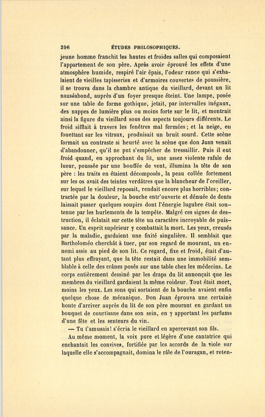 Au même moment, la voix pure et légère d’une cantatrice qui enchantait les convives, fortifiée par les accords de la viole sur laquelle elle s’accompagnait, domina le râle de l’ouragan, et {p. 397} retentit jusque dans cette chambre funèbre. Don Juan voulut ne rien entendre de cette sauvage affirmation donnée à son père.