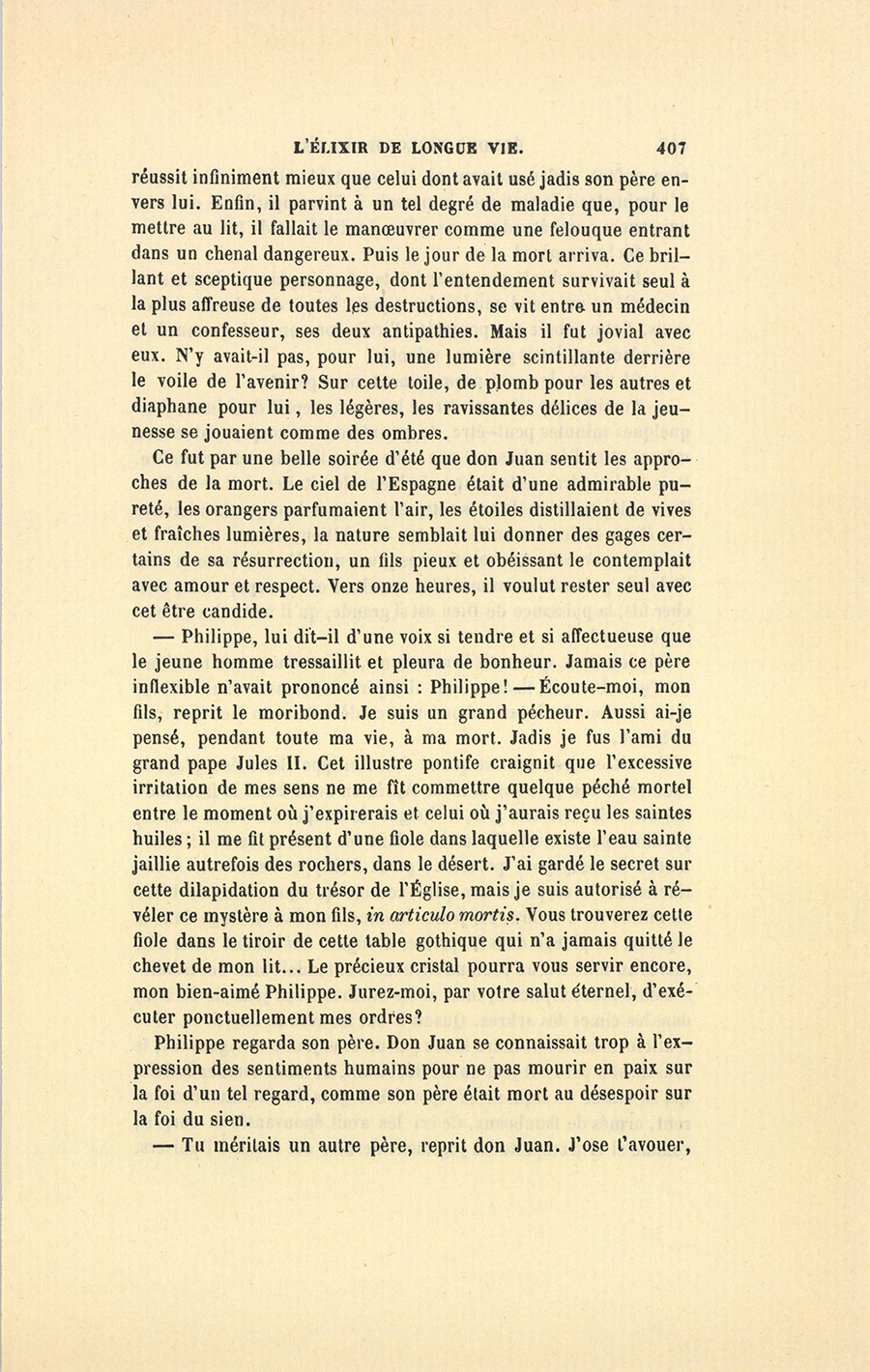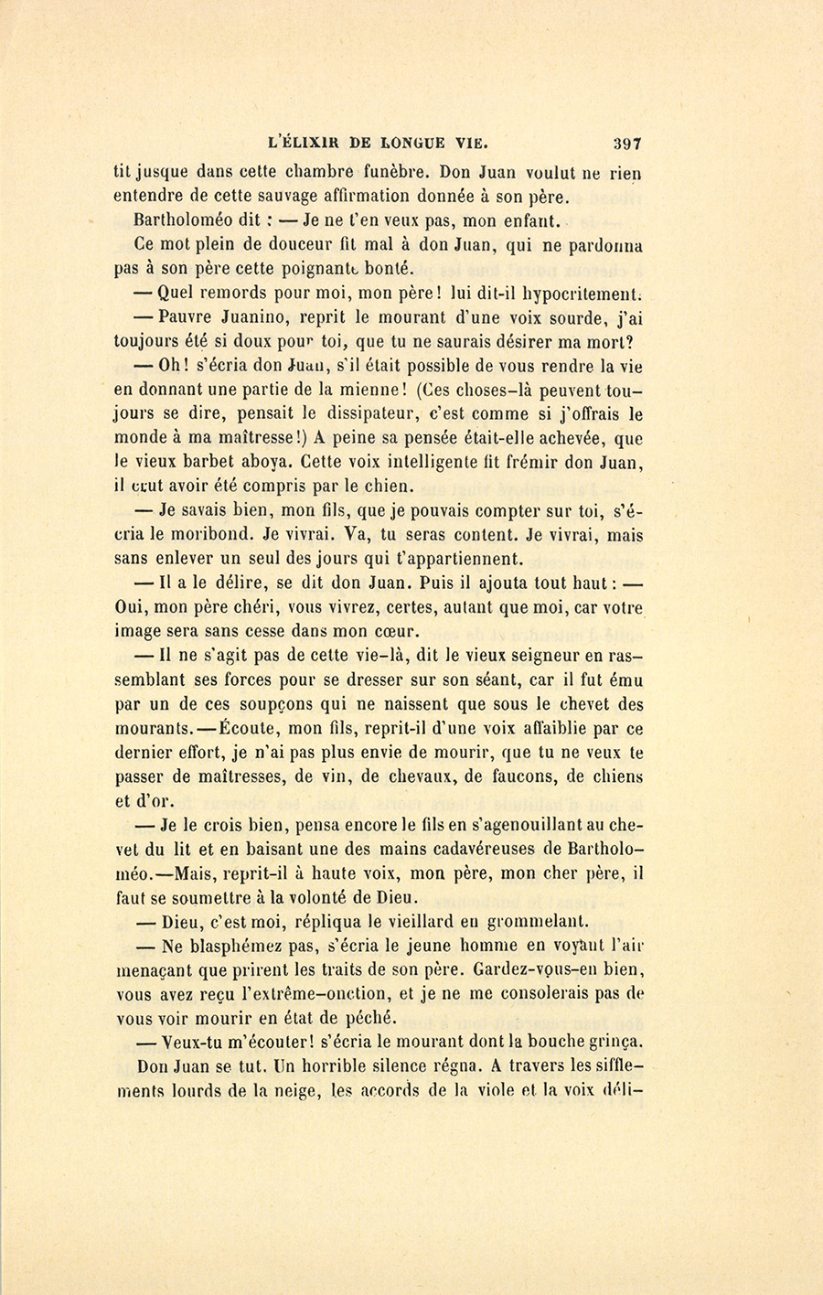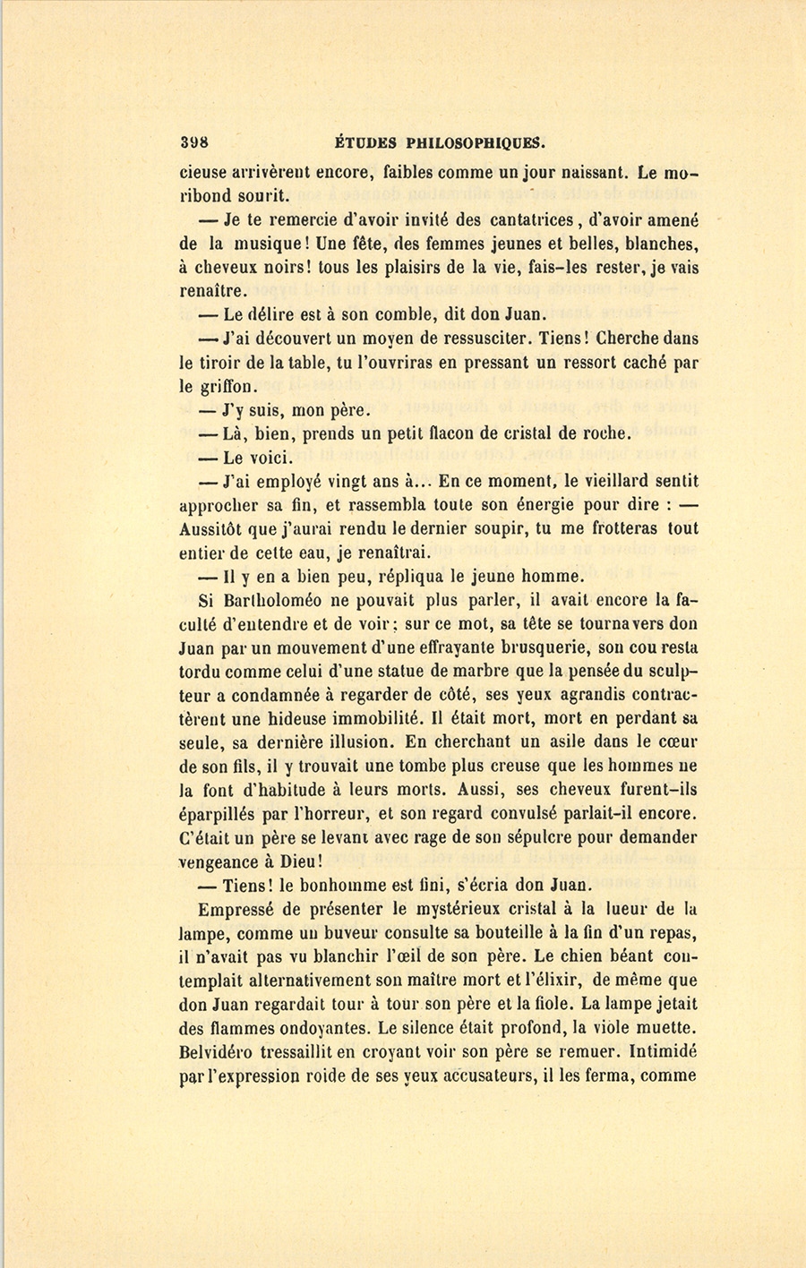 Ici, don Juan, qui sentit la mort venir, ajouta d’une voix terrible : – Tiens bien le flacon. Puis il expira doucement dans les bras d’un fils dont les larmes abondantes coulèrent sur sa face ironique et blême.