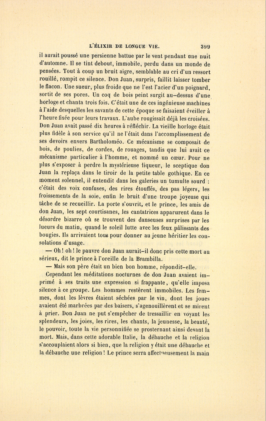 Empressé de présenter le mystérieux cristal à la lueur de la lampe, comme un buveur consulte sa bouteille à la fin d’un repas, il n’avait pas vu blanchir l’œil de son père. Le chien béant contemplait alternativement son maître mort et l’élixir, de même que don Juan regardait tour à tour son père et la fiole. La lampe jetait des flammes ondoyantes. Le silence était profond, la viole muette. Belvidéro tressaillit en croyant voir son père se remuer. Intimidé par l’expression roide de ses yeux accusateurs, il les ferma, comme {p. 399} il aurait poussé une persienne battue par le vent pendant une nuit d’automne. Il se tint debout, immobile, perdu dans un monde de pensées. Tout à coup un bruit aigre, semblable au cri d’un ressort rouillé, rompit ce silence. Don Juan, surpris, faillit laisser tomber le flacon. Une sueur, plus froide que ne l’est l’acier d’un poignard, sortit de ses pores. Un coq de bois peint surgit au-dessus d’une horloge et chanta trois fois. C’était une de ces ingénieuses4 machines à l’aide desquelles les savants de cette époque se faisaient éveiller à l’heure fixée pour leurs travaux. L’aube rougissait déjà les croisées. Don Juan avait passé dix heures à réfléchir. La vieille horloge était plus fidèle à son service qu’il ne l’était dans l’accomplissement de ses devoirs envers Bartholoméo. Ce mécanisme se composait de bois, de poulies, de cordes, de rouages, tandis que lui avait ce mécanisme particulier à l’homme, et nommé un cœur. Pour ne plus s’exposer à perdre la mystérieuse liqueur, le sceptique don Juan la replaça dans le tiroir de la petite table gothique. En ce moment solennel, il entendit dans les galeries un tumulte sourd : c’était des voix confuses, des rires étouffés, des pas légers, les froissements de la soie, enfin le bruit d’une troupe joyeuse qui tâche de se recueillir. La porte s’ouvrit, et le prince, les amis de don Juan, les sept courtisanes, les cantatrices apparurent dans le désordre bizarre où se trouvent des danseuses surprises par les lueurs du matin, quand le soleil lutte avec les feux pâlissants des bougies. Ils arrivaient tous pour donner au jeune héritier les consolations d’usage.