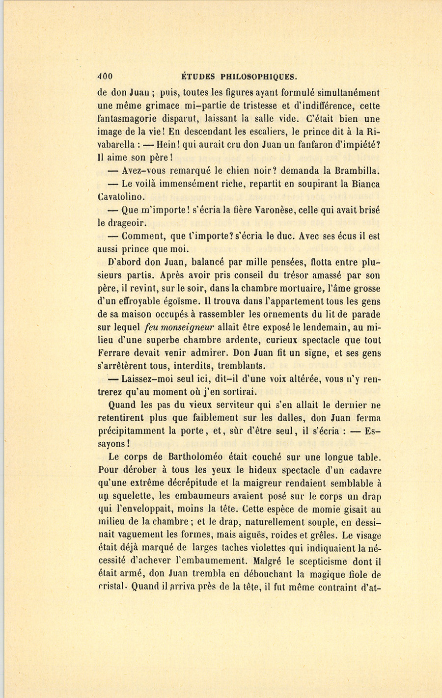Cependant les méditations nocturnes de don Juan avaient imprimé à ses traits une expression si frappante, qu’elle imposa silence à ce groupe. Les hommes restèrent immobiles. Les femmes, dont les lèvres étaient séchées par le vin, dont les joues avaient été marbrées par des baisers, s’agenouillèrent et se mirent à prier. Don Juan ne put s’empêcher de tressaillir en voyant les splendeurs, les joies, les rires, les chants, la jeunesse, la beauté, le pouvoir, toute la vie personnifiée se prosternant ainsi devant la mort. Mais, dans cette adorable Italie, la débauche et la religion s’accouplaient alors si bien, que la religion y était une débauche et la débauche une religion ! Le prince serra affectueusement la main {p. 400} de don Juan ; puis, toutes les figures ayant formulé simultanément une même grimace mi-partie de tristesse et d’indifférence, cette fantasmagorie disparut, laissant la salle vide. C’était bien une image de la vie ! En descendant les escaliers, le prince dit à la Rivabarella : – Hein ! qui aurait cru don Juan un fanfaron d’impiété ? Il aime son père !