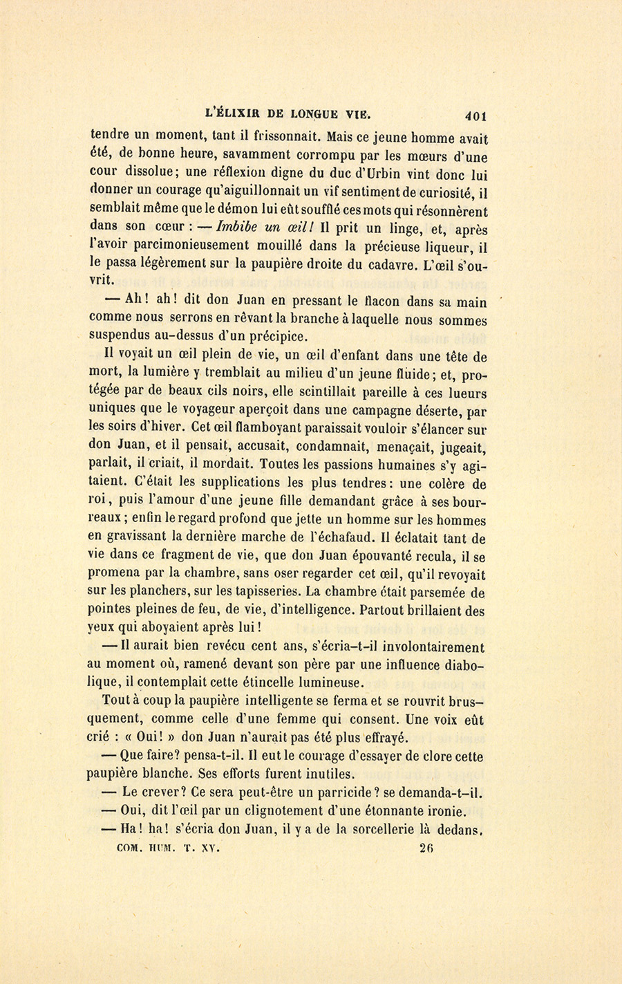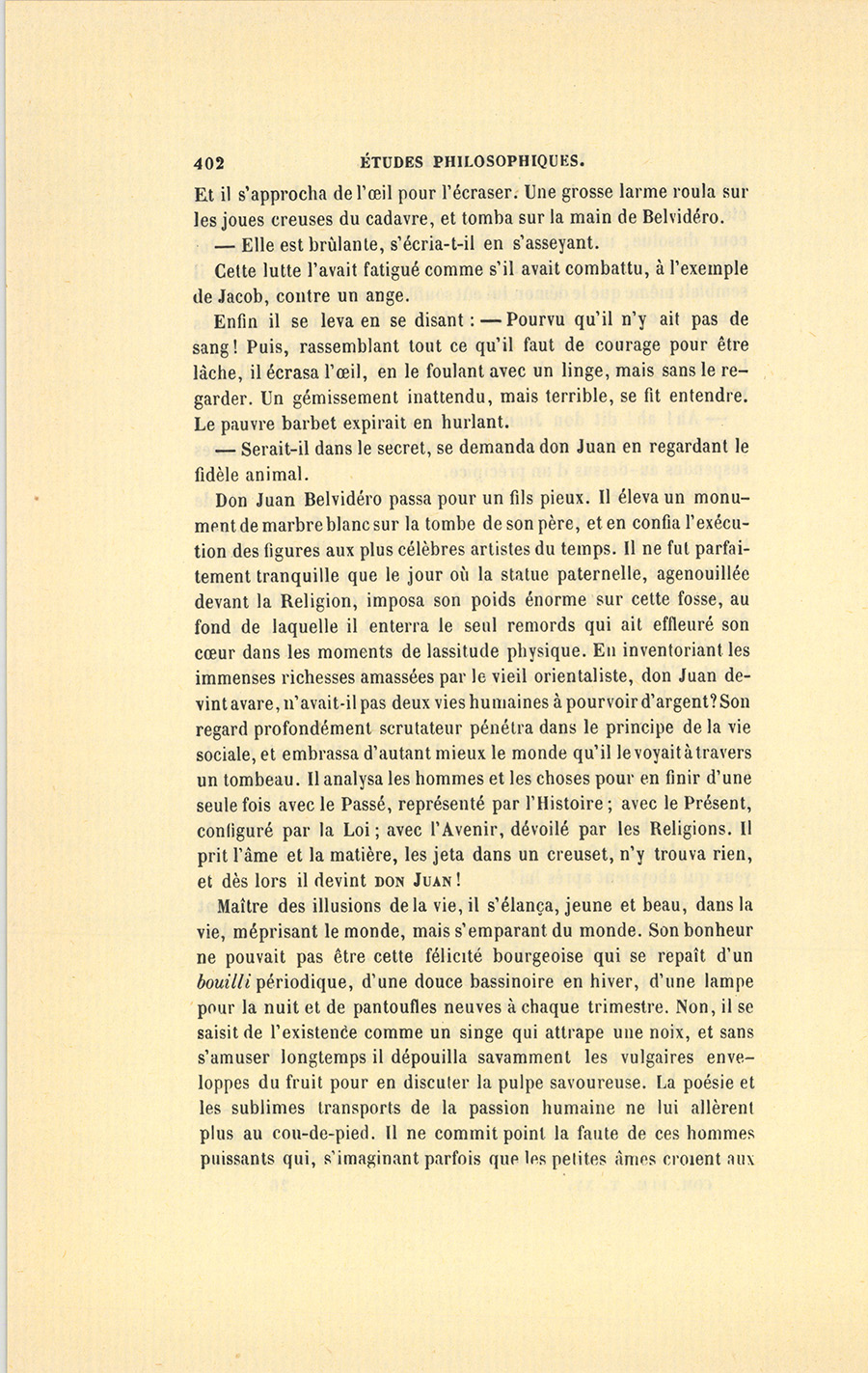 – Ha ! ha ! s’écria don Juan, il y a de la sorcellerie là-dedans5. {p. 402} Et il s’approcha de l’œil pour l’écraser. Une grosse larme roula sur les joues creuses du cadavre, et tomba sur la main de Belvidéro.