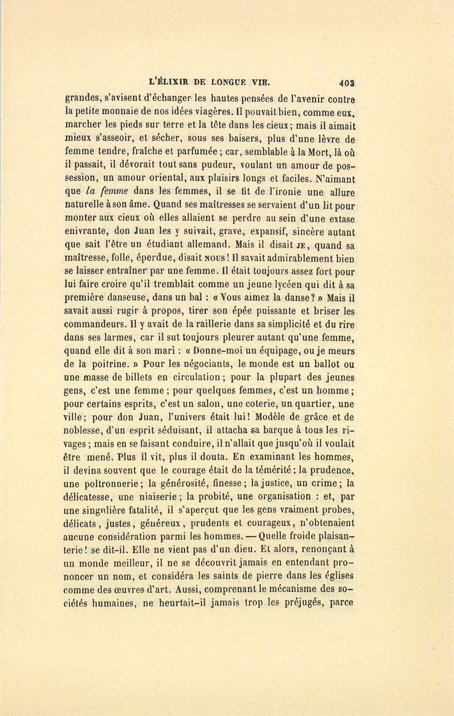 Les sept courtisanes de Ferrare, les amis de don Juan et le prince lui-même jetèrent un cri d’horreur. Deux cents ans après et sous Louis XV, les gens de bon goût eussent ri de cette saillie. Mais peut-être aussi, dans le commencement d’une orgie, les âmes avaient-elles encore trop de lucidité ? Malgré le feu des bougies, le cri des passions, l’aspect des vases d’or et d’argent, la fumée des vins, {p. 394} malgré la contemplation des femmes les plus ravissantes, peut-être y avait-il encore, au fond des cœurs, un peu de cette vergogne pour les choses humaines et divines qui lutte jusqu’à ce que l’orgie l’ait noyée dans les derniers flots d’un vin pétillant ? Déjà néanmoins les fleurs avaient été froissées, les yeux s’hébétaient, et l’ivresse gagnait, selon l’expression de Rabelais, jusqu’aux sandales. En ce moment de silence, une porte s’ouvrit ; et, comme au festin de Balthazar, Dieu se fit reconnaître, il apparut sous les traits d’un vieux domestique en cheveux blancs, à la démarche tremblante, aux sourcils contractés ; il entra d’un air triste, flétrit d’un regard les couronnes, les coupes de vermeil, les pyramides de fruits, l’éclat de la fête, la pourpre des visages étonnés et les couleurs des coussins foulés par le bras blanc des femmes ; enfin, il mit un crêpe à cette folie en disant ces sombres paroles d’une voix creuse : – Monsieur, votre père se meurt3.