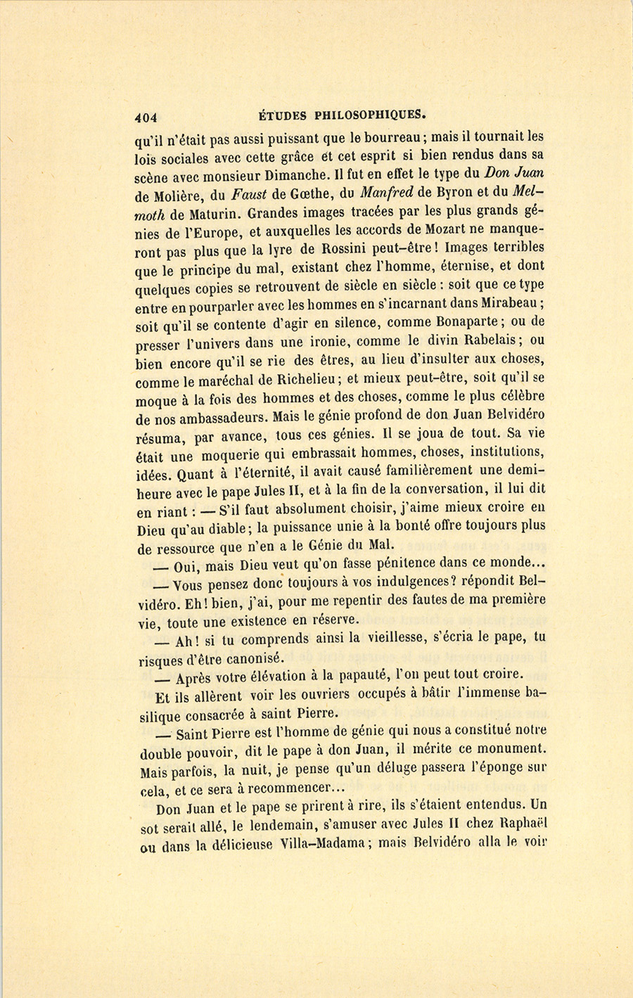 Don Juan et le pape se prirent à rire, ils s’étaient entendus. Un sot serait allé, le lendemain, s’amuser avec Jules II chez Raphaël ou dans la délicieuse Villa-Madama ; mais Belvidéro alla le voir {p. 405} officier pontificalement, afin de se convaincre de ses doutes. Dans une débauche, La Rovère aurait pu se démentir et commenter l’Apocalypse.