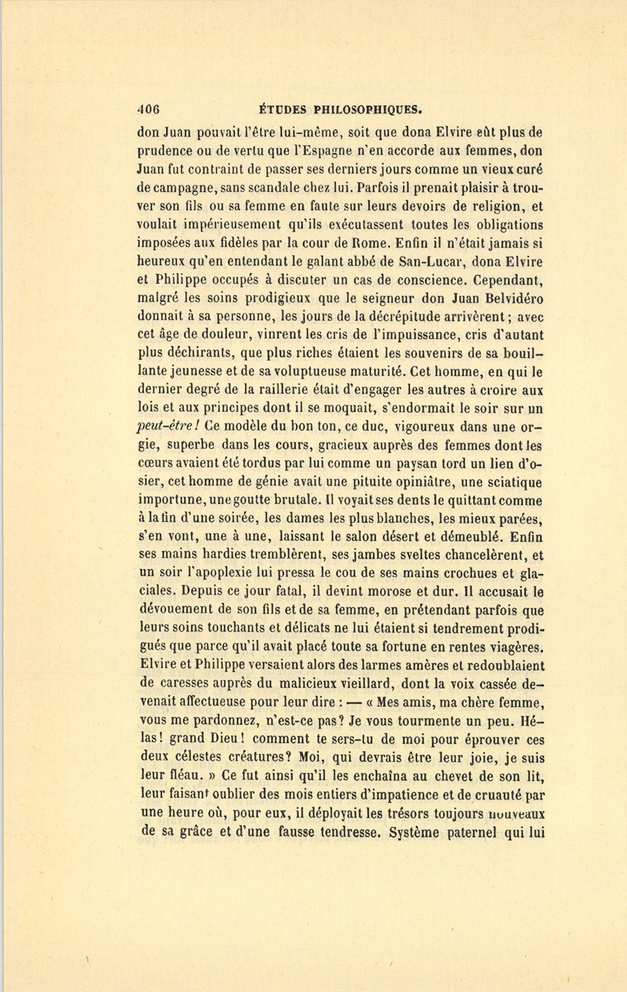 Don Juan Belvidéro passa pour un fils pieux. Il éleva un monument de marbre blanc sur la tombe de son père, et en confia l’exécution des figures aux plus célèbres artistes du temps. Il ne fut parfaitement tranquille que le jour où la statue paternelle, agenouillée devant la Religion, imposa son poids énorme sur cette fosse, au fond de laquelle il enterra le seul remords qui ait effleuré son cœur dans les moments de lassitude physique. En inventoriant les immenses richesses amassées par le vieil orientaliste, don Juan devint avare, n’avait-il pas deux vies humaines à pourvoir d’argent ? Son regard profondément scrutateur pénétra dans le principe de la vie sociale, et embrassa d’autant mieux le monde qu’il le voyait à travers un tombeau. Il analysa les hommes et les choses pour en finir d’une seule fois avec le Passé, représenté par l’Histoire ; avec le Présent, configuré par la Loi ; avec l’Avenir, dévoilé par les Religions. Il prit l’âme et la matière, les jeta dans un creuset, n’y trouva rien, et dès lors il devint don Juan !