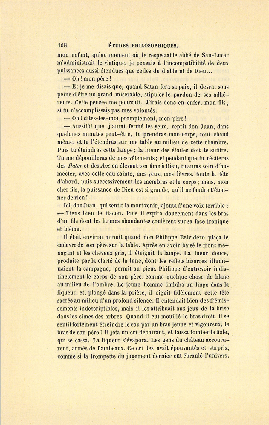 – Tu méritais un autre père, reprit don Juan. J’ose t’avouer, {p. 408} mon enfant, qu’au moment où le respectable abbé de San-Lucar m’administrait le viatique, je pensais à l’incompatibilité de deux puissances aussi étendues que celles du diable et de Dieu…