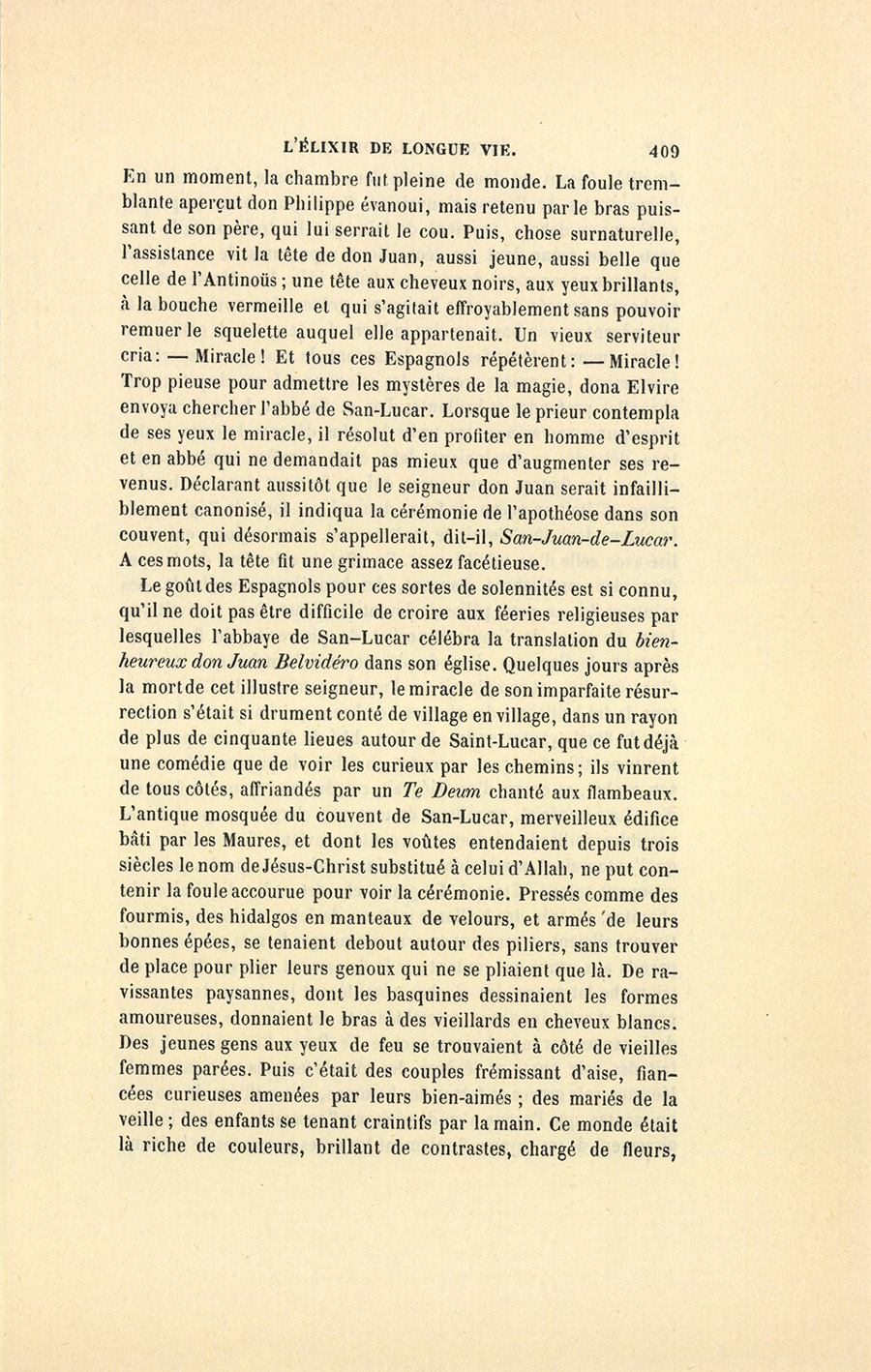 Il était environ minuit quand don Philippe Belvidéro plaça le cadavre de son père sur la table. Après en avoir baisé le front menaçant et les cheveux gris, il éteignit la lampe. La lueur douce, produite par la clarté de la lune, dont les reflets bizarres illuminaient la campagne, permit au pieux Philippe d’entrevoir indistinctement le corps de son père, comme quelque chose de blanc au milieu de l’ombre. Le jeune homme imbiba un linge dans la liqueur, et, plongé dans la prière, il oignit fidèlement cette tête sacrée au milieu d’un profond silence. Il entendait bien des frémissements indescriptibles, mais il les attribuait aux jeux de la brise dans les cimes des arbres. Quand il eut mouillé le bras droit, il se sentit fortement étreindre le cou par un bras jeune et vigoureux, le bras de son père ! Il jeta un cri déchirant, et laissa tomber la fiole, qui se cassa. La liqueur s’évapora. Les gens du château accoururent, armés de flambeaux. Ce cri les avait épouvantés et surpris, comme si la trompette du jugement dernier eût ébranlé l’univers. {p. 409} En un moment, la chambre fut pleine de monde. La foule tremblante aperçut don Philippe évanoui, mais retenu par le bras puissant de son père, qui lui serrait le cou. Puis, chose surnaturelle, l’assistance vit la tête de don Juan, aussi jeune, aussi belle que celle de l’Antinoüs ; une tête aux cheveux noirs, aux yeux brillants, à la bouche vermeille et qui s’agitait effroyablement sans pouvoir remuer le squelette auquel elle appartenait. Un vieux serviteur cria : – Miracle ! Et tous ces Espagnols répétèrent : – Miracle ! Trop pieuse pour admettre les mystères de la magie, dona Elvire envoya chercher l’abbé de San-Lucar. Lorsque le prieur contempla de ses yeux le miracle, il résolut d’en profiter en homme d’esprit et en abbé qui ne demandait pas mieux que d’augmenter ses revenus. Déclarant aussitôt que le seigneur don Juan serait infailliblement canonisé, il indiqua la cérémonie de l’apothéose dans son couvent, qui désormais s’appellerait, dit-il, San-Juan-de-Lucar. À ces mots, la tête fit une grimace assez facétieuse.