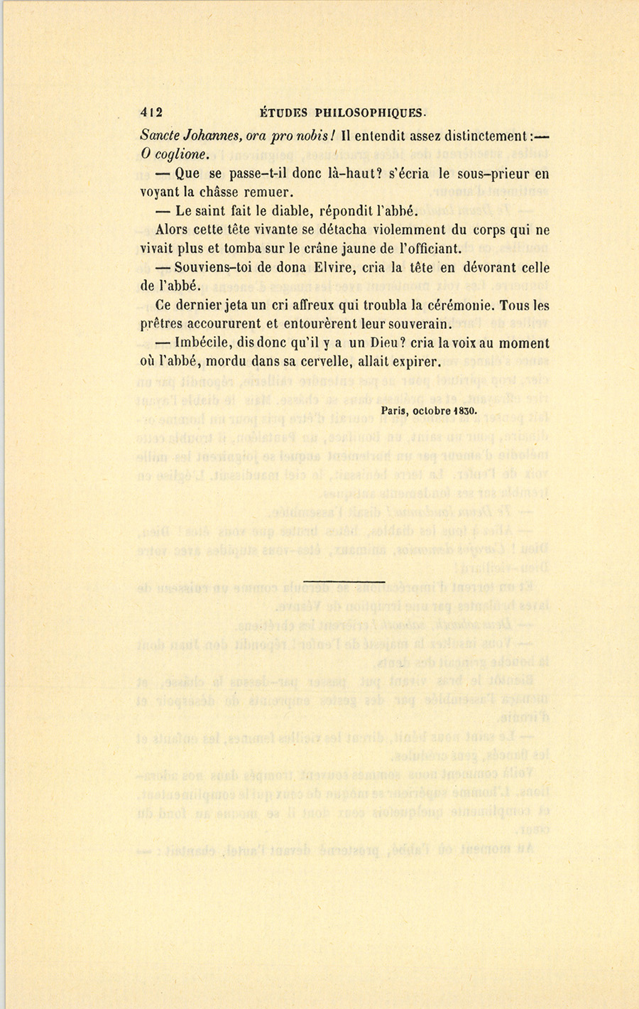 Au moment où l’abbé, prosterné devant l’autel, chantait : {p. 412} – Sancte Johannes, ora pro nobis ! Il entendit assez distinctement : – O coglione.