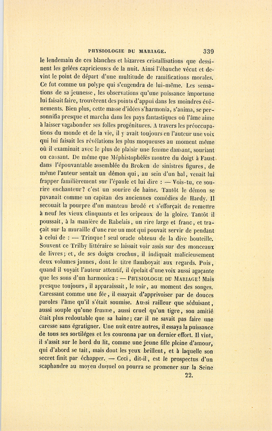 Il s’amusa de ce petit pamphlet conjugal et passa délicieusement une semaine entière à grouper autour de cette innocente épigramme la multitude d’idées qu’il avait acquises à son insu et qu’il s’étonna de trouver en lui. Ce badinage tomba devant une observation magistrale. Docile aux avis, l’auteur se rejeta dans l’insouciance de ses habitudes paresseuses. Néanmoins ce léger principe de science et de plaisanterie se perfectionna tout seul dans les champs de la pensée : chaque phrase de l’œuvre condamnée y prit racine, et s’y fortifia, restant comme une petite branche d’arbre qui, abandonnée sur le sable par une soirée d’hiver, se trouve couverte {p. 339} le lendemain de ces blanches et bizarres cristallisations que dessinent les gelées capricieuses de la nuit. Ainsi l’ébauche vécut et devint le point de départ d’une multitude de ramifications morales. Ce fut comme un polype qui s’engendra de lui-même. Les sensations de sa jeunesse, les observations qu’une puissance importune lui faisait faire, trouvèrent des points d’appui dans les moindres événements. Bien plus, cette masse d’idées s’harmonia, s’anima, se personnifia presque et marcha dans les pays fantastiques où l’âme aime à laisser vagabonder ses folles progénitures. À travers les préoccupations du monde et de la vie, il y avait toujours en l’auteur une voix qui lui faisait les révélations les plus moqueuses au moment même où il examinait avec le plus de plaisir une femme dansant, souriant ou causant. De même que Méphistophélès montre du doigt à Faust dans l’épouvantable assemblée du Broken de sinistres figures, de même l’auteur sentait un démon qui, au sein d’un bal, venait lui frapper familièrement sur l’épaule et lui dire : – Vois-tu, ce sourire enchanteur ? c’est un sourire de haine. Tantôt le démon se pavanait comme un capitan des anciennes comédies de Hardy. Il secouait la pourpre d’un manteau brodé et s’efforçait de remettre à neuf les vieux clinquants et les oripeaux de la gloire. Tantôt il poussait, à la manière de Rabelais, un rire large et franc, et traçait sur la muraille d’une rue un mot qui pouvait servir de pendant à celui de : – Trinque ! seul oracle obtenu de la dive bouteille. Souvent ce Trilby littéraire se laissait voir assis sur des monceaux de livres ; et, de ses doigts crochus, il indiquait malicieusement deux volumes jaunes, dont le titre flamboyait aux regards. Puis, quand il voyait l’auteur attentif, il épelait d’une voix aussi agaçante que les sons d’un harmonica : – Physiologie du Mariage ! Mais presque toujours, il apparaissait, le soir, au moment des songes. Caressant comme une fée, il essayait d’apprivoiser par de douces paroles l’âme qu’il s’était soumise. Aussi railleur que séduisant, aussi souple qu’une femme, aussi cruel qu’un tigre, son amitié était plus redoutable que sa haine ; car il ne savait pas faire une caresse sans égratigner. Une nuit entre autres, il essaya la puissance de tous ses sortiléges et les couronna par un dernier effort. Il vint, il s’assit sur le bord du lit, comme une jeune fille pleine d’amour, qui d’abord se tait, mais dont les yeux brillent, et à laquelle son secret finit par échapper. – Ceci, dit-il, est le prospectus d’un scaphandre au moyen duquel on pourra se promener sur la Seine {p. 340} à pied sec. Cet autre volume est le rapport de l’Institut sur un vêtement propre à nous faire traverser les flammes sans nous brûler. Ne proposeras-tu donc rien qui puisse préserver le mariage des malheurs du froid et du chaud ? Mais, écoute ? Voici l’art de conserver les substances alimentaires, l’art d’empêcher les cheminées de fumer, l’art de faire de bons mortiers, l’art de mettre sa cravate, l’art de découper les viandes.