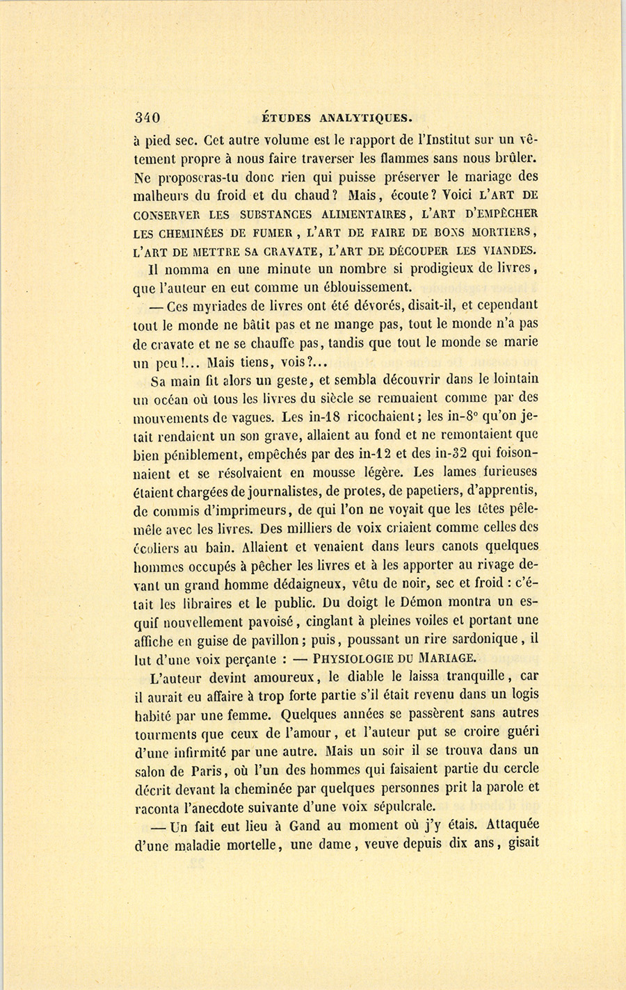 Sa main fit alors un geste, et sembla découvrir dans le lointain un océan où tous les livres du siècle se remuaient comme par des mouvements de vagues. Les in-18 ricochaient ; les in-8º qu’on jetait rendaient un son grave, allaient au fond et ne remontaient que bien péniblement, empêchés par des in-12 et des in-32 qui foisonnaient et se résolvaient en mousse légère. Les lames furieuses étaient chargées de journalistes, de protes, de papetiers, d’apprentis, de commis d’imprimeurs, de qui l’on ne voyait que les têtes pêle-mêle avec les livres. Des milliers de voix criaient comme celles des écoliers au bain. Allaient et venaient dans leurs canots quelques hommes occupés à pêcher les livres et à les apporter au rivage devant un grand homme dédaigneux, vêtu de noir, sec et froid : c’était les libraires et le public. Du doigt le Démon montra un esquif nouvellement pavoisé, cinglant à pleines voiles et portant une affiche en guise de pavillon ; puis, poussant un rire sardonique, il lut d’une voix perçante : – Physiologie du Mariage.