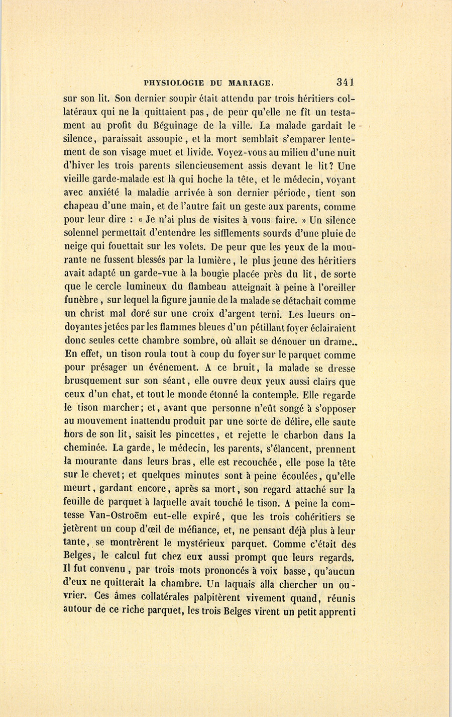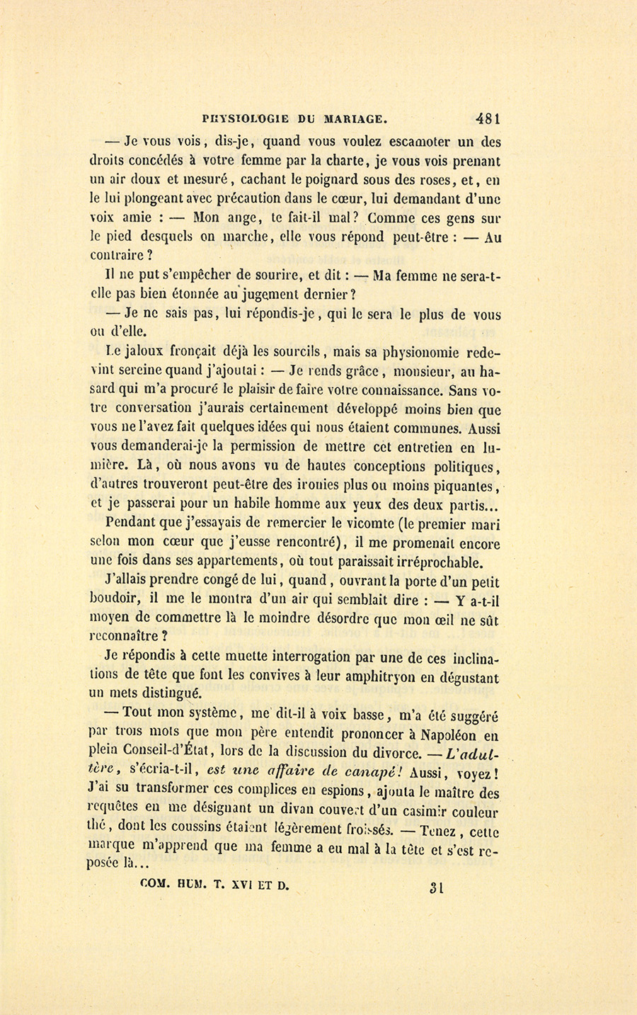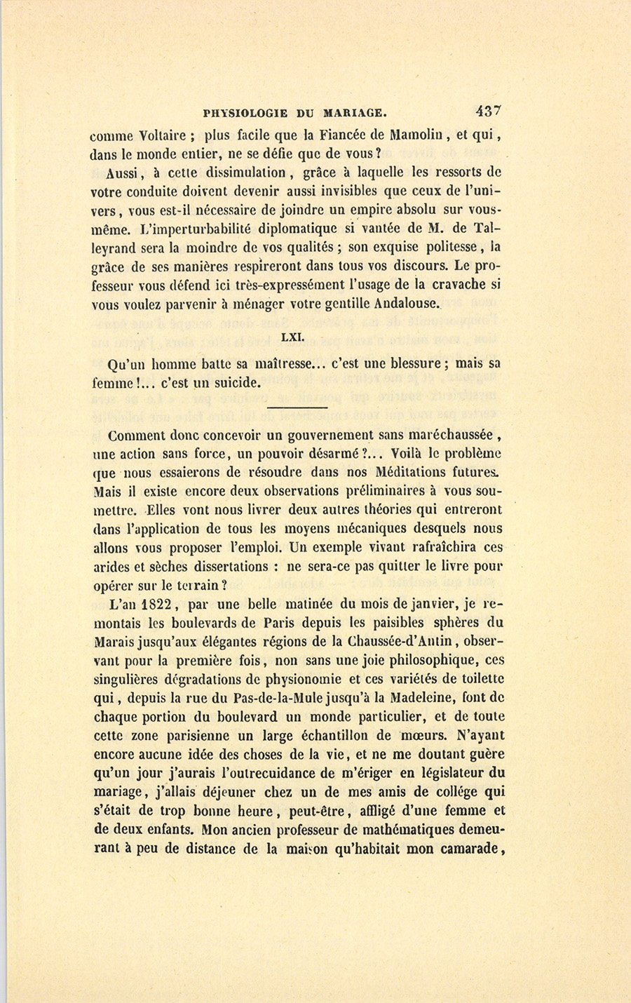{p. 338} Ces paroles, prononcées devant le Conseil-d’État par Napoléon lors de la discussion du Code civil, frappèrent vivement l’auteur de ce livre ; et, peut-être, à son insu, mirent-elles en lui le germe de l’ouvrage qu’il offre aujourd’hui au public. En effet, à l’époque où, beaucoup plus jeune, il étudia le Droit français, le mot adultère lui causa de singulières impressions. Immense dans le code, jamais ce mot n’apparaissait à son imagination sans traîner à sa suite un lugubre cortége. Les Larmes, la Honte, la Haine, la Terreur, des Crimes secrets, de sanglantes Guerres, des Familles sans chef, le Malheur se personnifiaient devant lui et se dressaient soudain quand il lisait le mot sacramentel : adultère ! Plus tard, en abordant les plages les mieux cultivées de la société, l’auteur s’aperçut que la sévérité des lois conjugales y était assez généralement tempérée par l’Adultère. Il trouva la somme des mauvais ménages supérieure de beaucoup à celle des mariages heureux. Enfin il crut remarquer, le premier, que, de toutes les connaissances humaines, celle du Mariage était la moins avancée. Mais ce fut une observation de jeune homme ; et, chez lui comme chez tant d’autres, semblable à une pierre jetée au sein d’un lac, elle se perdit dans le gouffre de ses pensées tumultueuses. Cependant l’auteur observa malgré lui ; puis il se forma lentement dans son imagination, comme un essaim d’idées plus ou moins justes sur la nature des choses conjugales. Les ouvrages se forment peut-être dans les âmes aussi mystérieusement que poussent les truffes au milieu des plaines parfumées du Périgord. De la primitive et sainte frayeur que lui causa l’Adultère et de l’observation qu’il avait étourdiment faite, naquit un matin une minime pensée où ses idées se formulèrent. C’était une raillerie sur le mariage : deux époux s’aimaient pour la première fois après vingt-sept ans de ménage.