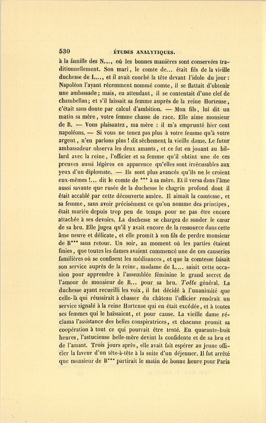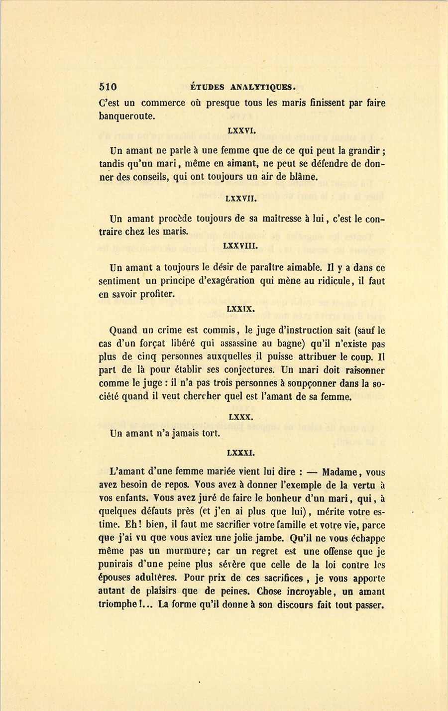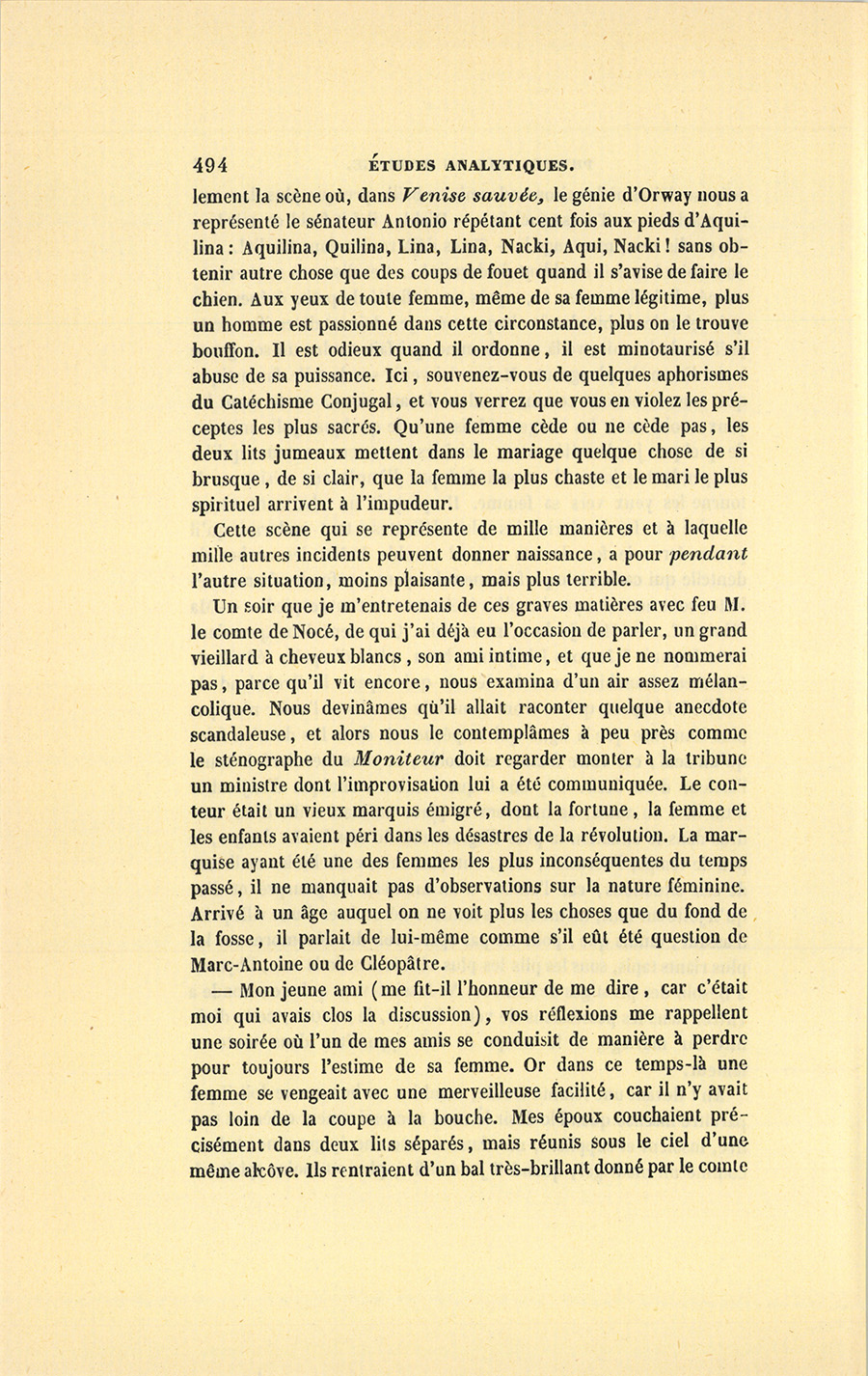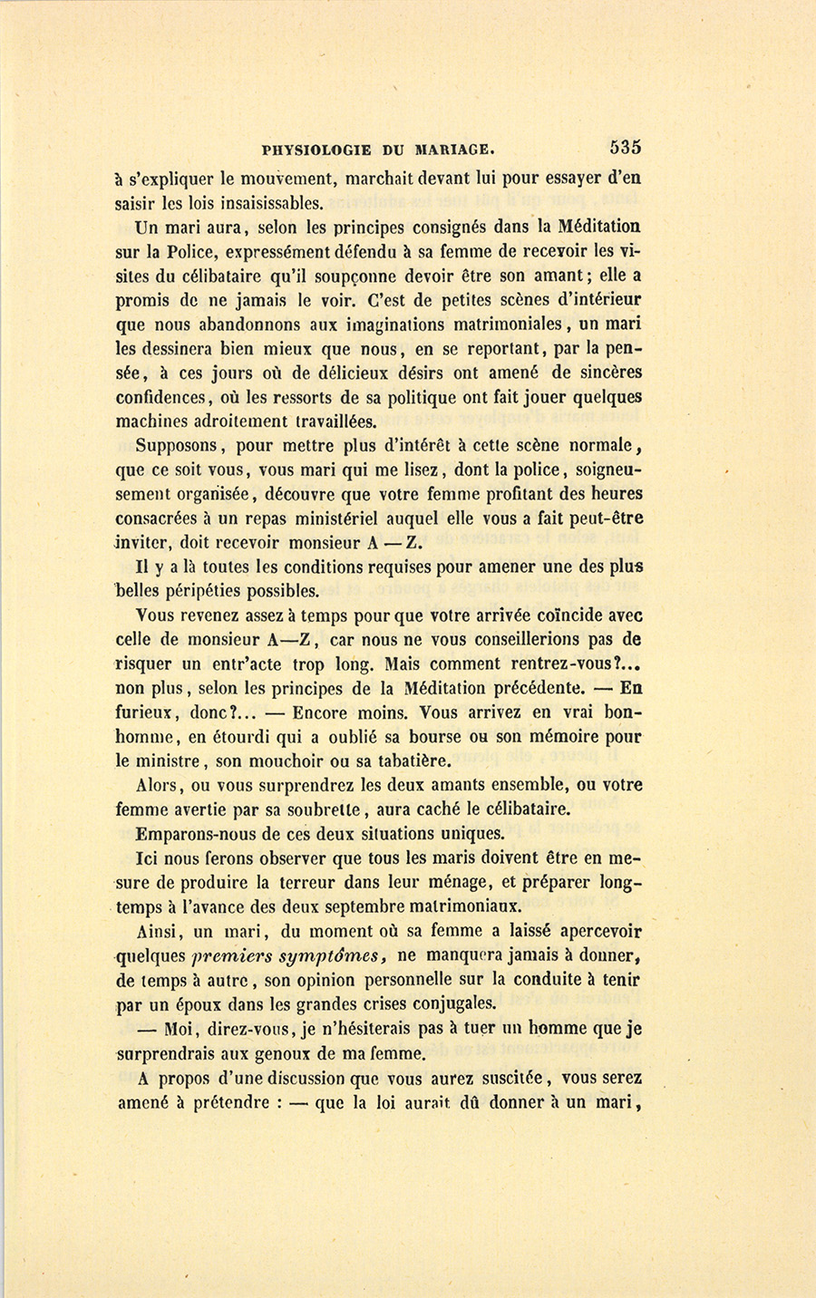 {p. 338} Ces paroles, prononcées devant le Conseil-d’État par Napoléon lors de la discussion du Code civil, frappèrent vivement l’auteur de ce livre ; et, peut-être, à son insu, mirent-elles en lui le germe de l’ouvrage qu’il offre aujourd’hui au public. En effet, à l’époque où, beaucoup plus jeune, il étudia le Droit français, le mot adultère lui causa de singulières impressions. Immense dans le code, jamais ce mot n’apparaissait à son imagination sans traîner à sa suite un lugubre cortége. Les Larmes, la Honte, la Haine, la Terreur, des Crimes secrets, de sanglantes Guerres, des Familles sans chef, le Malheur se personnifiaient devant lui et se dressaient soudain quand il lisait le mot sacramentel : adultère ! Plus tard, en abordant les plages les mieux cultivées de la société, l’auteur s’aperçut que la sévérité des lois conjugales y était assez généralement tempérée par l’Adultère. Il trouva la somme des mauvais ménages supérieure de beaucoup à celle des mariages heureux. Enfin il crut remarquer, le premier, que, de toutes les connaissances humaines, celle du Mariage était la moins avancée. Mais ce fut une observation de jeune homme ; et, chez lui comme chez tant d’autres, semblable à une pierre jetée au sein d’un lac, elle se perdit dans le gouffre de ses pensées tumultueuses. Cependant l’auteur observa malgré lui ; puis il se forma lentement dans son imagination, comme un essaim d’idées plus ou moins justes sur la nature des choses conjugales. Les ouvrages se forment peut-être dans les âmes aussi mystérieusement que poussent les truffes au milieu des plaines parfumées du Périgord. De la primitive et sainte frayeur que lui causa l’Adultère et de l’observation qu’il avait étourdiment faite, naquit un matin une minime pensée où ses idées se formulèrent. C’était une raillerie sur le mariage : deux époux s’aimaient pour la première fois après vingt-sept ans de ménage.