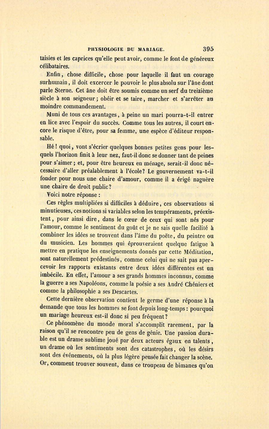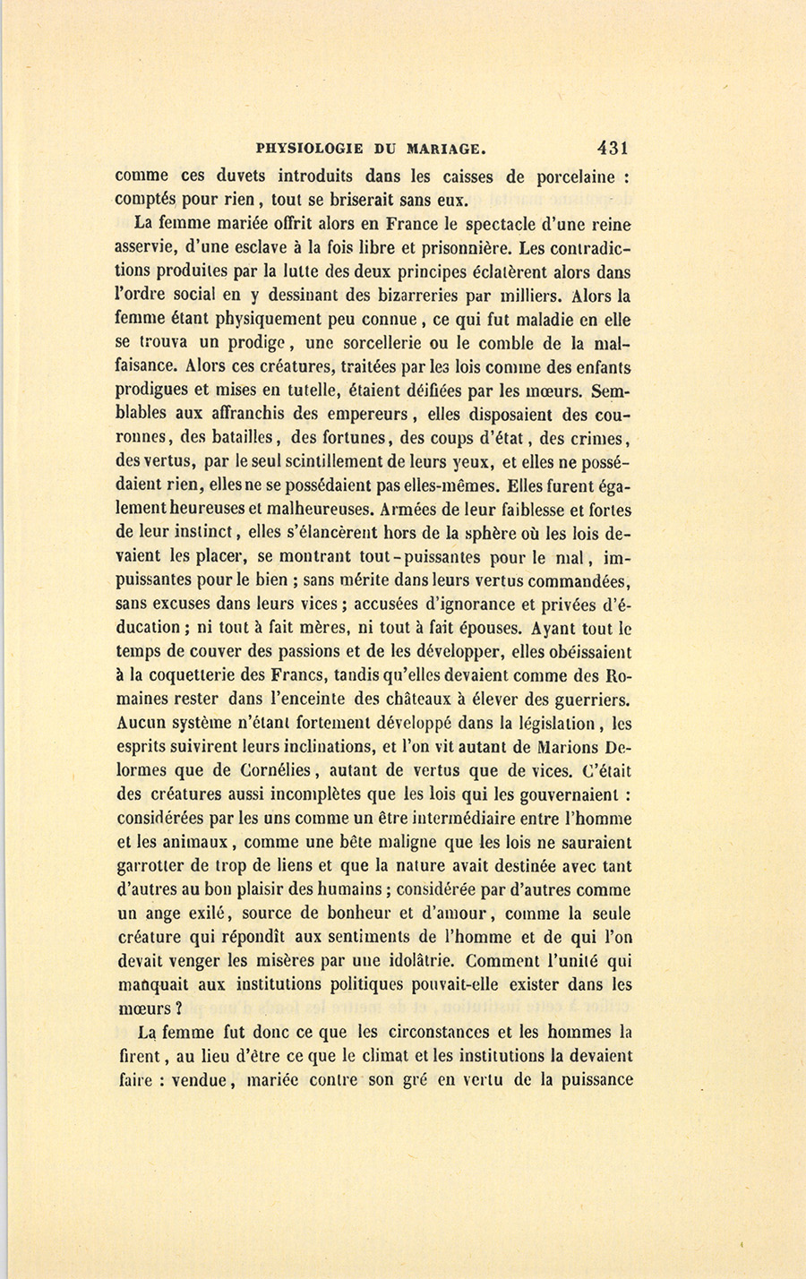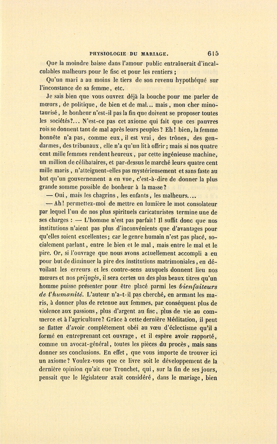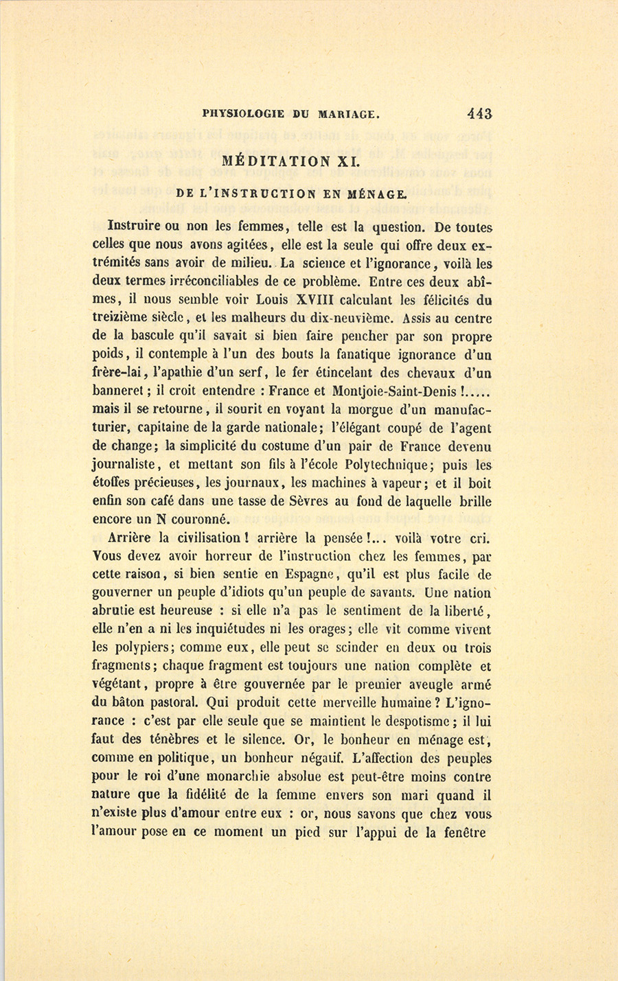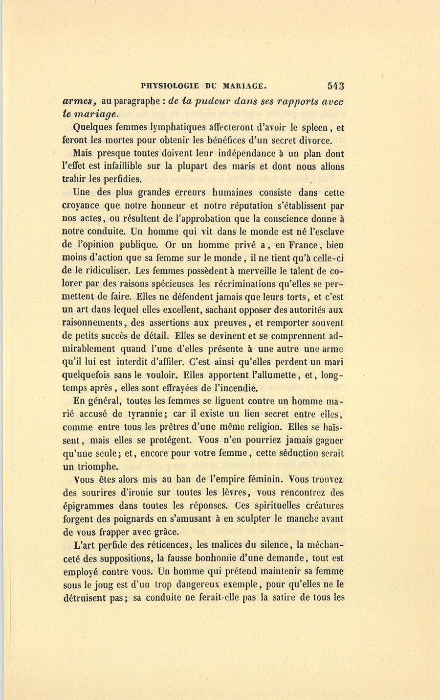 Au dix-neuvième siècle, la Physiologie du Mariage est donc une insignifiante compilation ou l’œuvre d’un niais écrite pour d’autres niais : de vieux prêtres ont pris leurs balances d’or et pesé les moindres scrupules ; de vieux jurisconsultes ont mis leurs lunettes et distingué toutes les espèces ; de vieux médecins ont pris le scalpel et l’ont promené sur toutes les plaies ; de vieux juges ont monté sur leur siége et jugé tous les cas rédhibitoires ; des générations entières ont passé en jetant leur cri de joie ou de douleur ; chaque siècle a lancé son vote dans l’urne ; le Saint-Esprit, les poètes, les écrivains, ont tout enregistré depuis Ève jusqu’à la guerre de Troie, depuis Hélène jusqu’à madame de Maintenon, depuis la femme de Louis XIV jusqu’à la Contemporaine.