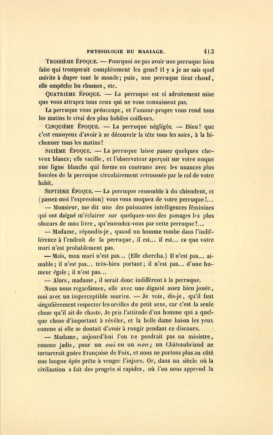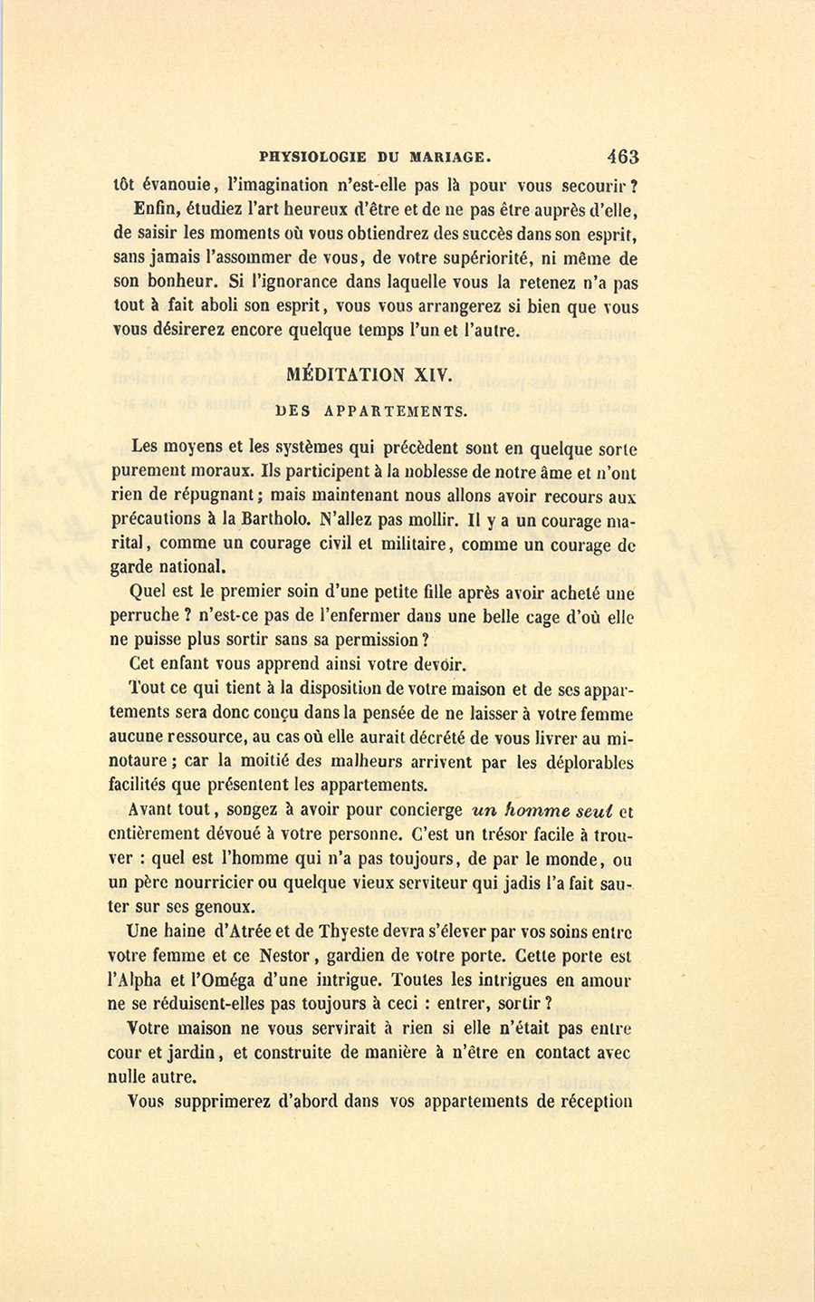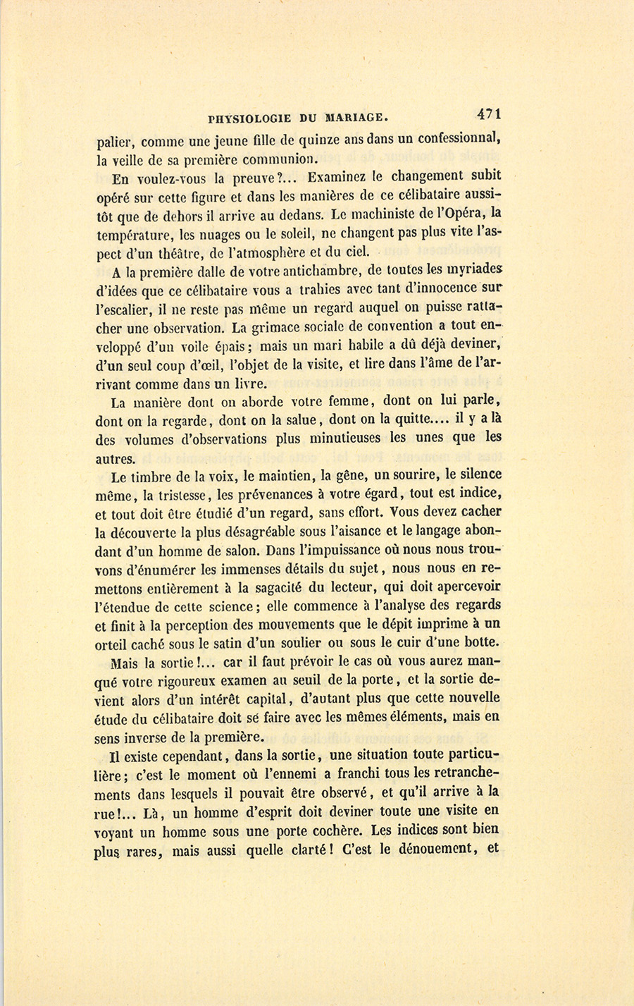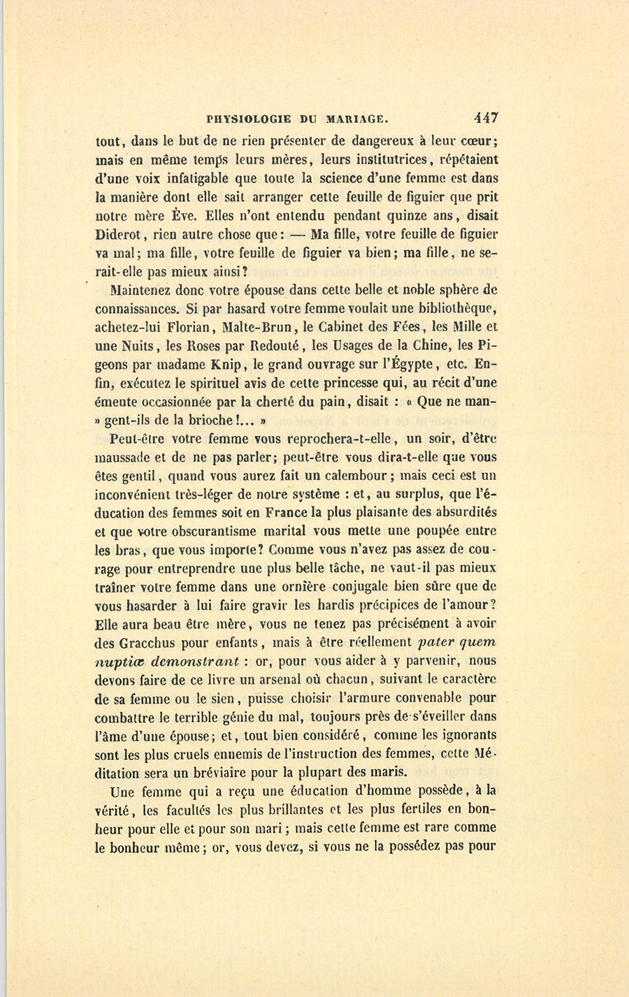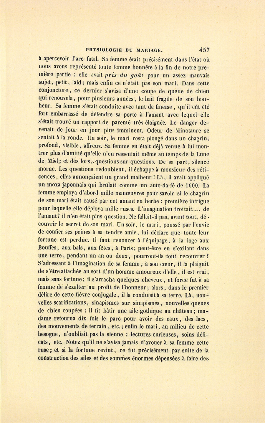 Au dix-neuvième siècle, la Physiologie du Mariage est donc une insignifiante compilation ou l’œuvre d’un niais écrite pour d’autres niais : de vieux prêtres ont pris leurs balances d’or et pesé les moindres scrupules ; de vieux jurisconsultes ont mis leurs lunettes et distingué toutes les espèces ; de vieux médecins ont pris le scalpel et l’ont promené sur toutes les plaies ; de vieux juges ont monté sur leur siége et jugé tous les cas rédhibitoires ; des générations entières ont passé en jetant leur cri de joie ou de douleur ; chaque siècle a lancé son vote dans l’urne ; le Saint-Esprit, les poètes, les écrivains, ont tout enregistré depuis Ève jusqu’à la guerre de Troie, depuis Hélène jusqu’à madame de Maintenon, depuis la femme de Louis XIV jusqu’à la Contemporaine.