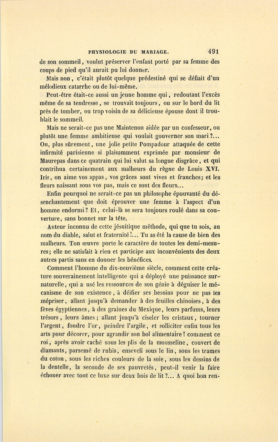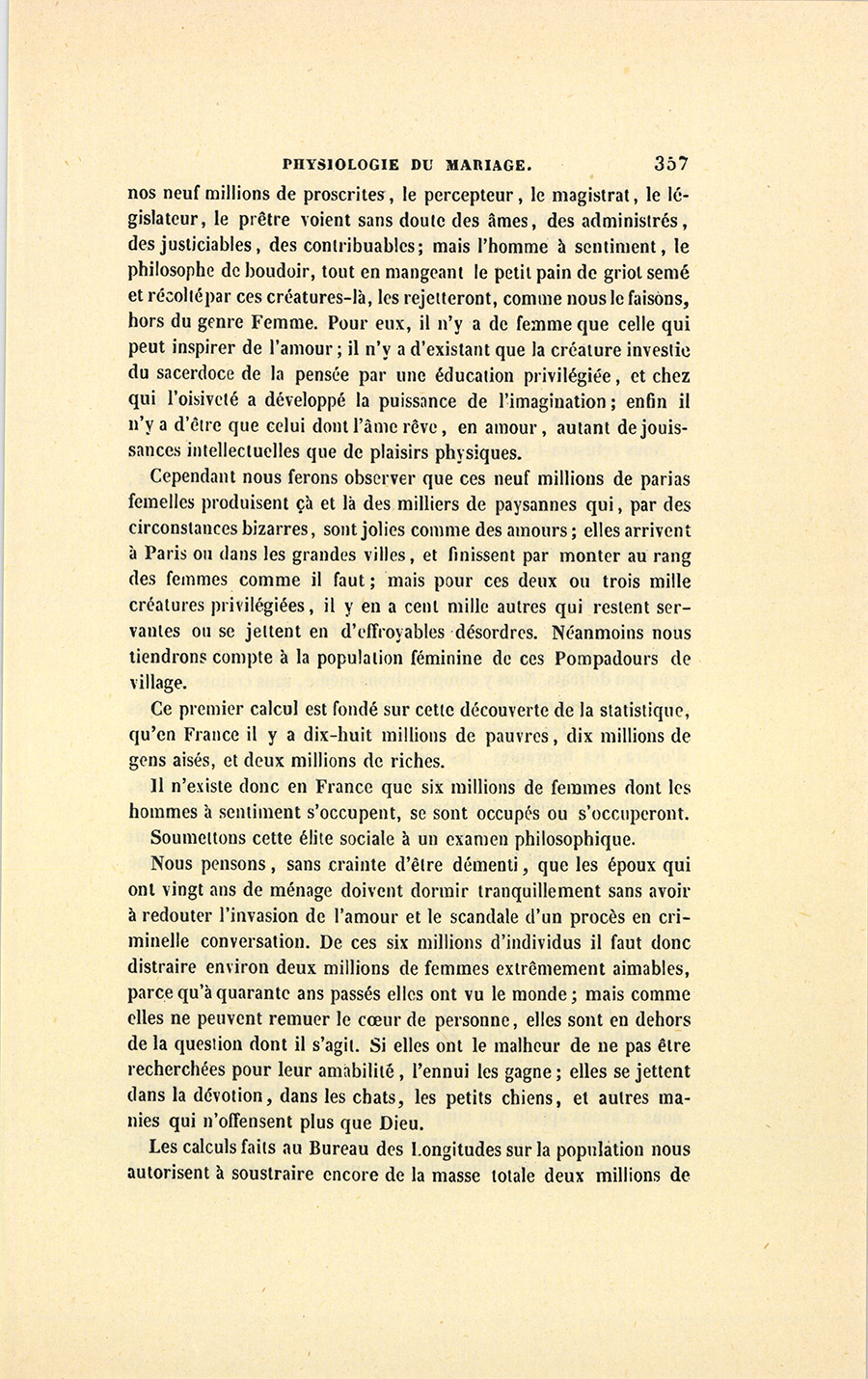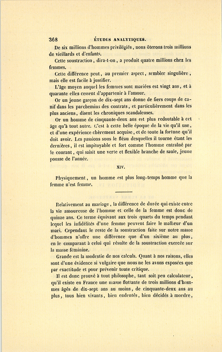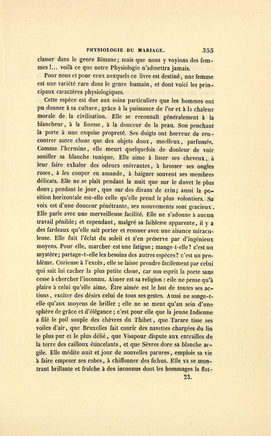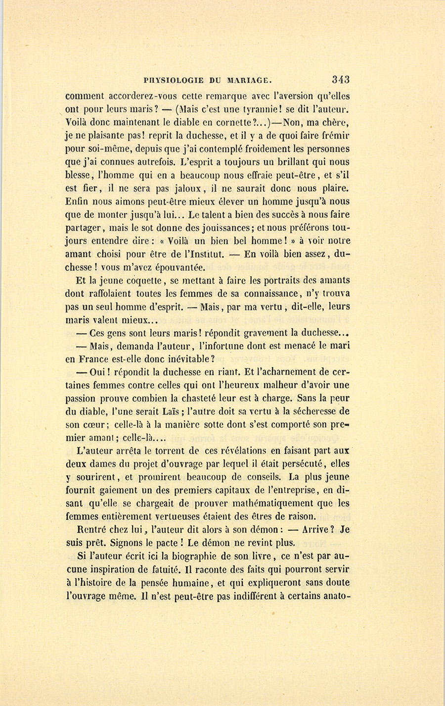 Au dix-neuvième siècle, la Physiologie du Mariage est donc une insignifiante compilation ou l’œuvre d’un niais écrite pour d’autres niais : de vieux prêtres ont pris leurs balances d’or et pesé les moindres scrupules ; de vieux jurisconsultes ont mis leurs lunettes et distingué toutes les espèces ; de vieux médecins ont pris le scalpel et l’ont promené sur toutes les plaies ; de vieux juges ont monté sur leur siége et jugé tous les cas rédhibitoires ; des générations entières ont passé en jetant leur cri de joie ou de douleur ; chaque siècle a lancé son vote dans l’urne ; le Saint-Esprit, les poètes, les écrivains, ont tout enregistré depuis Ève jusqu’à la guerre de Troie, depuis Hélène jusqu’à madame de Maintenon, depuis la femme de Louis XIV jusqu’à la Contemporaine.