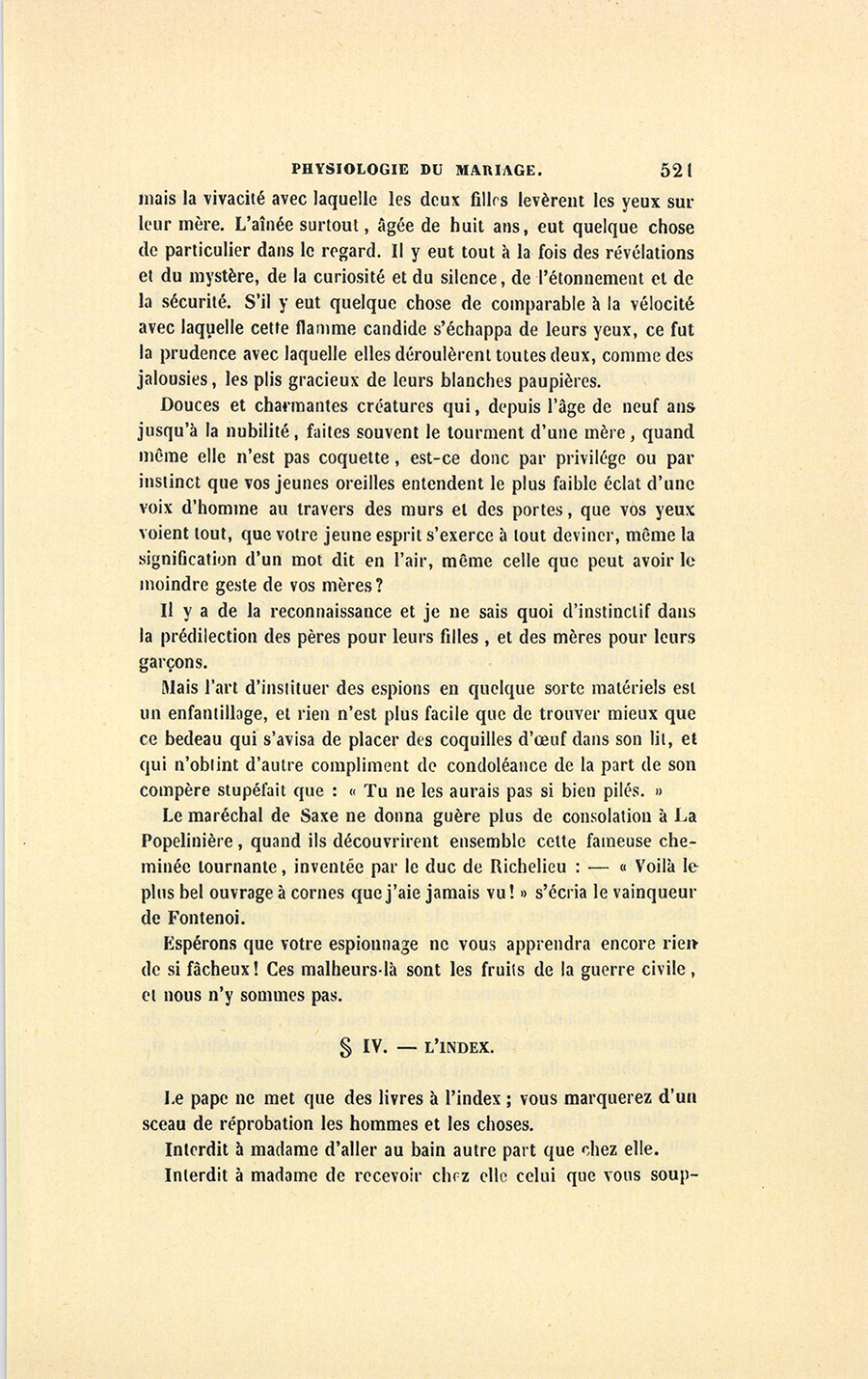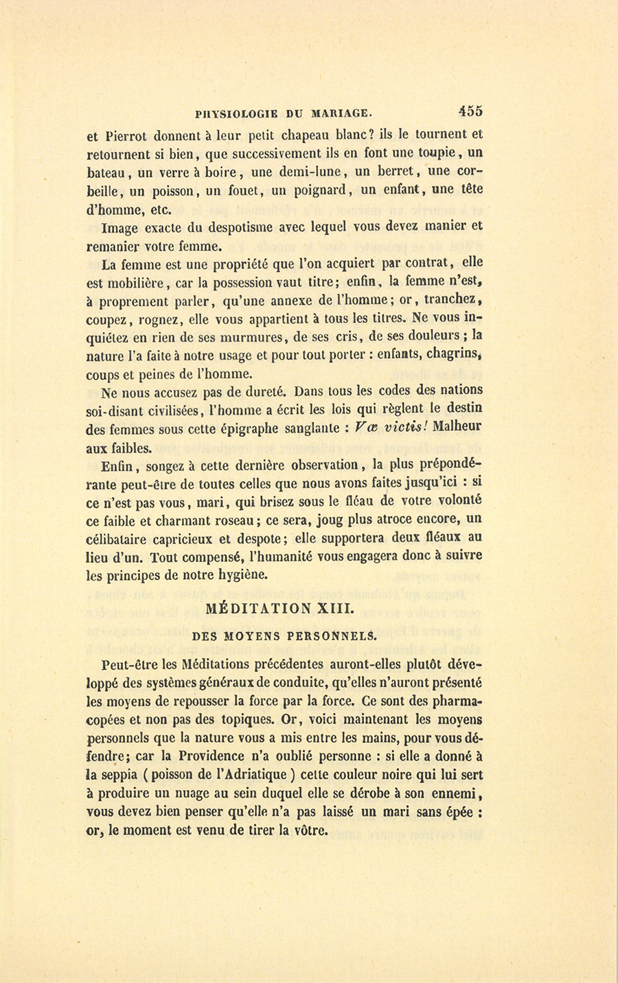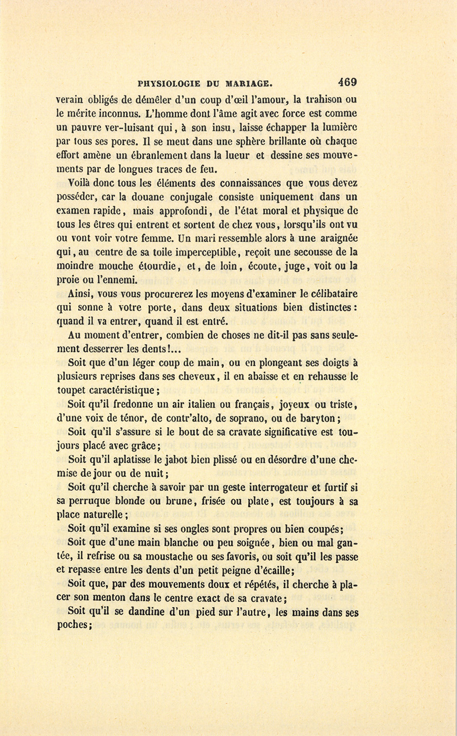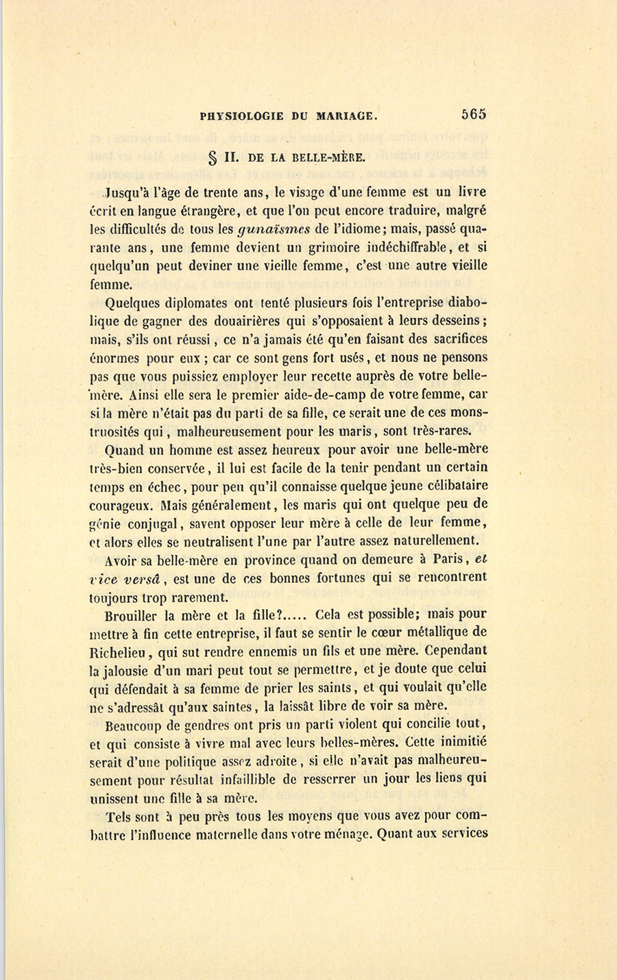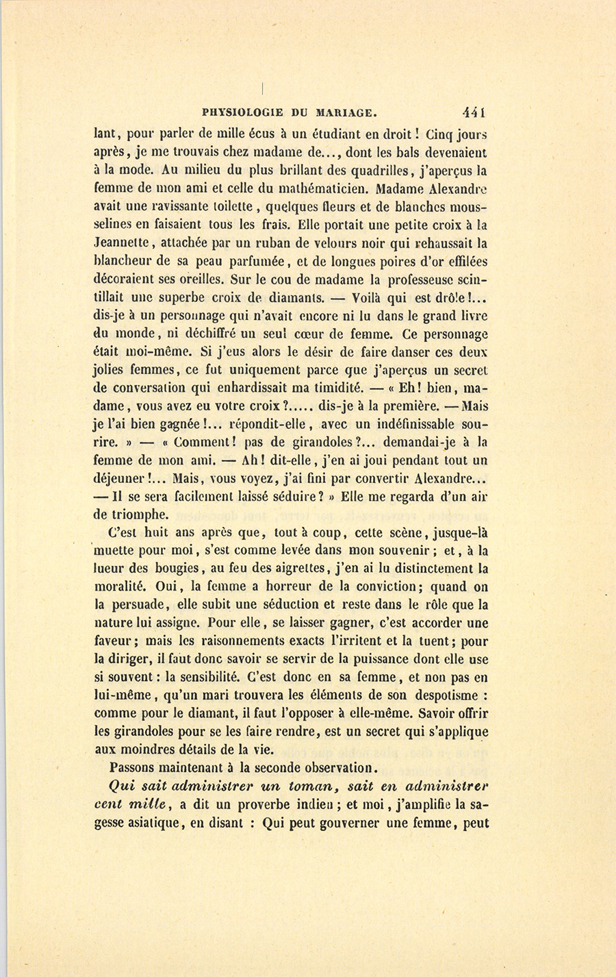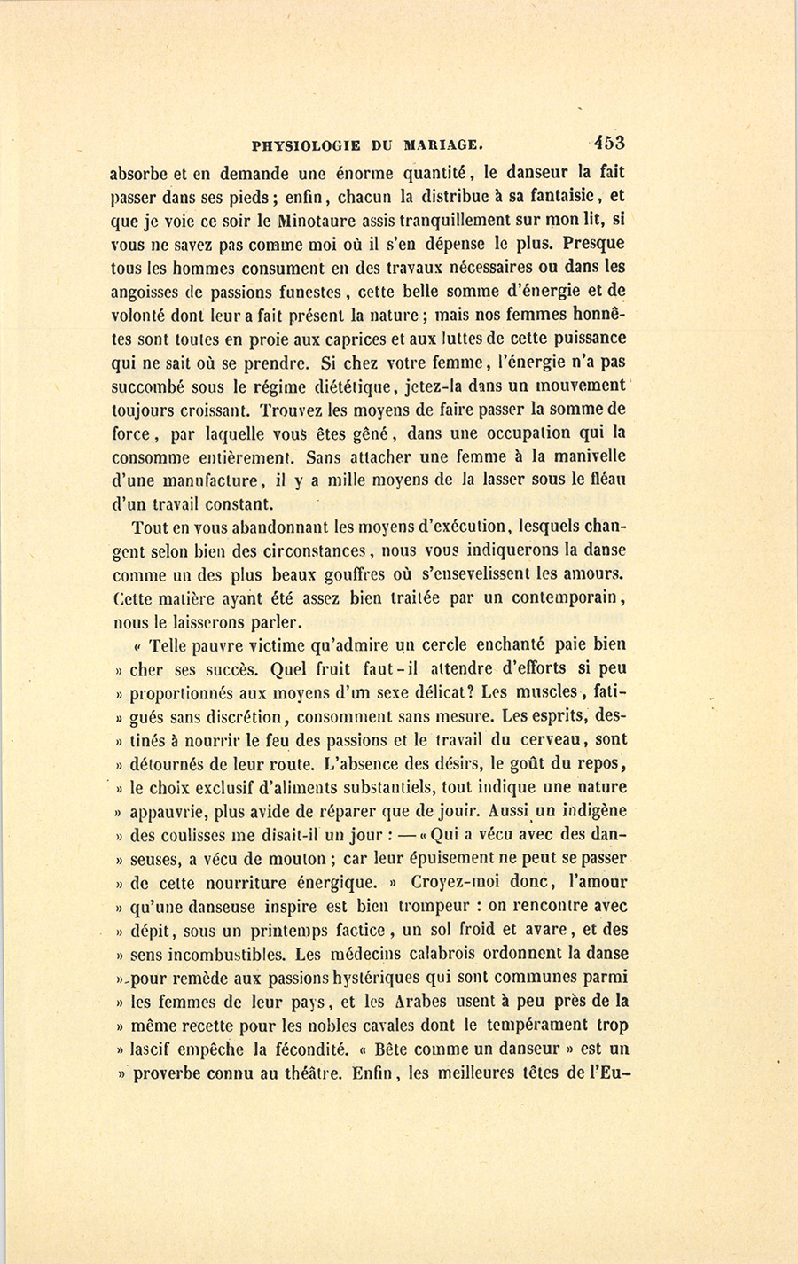 Au dix-neuvième siècle, la Physiologie du Mariage est donc une insignifiante compilation ou l’œuvre d’un niais écrite pour d’autres niais : de vieux prêtres ont pris leurs balances d’or et pesé les moindres scrupules ; de vieux jurisconsultes ont mis leurs lunettes et distingué toutes les espèces ; de vieux médecins ont pris le scalpel et l’ont promené sur toutes les plaies ; de vieux juges ont monté sur leur siége et jugé tous les cas rédhibitoires ; des générations entières ont passé en jetant leur cri de joie ou de douleur ; chaque siècle a lancé son vote dans l’urne ; le Saint-Esprit, les poètes, les écrivains, ont tout enregistré depuis Ève jusqu’à la guerre de Troie, depuis Hélène jusqu’à madame de Maintenon, depuis la femme de Louis XIV jusqu’à la Contemporaine.