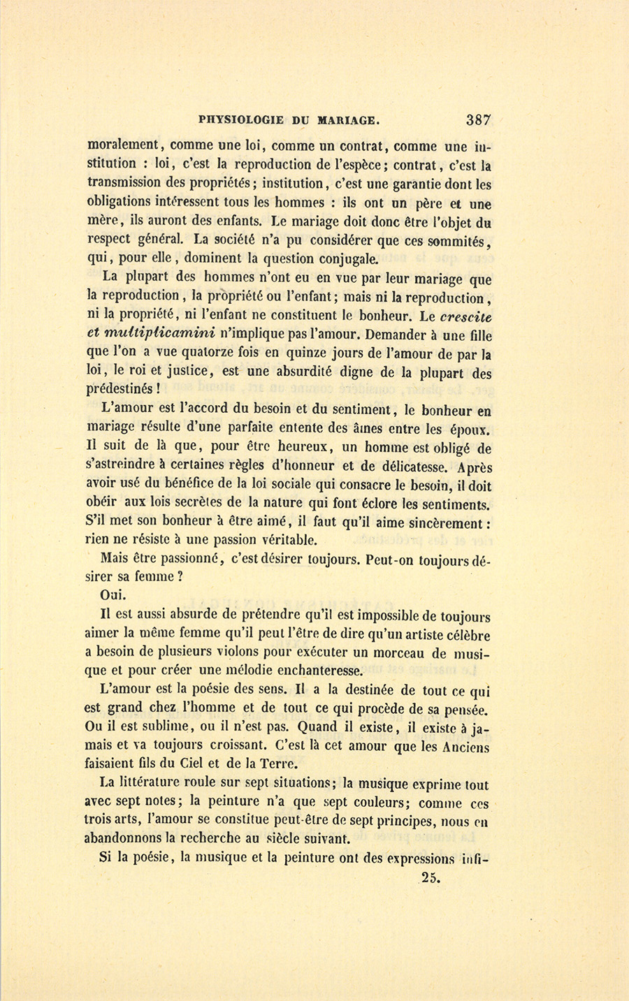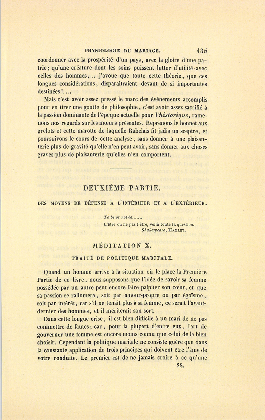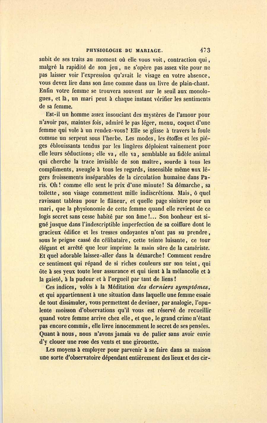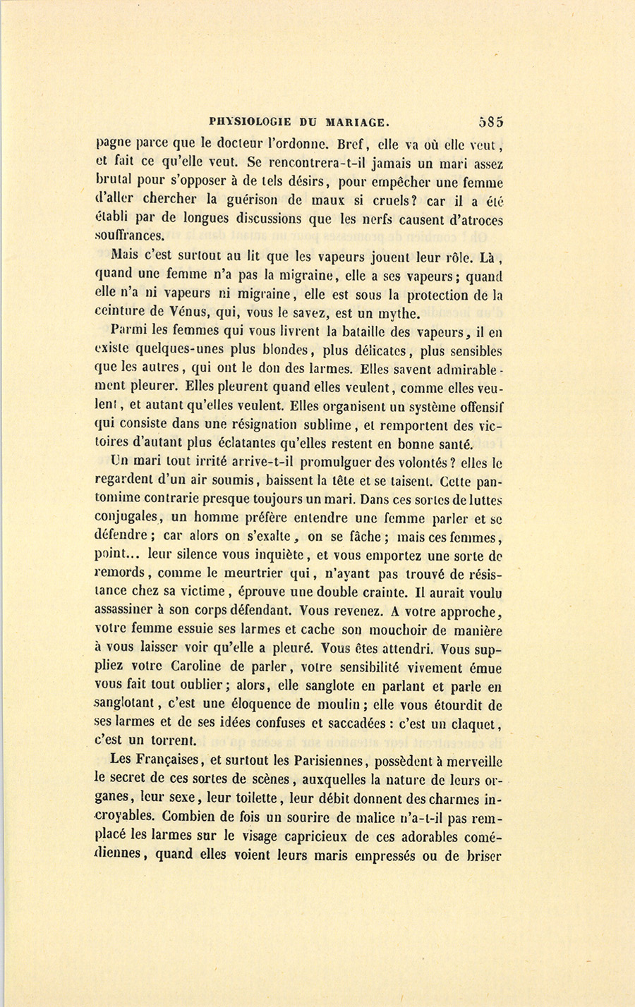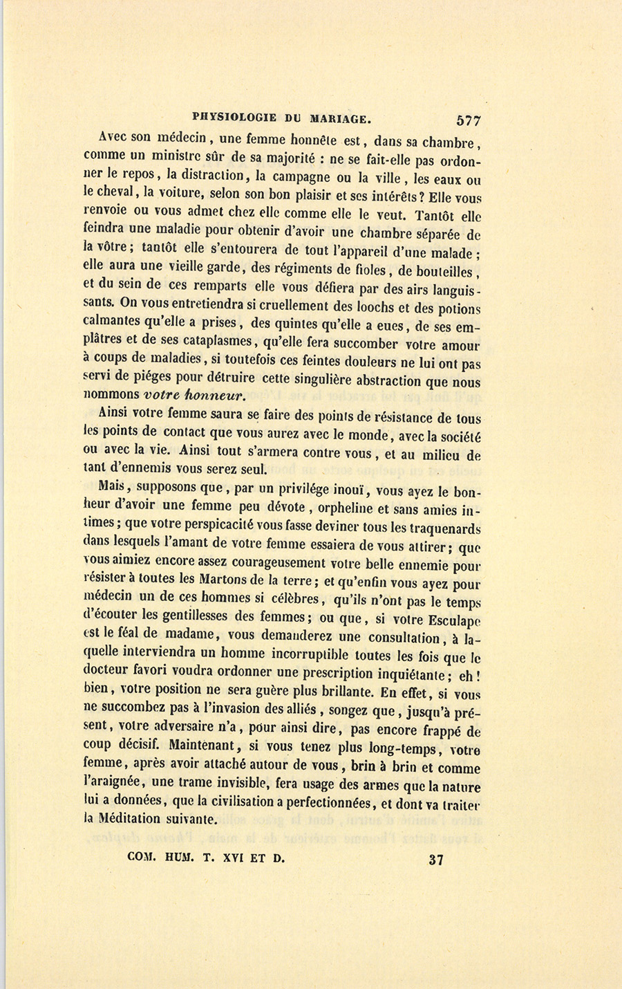 Au dix-neuvième siècle, la Physiologie du Mariage est donc une insignifiante compilation ou l’œuvre d’un niais écrite pour d’autres niais : de vieux prêtres ont pris leurs balances d’or et pesé les moindres scrupules ; de vieux jurisconsultes ont mis leurs lunettes et distingué toutes les espèces ; de vieux médecins ont pris le scalpel et l’ont promené sur toutes les plaies ; de vieux juges ont monté sur leur siége et jugé tous les cas rédhibitoires ; des générations entières ont passé en jetant leur cri de joie ou de douleur ; chaque siècle a lancé son vote dans l’urne ; le Saint-Esprit, les poètes, les écrivains, ont tout enregistré depuis Ève jusqu’à la guerre de Troie, depuis Hélène jusqu’à madame de Maintenon, depuis la femme de Louis XIV jusqu’à la Contemporaine.