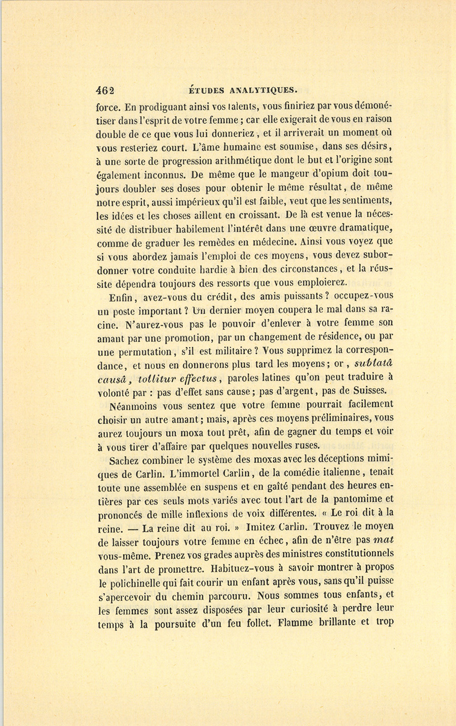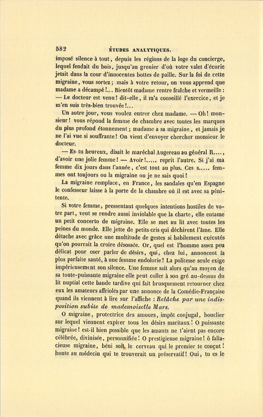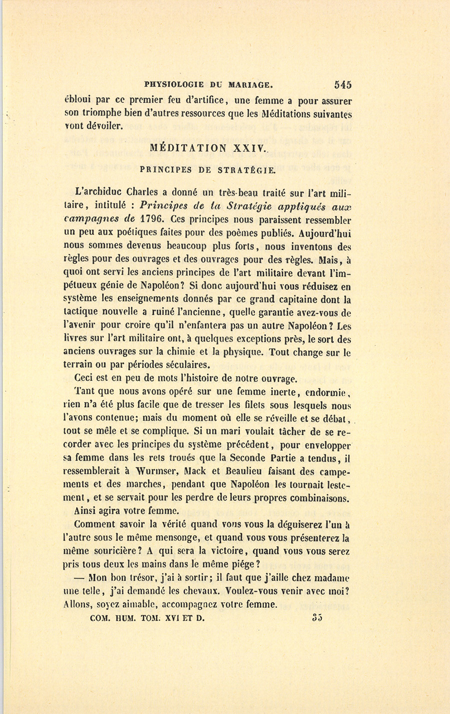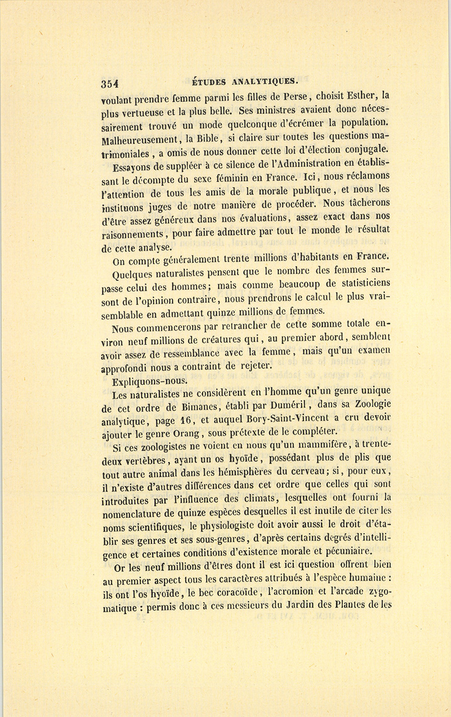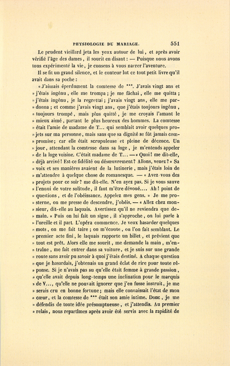 Au dix-neuvième siècle, la Physiologie du Mariage est donc une insignifiante compilation ou l’œuvre d’un niais écrite pour d’autres niais : de vieux prêtres ont pris leurs balances d’or et pesé les moindres scrupules ; de vieux jurisconsultes ont mis leurs lunettes et distingué toutes les espèces ; de vieux médecins ont pris le scalpel et l’ont promené sur toutes les plaies ; de vieux juges ont monté sur leur siége et jugé tous les cas rédhibitoires ; des générations entières ont passé en jetant leur cri de joie ou de douleur ; chaque siècle a lancé son vote dans l’urne ; le Saint-Esprit, les poètes, les écrivains, ont tout enregistré depuis Ève jusqu’à la guerre de Troie, depuis Hélène jusqu’à madame de Maintenon, depuis la femme de Louis XIV jusqu’à la Contemporaine.